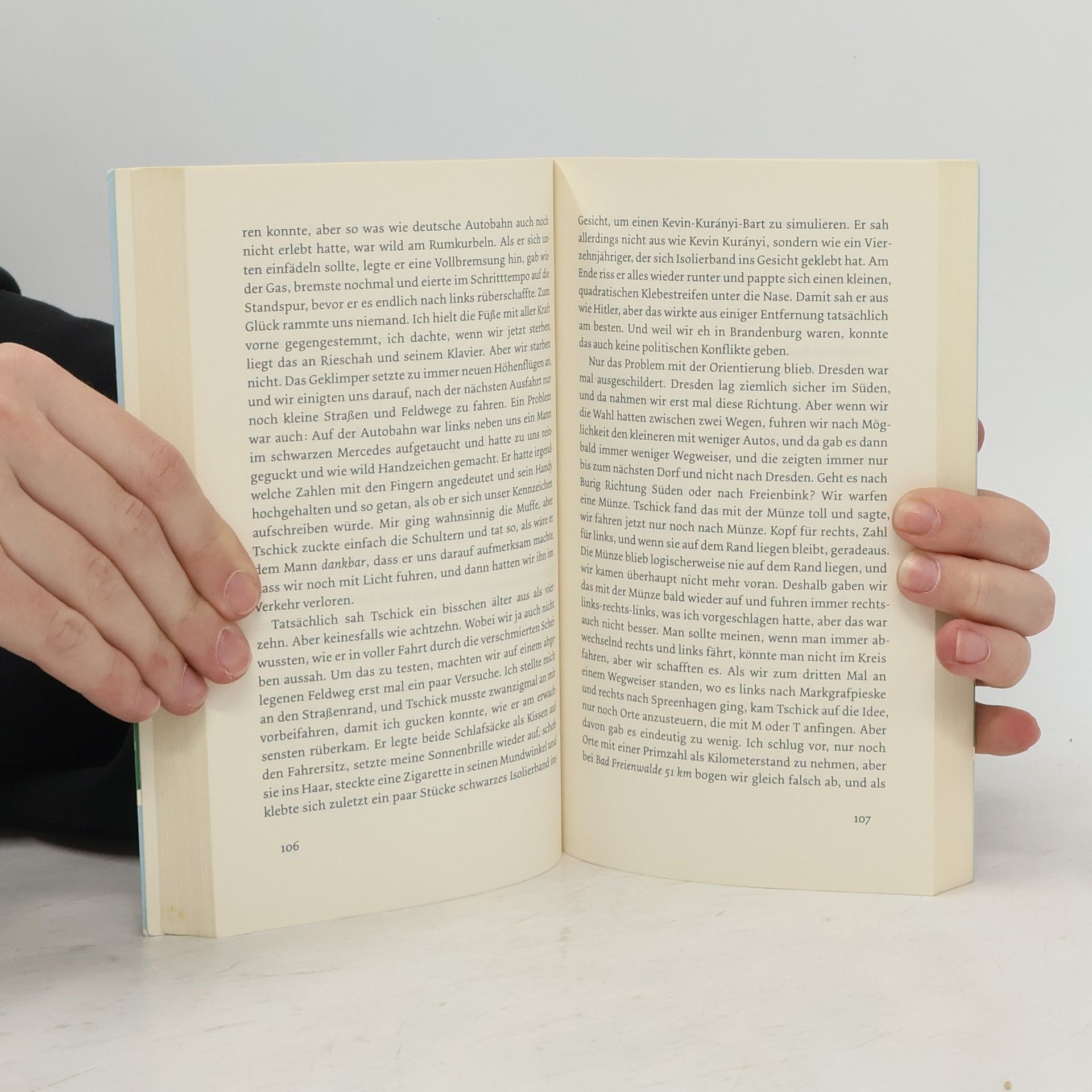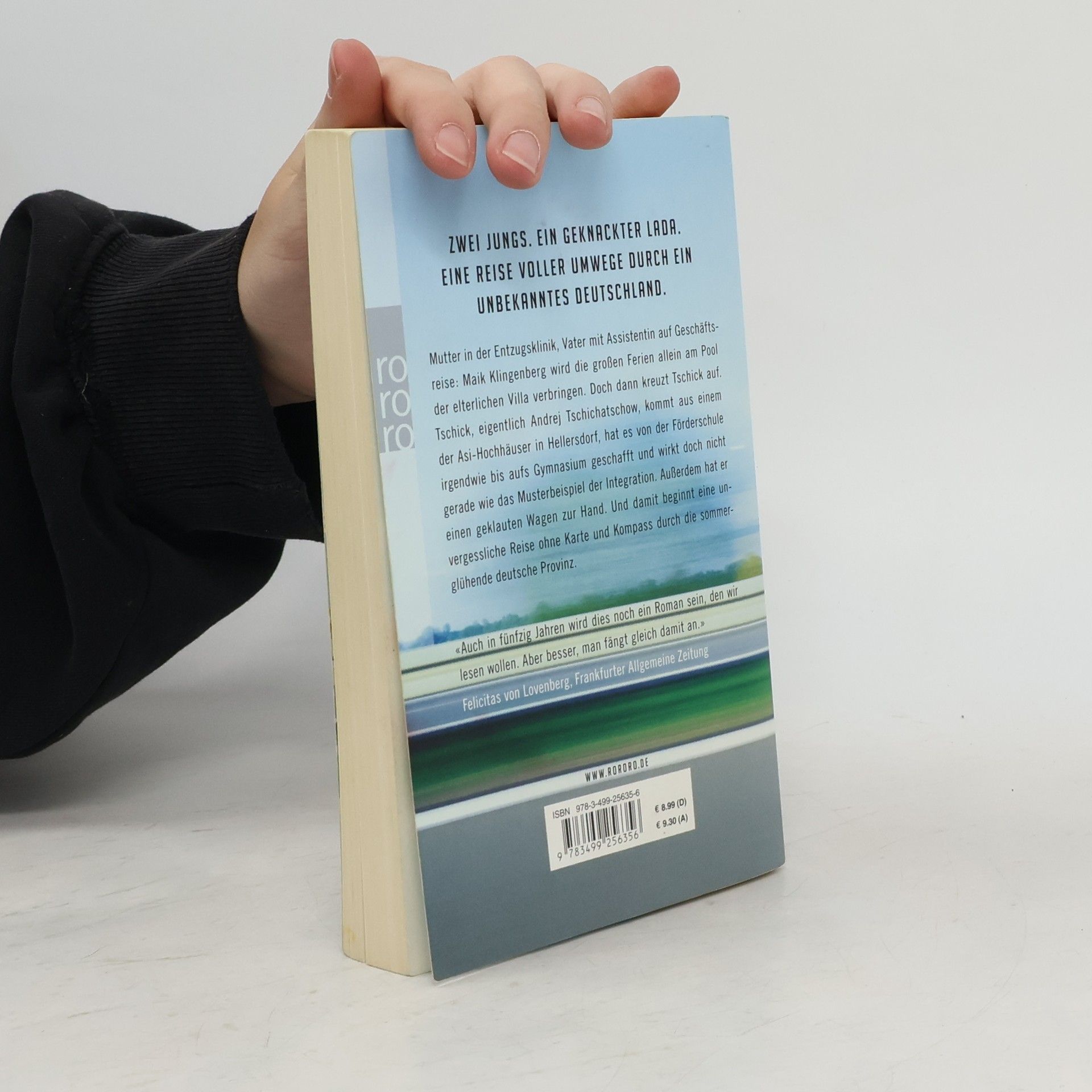 «Ein klappriges Auto kam die Straße runtergefahren. Es fuhr langsam auf unser Haus zu und bog in die Garagenauffahrt ein. Eine Minute stand der hellblaue Lada Niva mit laufendem Motor vor unserer Garage, dann wurde der Motor abgestellt. Die Fahrertür ging auf, Tschick stieg aus. Er legte beide Ellenbogen aufs Autodach und sah zu, wie ich den Rasen sprengte. ‹Ah›, sagte er, und dann sagte er lange nichts mehr. ‹Macht das Spaß?›» Mutter in der Entzugsklinik, Vater mit Assistentin auf Geschäftsreise: Maik Klingenberg wird die großen Ferien allein am Pool der elterlichen Villa verbringen. Doch dann kreuzt Tschick auf. Tschick, eigentlich Andrej Tschichatschow, kommt aus einem der Asi-Hochhäuser in Hellersdorf, hat es von der Förderschule irgendwie bis aufs Gymnasium geschafft und wirkt doch nicht gerade wie das Musterbeispiel der Integration. Außerdem hat er einen geklauten Wagen zur Hand. Und damit beginnt eine Reise ohne Karte und Kompass durch die sommerglühende deutsche Provinz, unvergesslich wie die Flussfahrt von Tom Sawyer und Huck Finn.