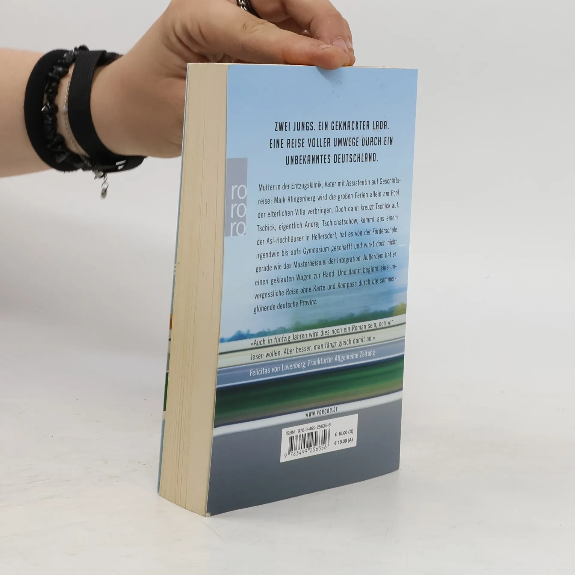 «Ein klappriges Auto kam die Straße runtergefahren. Es fuhr langsam auf unser Haus zu und bog in die Garagenauffahrt ein. Eine Minute stand der hellblaue Lada Niva mit laufendem Motor vor unserer Garage, dann wurde der Motor abgestellt. Die Fahrertür ging auf, Tschick stieg aus. Er legte beide Ellenbogen aufs Autodach und sah zu, wie ich den Rasen sprengte. ‹Ah›, sagte er, und dann sagte er lange nichts mehr. ‹Macht das Spaß?›» Mutter in der Entzugsklinik, Vater mit Assistentin auf Geschäftsreise: Maik Klingenberg wird die großen Ferien allein am Pool der elterlichen Villa verbringen. Doch dann kreuzt Tschick auf. Tschick, eigentlich Andrej Tschichatschow, kommt aus einem der Asi-Hochhäuser in Hellersdorf, hat es von der Förderschule irgendwie bis aufs Gymnasium geschafft und wirkt doch nicht gerade wie das Musterbeispiel der Integration. Außerdem hat er einen geklauten Wagen zur Hand. Und damit beginnt eine Reise ohne Karte und Kompass durch die sommerglühende deutsche Provinz, unvergesslich wie die Flussfahrt von Tom Sawyer und Huck Finn.