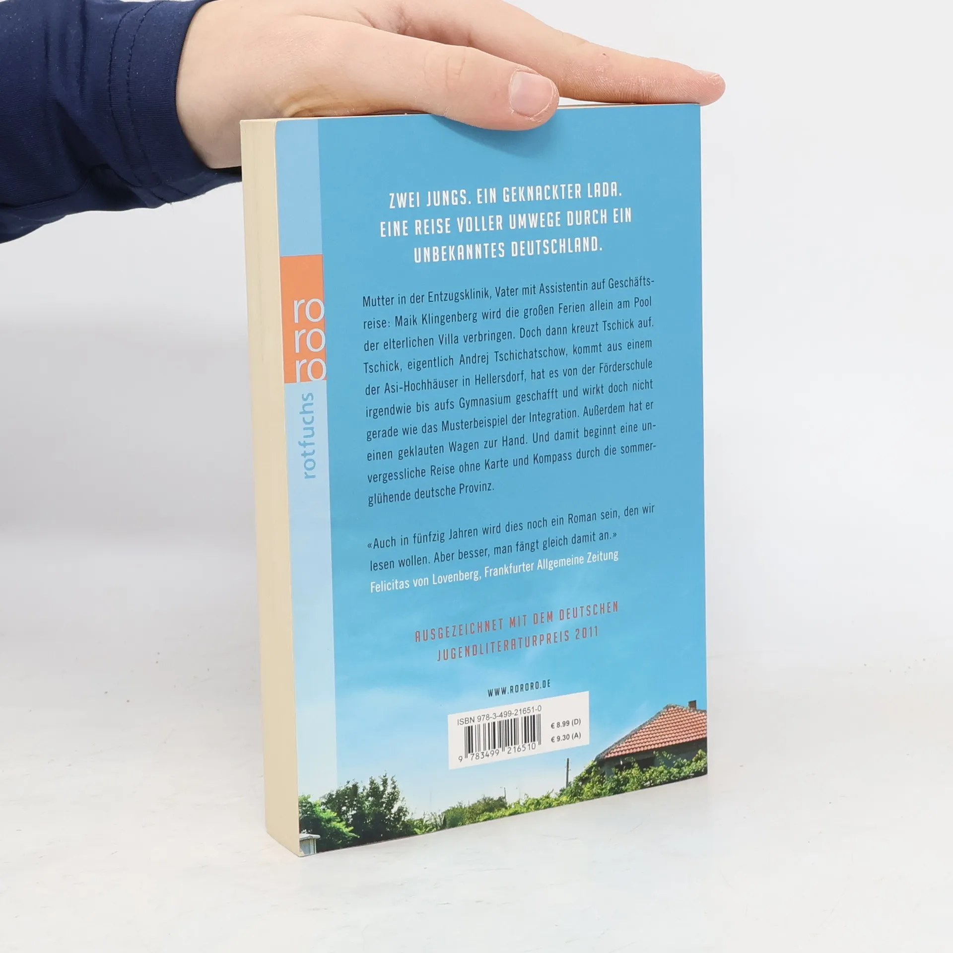 Zwei Jungs. Ein geknackter Lada. Eine Reise voller Umwege durch ein unbekanntes Deutschland.Mutter in der Entzugsklinik, Vater mit Assistentin auf Geschäftsreise: Maik Klingenberg wird die großen Ferien allein am Pool der elterlichen Villa verbringen. Doch dann kreuzt Tschick auf. Tschick, eigentlich Andrej Tschichatschow, kommt aus einem der Asi-Hochhäuser in Hellersdorf, hat es von der Förderschule irgendwie bis aufs Gymnasium geschafft und wirkt doch nicht gerade wie das Musterbeispiel der Integration. Außerdem hat er einen geklauten Wagen zur Hand. Und damit beginnt eine unvergessliche Reise ohne Karte und Kompass durch die sommerglühende deutsche Provinz.«Auch in fünfzig Jahren wird dies noch ein Roman sein, den wir lesen wollen. Aber besser, man fängt gleich damit an.» Felicitas von Lovenberg, Frankfurter Allgemeine ZeitungAusgezeichnet mit dem Deutschen Jugendliteraturpreis 2011