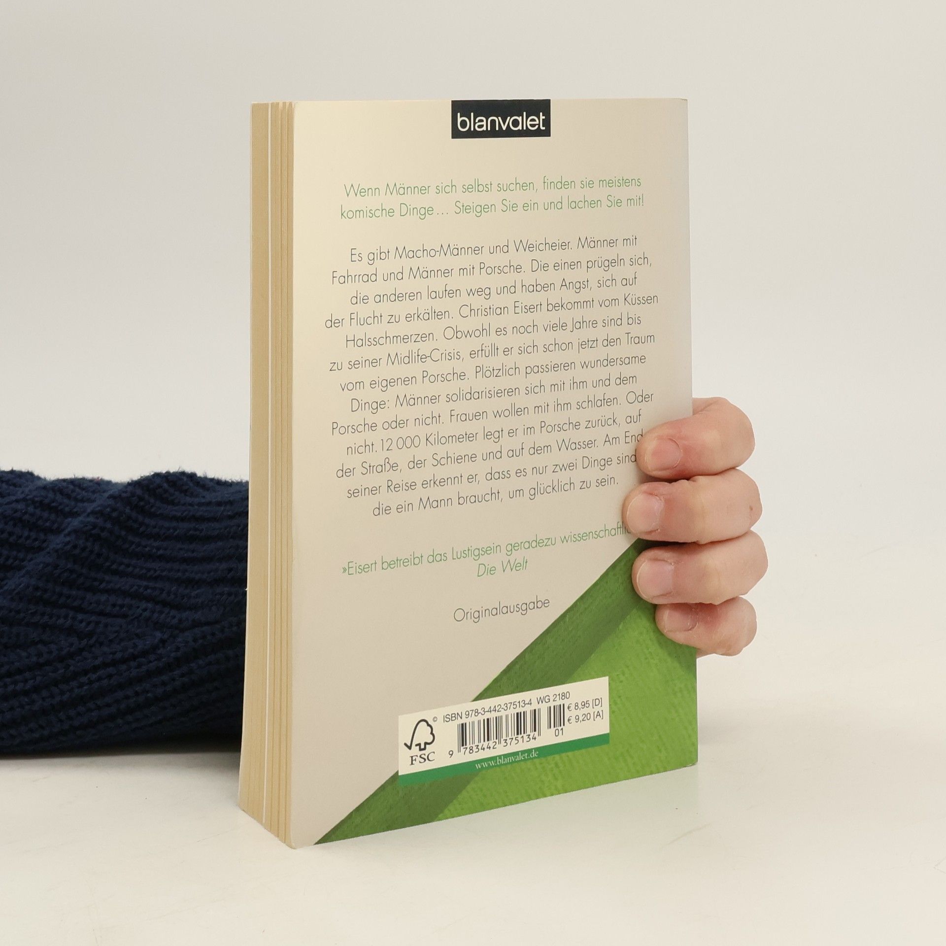 Wenn Männer sich selbst suchen, finden sie meistens komische Dinge. Steigen Sie ein und lachen Sie mit! Es gibt Macho-Männer und Weicheier. Männer mit Fahrrad und Männer mit Porsche. Die einen prügeln sich, die anderen laufen weg und haben Angst, sich auf der Flucht zu erkälten. Christian Eisert bekommt vom Küssen Halsschmerzen. Obwohl es noch viele Jahre sind bis zu seiner Midlife-Crisis, erfüllt er sich schon jetzt den Traum vom eigenen Porsche. Plötzlich passieren wundersame Dinge: Männer solidarisieren sich mit ihm und dem Porsche oder nicht. Frauen wollen mit ihm schlafen. Oder nicht. 12 000 Kilometer legt er im Porsche zurück, auf der Straße, der Schiene und auf dem Wasser. Am Ende seiner Reise erkennt er, dass es nur zwei Dinge sind, die ein Mann braucht, um glücklich zu sein.