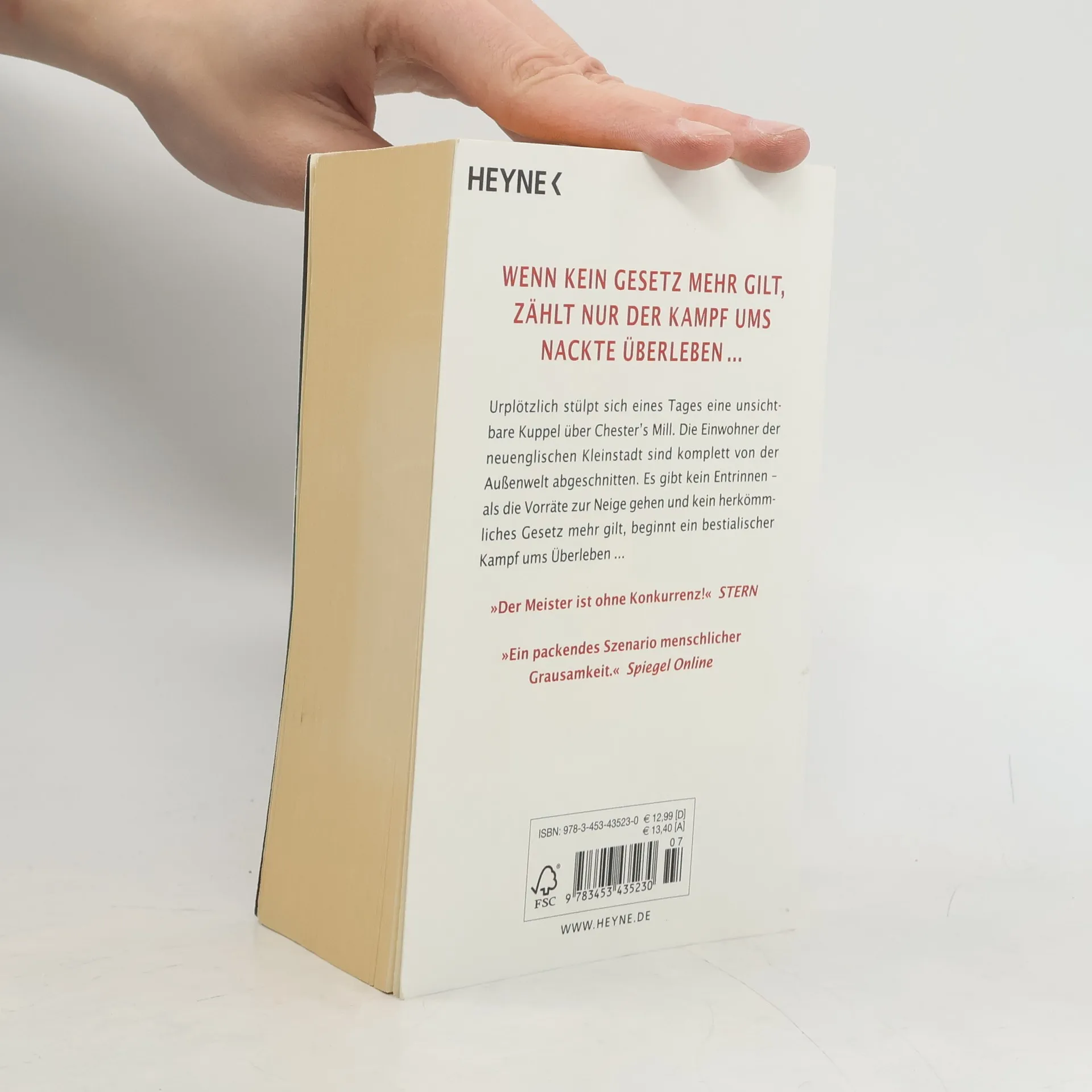 Wenn kein Gesetz mehr gilt, zählt nur der Kampf ums nackte Überleben... Mit „Die Arena” legt Stephen King ein faszinierendes neues Monumentalwerk vor – seinen umfangreichsten und fesselndsten Roman seit „The Stand – Das letzte Gefecht”. Urplötzlich stülpt sich eines Tages wie eine unsichtbare Kuppel ein undurchdringliches Kraftfeld über Chester’s Mill. Die Einwohner der neuenglischen Kleinstadt sind komplett von ihrer Umwelt abgeschnitten. Und auf einmal gilt kein herkömmliches Gesetz mehr ...