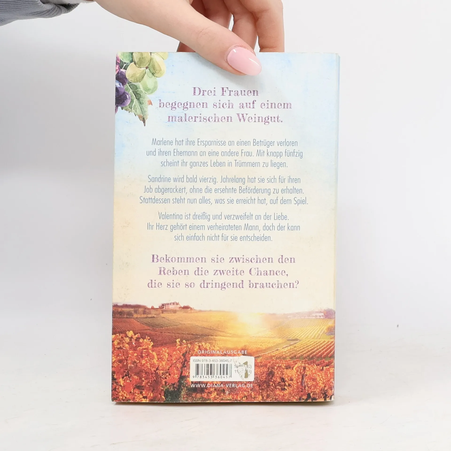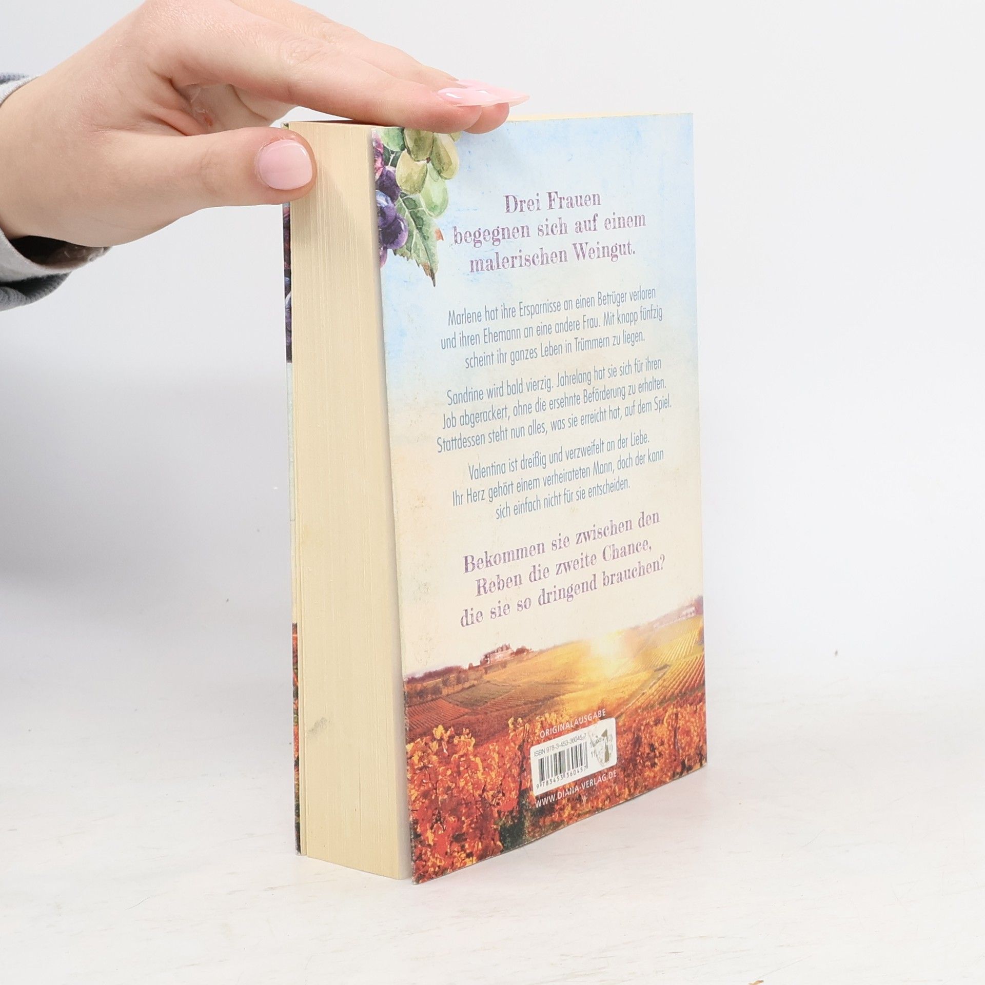 Marlene hat ihre Ersparnisse an einen Betrüger verloren und ihren Ehemann an eine andere Frau. Mit knapp fünfzig scheint ihr ganzes Leben in Trümmern zu liegen. Sandrine wird bald vierzig. Jahrelang hat sie sich für ihren Job abgerackert, ohne die ersehnte Beförderung zu erhalten. Stattdessen steht nun alles, was sie erreicht hat, auf dem Spiel. Valentina ist dreißig und verzweifelt an der Liebe. Ihr Herz gehört einem verheirateten Mann, doch der kann sich einfach nicht für sie entscheiden. Auf einem Weingut im Süden von Deutschland begegnen sich die drei Frauen. Jede einzelne von ihnen braucht dringend eine zweite Chance. Doch die braucht der Winzer Hermann auch. Sein Gut steht kurz vor dem Konkurs. Wenn sie das Weingut retten wollen, müssen sich die drei unterschiedlichen Frauen zusammenraufen.