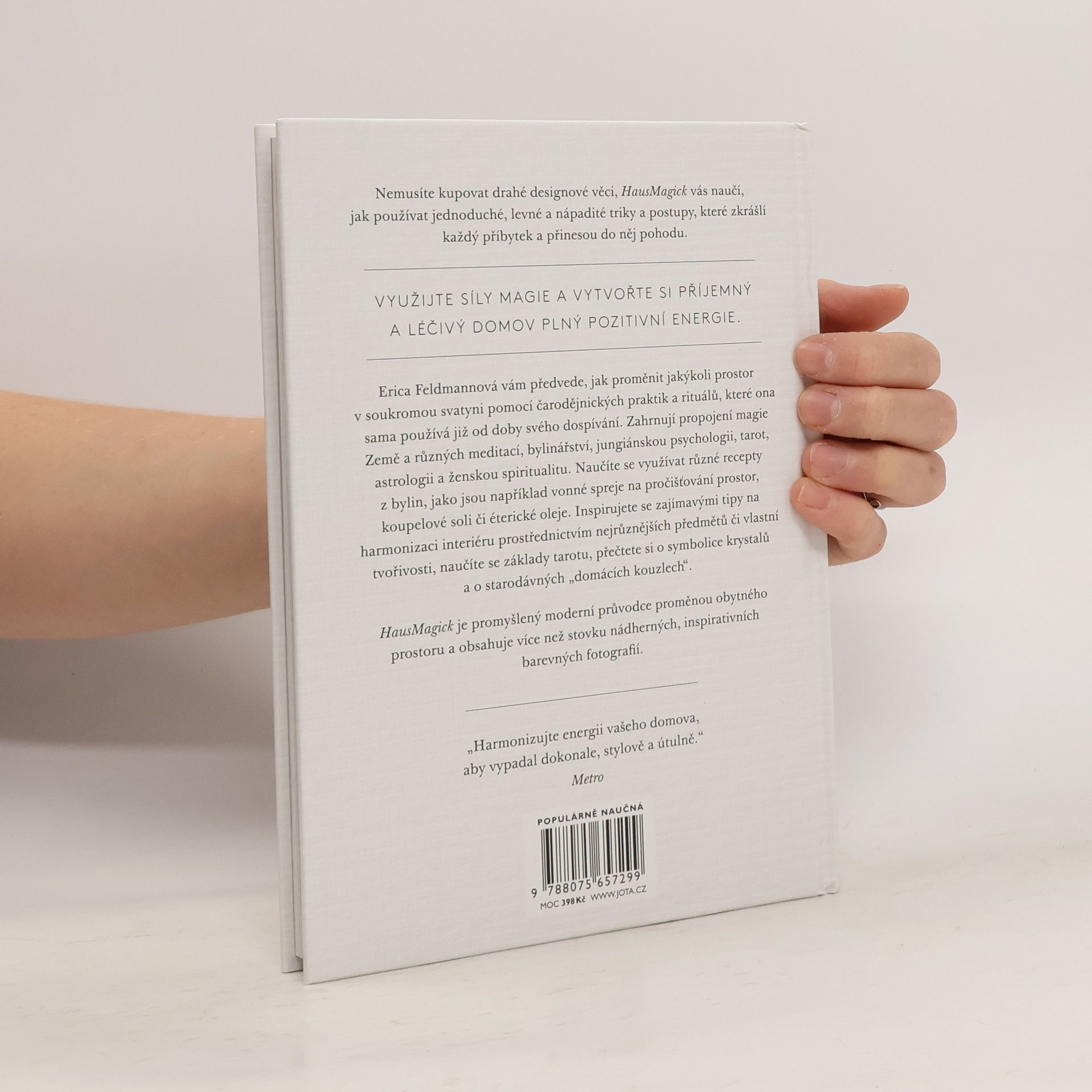 Využijte síly magie a vytvořte si příjemný a léčivý životní prostor s pomocí tohoto jedinečného ilustrovaného průvodce. Je to kniha pro každého, kdo si touží vybudovat krásný a pohodlný domov plný pozitivní energie. Nemusíte kupovat drahé designové věci, HausMagick vás naučí, jak používat jednoduché, levné a nápadité triky a postupy, které zkrášlí každý příbytek a přinesou do něj pohodu. Erica Feldmannová vám předvede, jak si můžete jakýkoli prostor proměnit na soukromou svatyni pomocí čarodějnických praktik a rituálů, které ona sama používá již od doby svého dospívání. Tyto praktiky zahrnují propojení magie Země a různých meditací, bylinářství, jungiánskou psychologii, tarot, astrologii, ženskou spiritualitu a přeměnu obytného prostoru v duchu všech těchto prvků. V knize se naučíte využívat různé recepty z bylin, jako jsou například vonné spreje na pročišťování prostor, koupelové soli či éterické oleje. Inspirujete se zajímavými tipy na harmonizaci interiéru prostřednictvím nejrůznějších předmětů či vlastní tvořivosti, naučíte se základy tarotu, seznámíte se se symbolikou krystalů a po generace předávanými „domácími kouzly“.