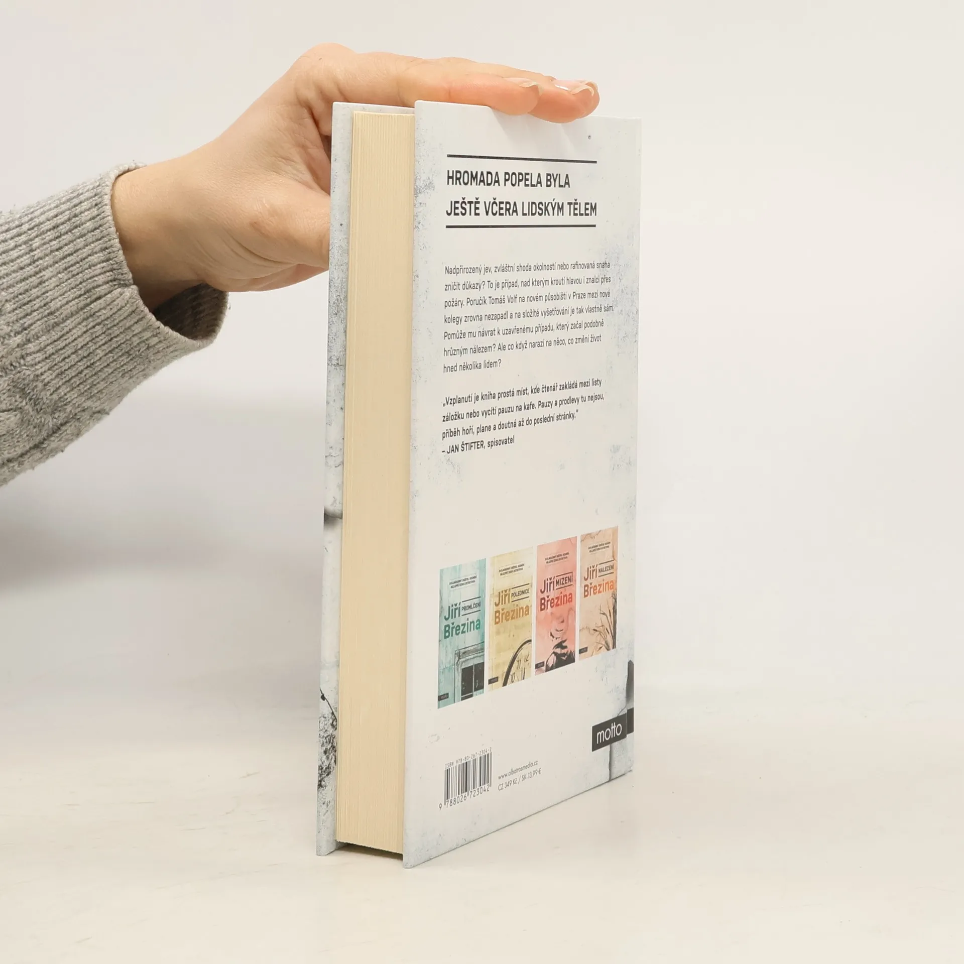 Hromada popela byla ještě včera lidským tělem. Další případ poručíka Volfa. Druhá kniha s Tomášem Volfem, za niž Jiří Březina obdržel Cenu Jiřího Marka za nejlepší detektivku Nadpřirozený jev, zvláštní shoda okolností, nebo rafinovaná snaha zničit důkazy? To je případ, nad kterým kroutí hlavou i vyšetřovatel požárů. Najít odpovědi rozhodně nebude snadné. Poručík Tomáš Volf na novém působišti v Praze mezi nové kolegy zrovna nezapadl a na složité vyšetřování je tak vlastně sám. Pomůže mu návrat k uzavřenému případu, který začal podobně hrůzným nálezem? Může se ale stát, že narazí na něco, co změní život hned několika lidí.