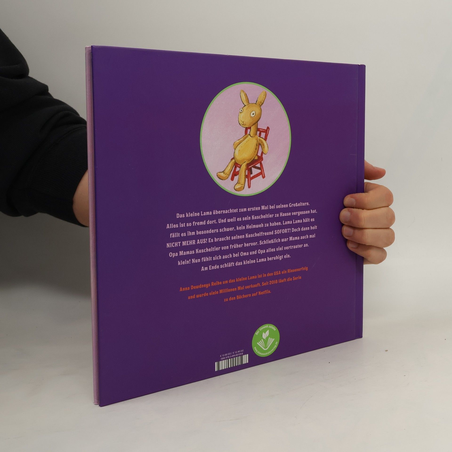 Das kleine Lama übernachtet zum ersten Mal bei seinen Großeltern. Alles ist so fremd dort. Und weil es sein Kuscheltier zu Hause vergessen hat, fällt es ihm besonders schwer, kein Heimweh zu haben. Lama Lama hält es NICHT MEHR AUS! Es braucht seinen Kuschelfreund SOFORT! Doch dann holt Opa Mamas Kuscheltier von früher hervor. Schließlich war Mama auch mal klein! Nun fühlt sich auch bei Oma und Opa alles viel vertrauter an. Am Ende schläft das kleine Lama beruhigt ein. Anna Dewdneys Reihe um das kleine Lama ist in den USA ein Riesenerfolg und wurde viele Millionen Mal verkauft. Seit 2018 läuft die Serie zu den Büchern auf Netflix.