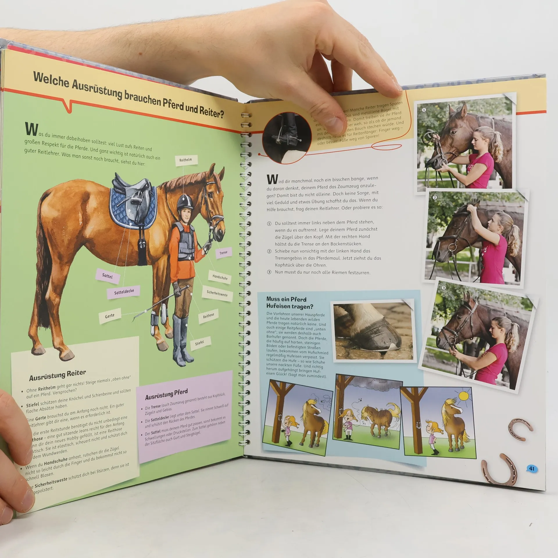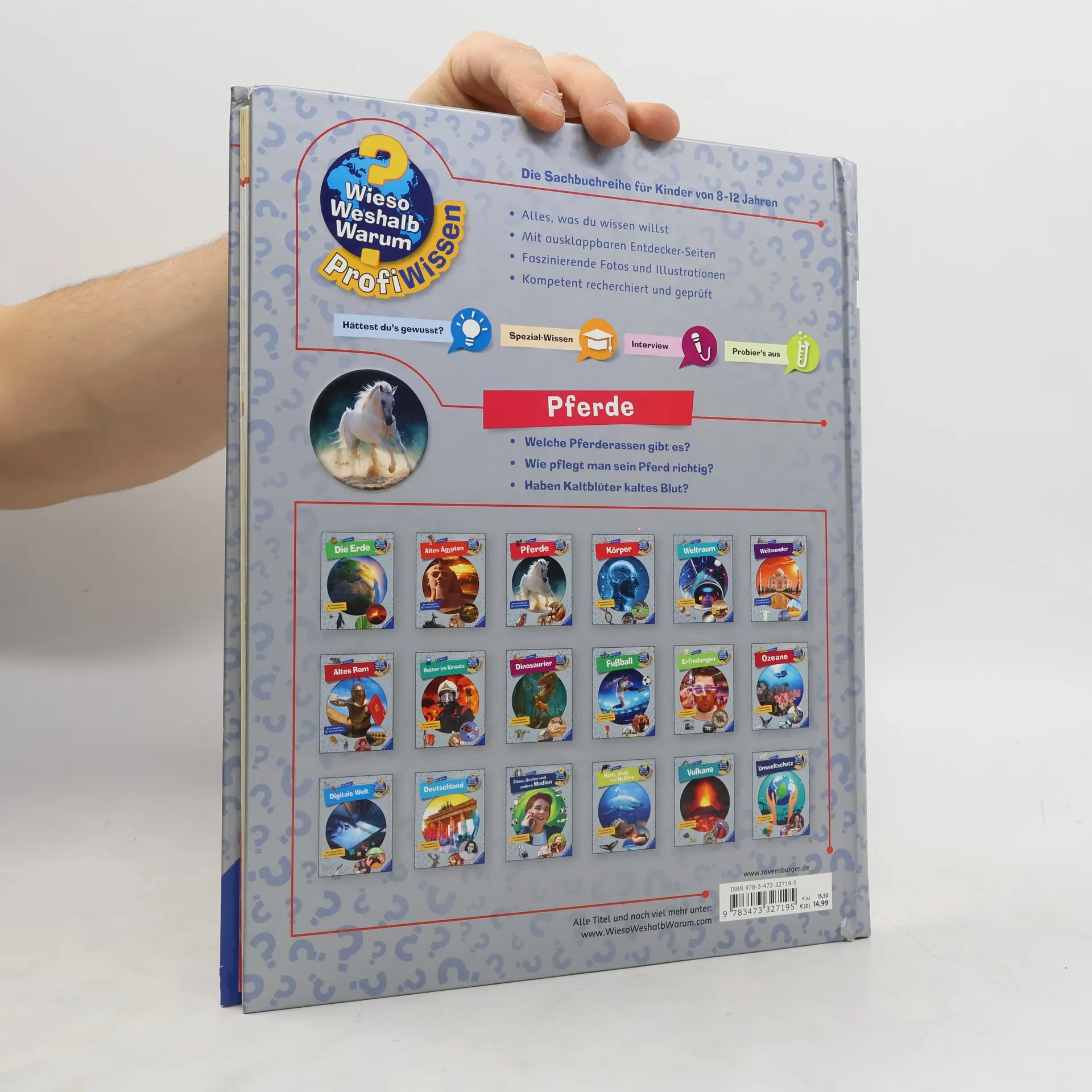 Wie wird ein Fohlen geboren? Schimmelt ein Schimmel? Welcher Reitstil passt zu dir? Diese und viele weitere Fragen rund um Pferde und Ponys werden unterhaltsam beantwortet. Kinder ab 8 Jahren erfahren, welche Fähigkeiten Pferde haben und lernen, wie man sie richtig pflegt und reitet. Das Buch stellt zudem verschiedene Berufe vor, die mit diesen beliebten Tieren verbunden sind. Naturgetreue Illustrationen und zahlreiche Fotos laden die Leser in die faszinierende Welt der Haflinger, Lipizzaner und Islandponys ein. Die Sachbuchreihe richtet sich an Kinder von 8–12 Jahren und bietet spannende Einblicke in verschiedene Themen. Ob es um Dinosaurier, Rennwagen oder das Weltall geht, hier finden wissbegierige Leser alles, was sie wissen möchten. Mit modernem Design, beeindruckenden Bildern und überraschenden Fakten wird Wissen lebendig vermittelt. Witzige Comics lockern die Texte auf, während Experten in Interviews interessante Einblicke geben. Spezial-Wissen-Kästen bieten tiefere Informationen, und zahlreiche Anleitungen für Experimente laden zum Ausprobieren ein. Ausklappbare Entdeckerseiten in jedem Band bieten zusätzlich noch mehr zum Staunen und Entdecken. Ein unterhaltsamer Begleiter durch verschiedene Wissenswelten!