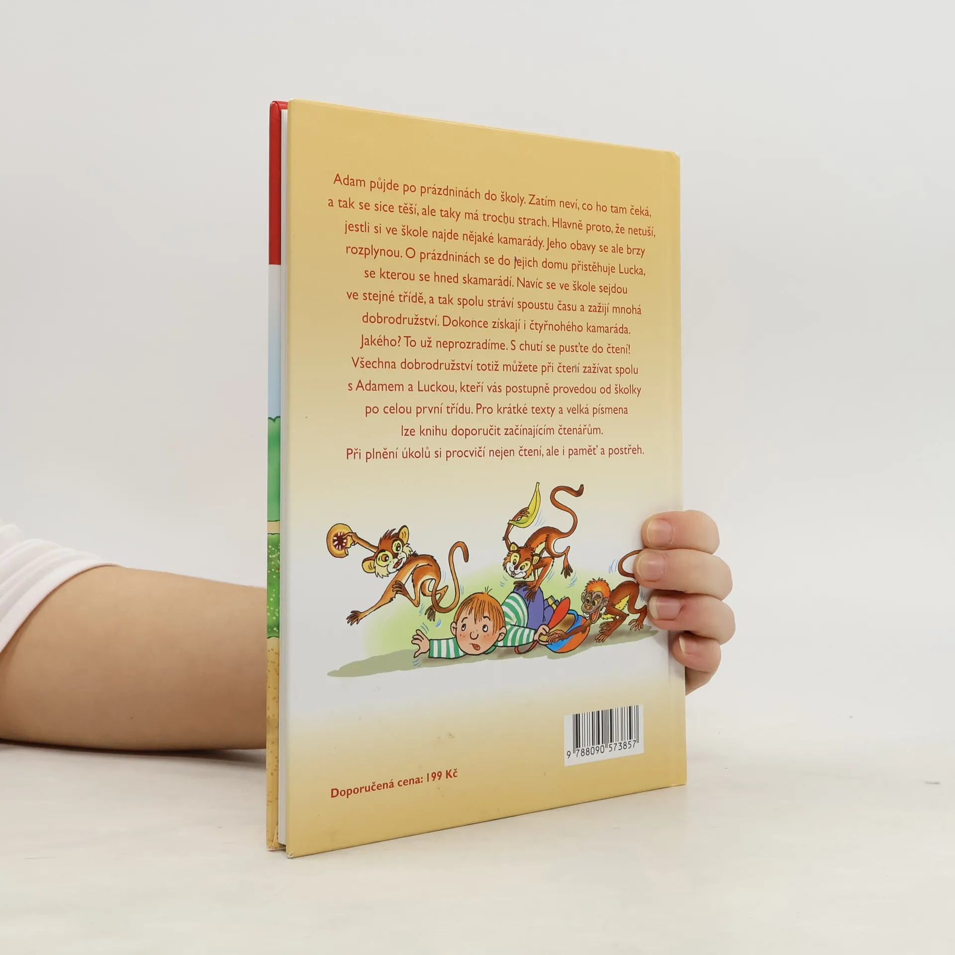 Adam půjde po prázdninách do školy. Zatím neví, co ho tam čeká, a tak se sice těší, ale taky má trochu strach. Hlavně proto, že netuší, jestli si ve škole najde nějaké kamarády. Jeho obavy se ale brzy rozplynou. O prázdninách se do jejich domu přistěhuje Lucka, se kterou se hned skamarádí. Navíc se ve škole sejdou ve stejné třídě, a tak spolu stráví spoustu času a zažijí mnohá dobrodružství. Dokonce získají i čtyřnohého kamaráda. Jakého? To už neprozradíme. S chutí se pusťte do čtení! Všechna dobrodružství totiž můžete při čtení zažívat spolu s Adamem a Luckou, kteří vás postupně provedou od školky po celou první třídu. Pro krátké texty a velká písmena lze knihu doporučit začínajícím čtenářům. Při plnění úkolů si procvičí nejen čtení, ale i paměť a postřeh