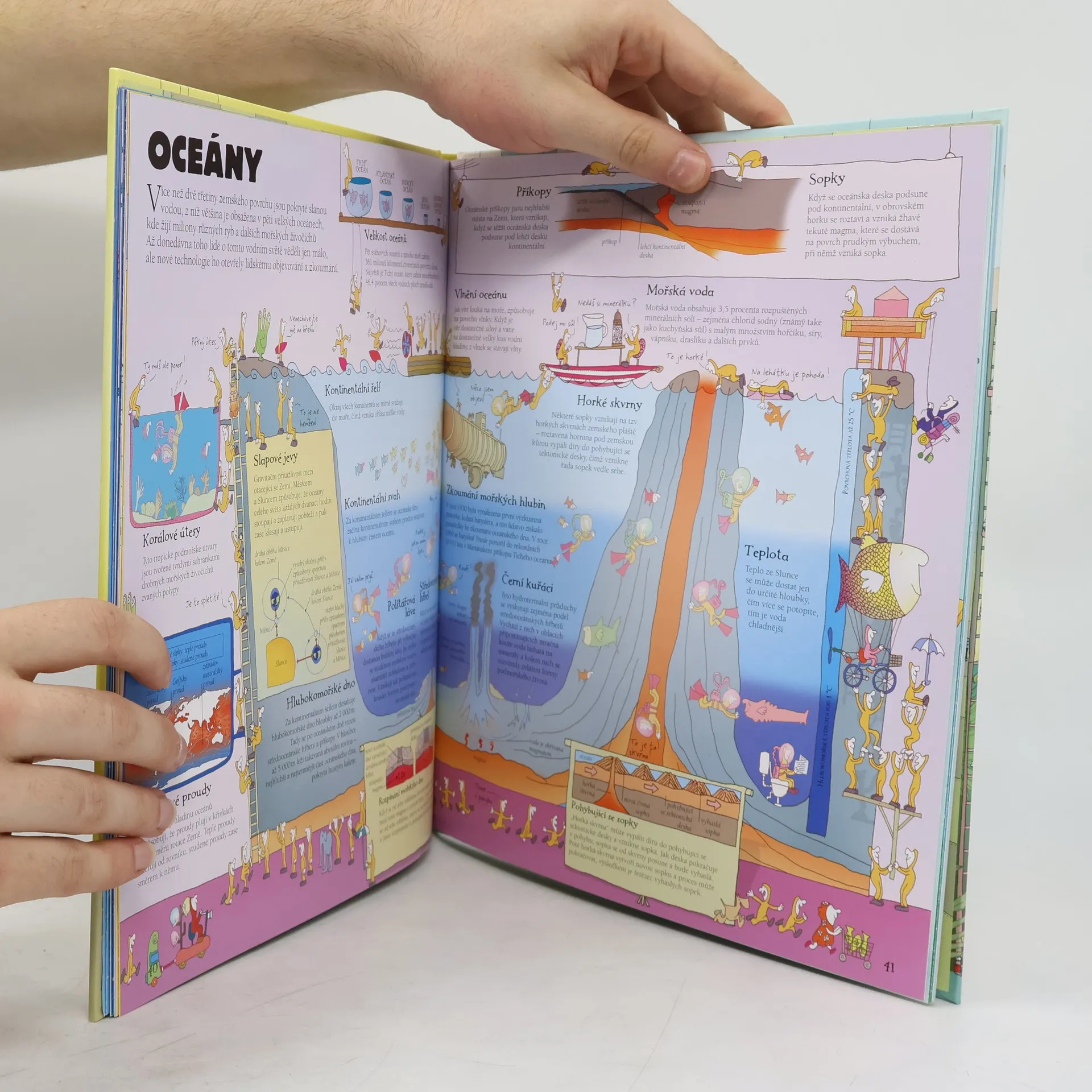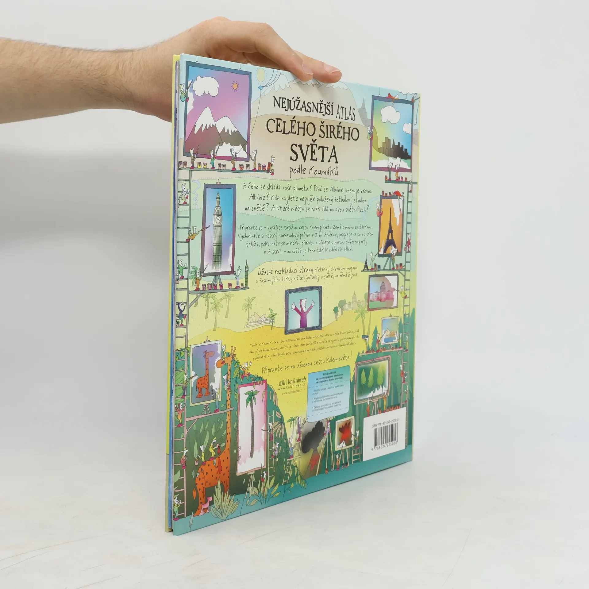 Podnikavé, energické a všetečné postavičky jménem Koumáci vás provedou po dobrodružné cestě kolem světa tak, jak jsme ho ještě neviděli. Ústřední částí knihy je šestice rozkládacích stran, z nichž každá se zaměřuje na jeden ze šesti kontinentů: Severní Ameriku, Jižní Ameriku, Afriku, Evropu, Asii a Austrálii a Oceánii. Kromě toho je zde popsána i celá řada souvisejících témat včetně stavby Země, světového obyvatelstva, oceánů a počasí a podnebí. Na vrchních dvou stranách každé rozkládačky začínáme cestu kontinentem na vtipně ilustrovaných mapách představujících jeho fyzický zeměpis. Po rozložení vrchních stránek se objeví krajina nabitá informacemi o obyvatelích, zvycích, hospodářství a slavných místech každé ze zemí na světadílu. Na dvoustranách mezi rozkládačkami se seznámíme se zeměpisem našeho světa, od podvodní krajiny hlubokých oceánů po počasí a podnebí všech oblastí, a od hornin a procesů dodávajících našemu světu tvar po neskutečnou pestrost jeho obyvatel.