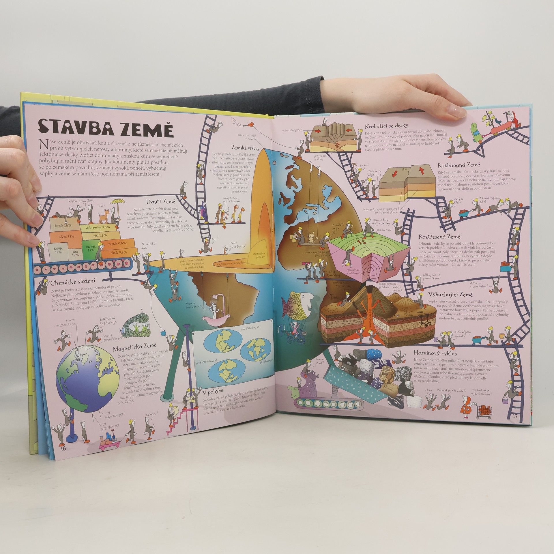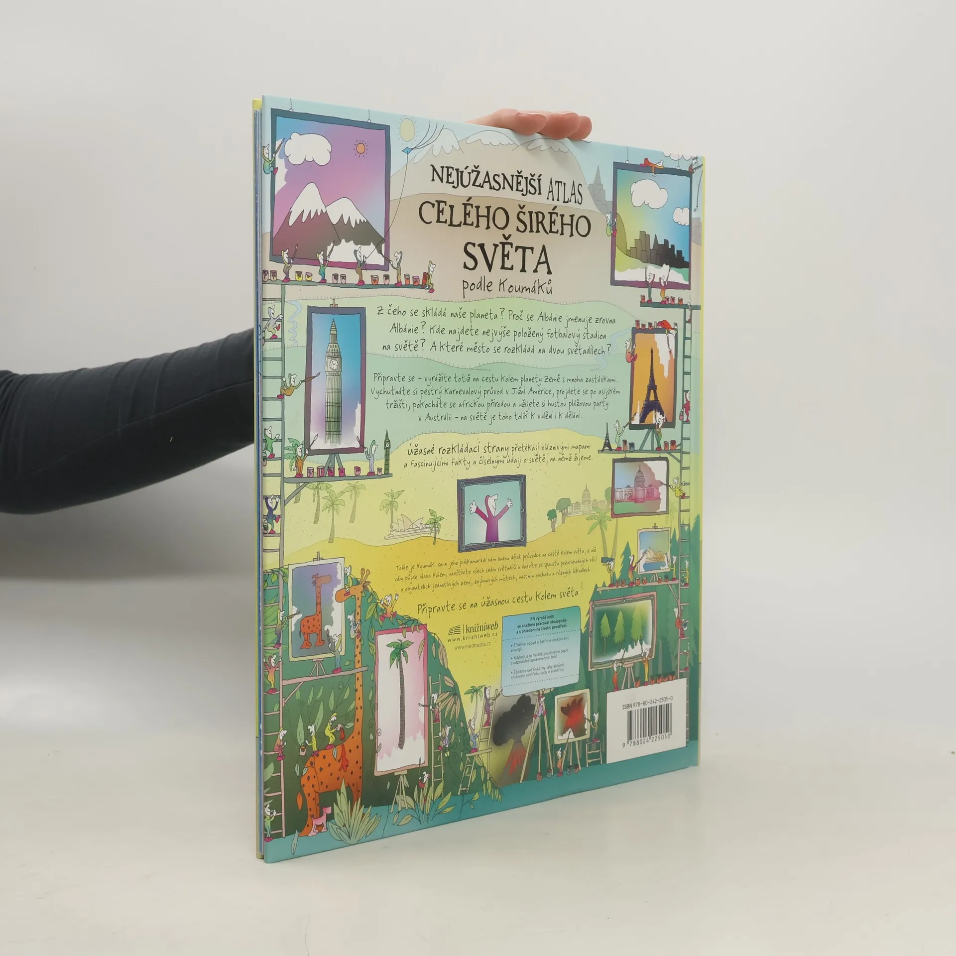 Podnikavé, energické a všetečné postavičky jménem Koumáci vás provedou po dobrodružné cestě kolem světa tak, jak jsme ho ještě neviděli. Ústřední částí knihy je šestice rozkládacích stran, z nichž každá se zaměřuje na jeden ze šesti kontinentů: Severní Ameriku, Jižní Ameriku, Afriku, Evropu, Asii a Austrálii a Oceánii. Kromě toho je zde popsána i celá řada souvisejících témat včetně stavby Země, světového obyvatelstva, oceánů a počasí a podnebí. Na vrchních dvou stranách každé rozkládačky začínáme cestu kontinentem na vtipně ilustrovaných mapách představujících jeho fyzický zeměpis. Po rozložení vrchních stránek se objeví krajina nabitá informacemi o obyvatelích, zvycích, hospodářství a slavných místech každé ze zemí na světadílu. Na dvoustranách mezi rozkládačkami se seznámíme se zeměpisem našeho světa, od podvodní krajiny hlubokých oceánů po počasí a podnebí všech oblastí, a od hornin a procesů dodávajících našemu světu tvar po neskutečnou pestrost jeho obyvatel.