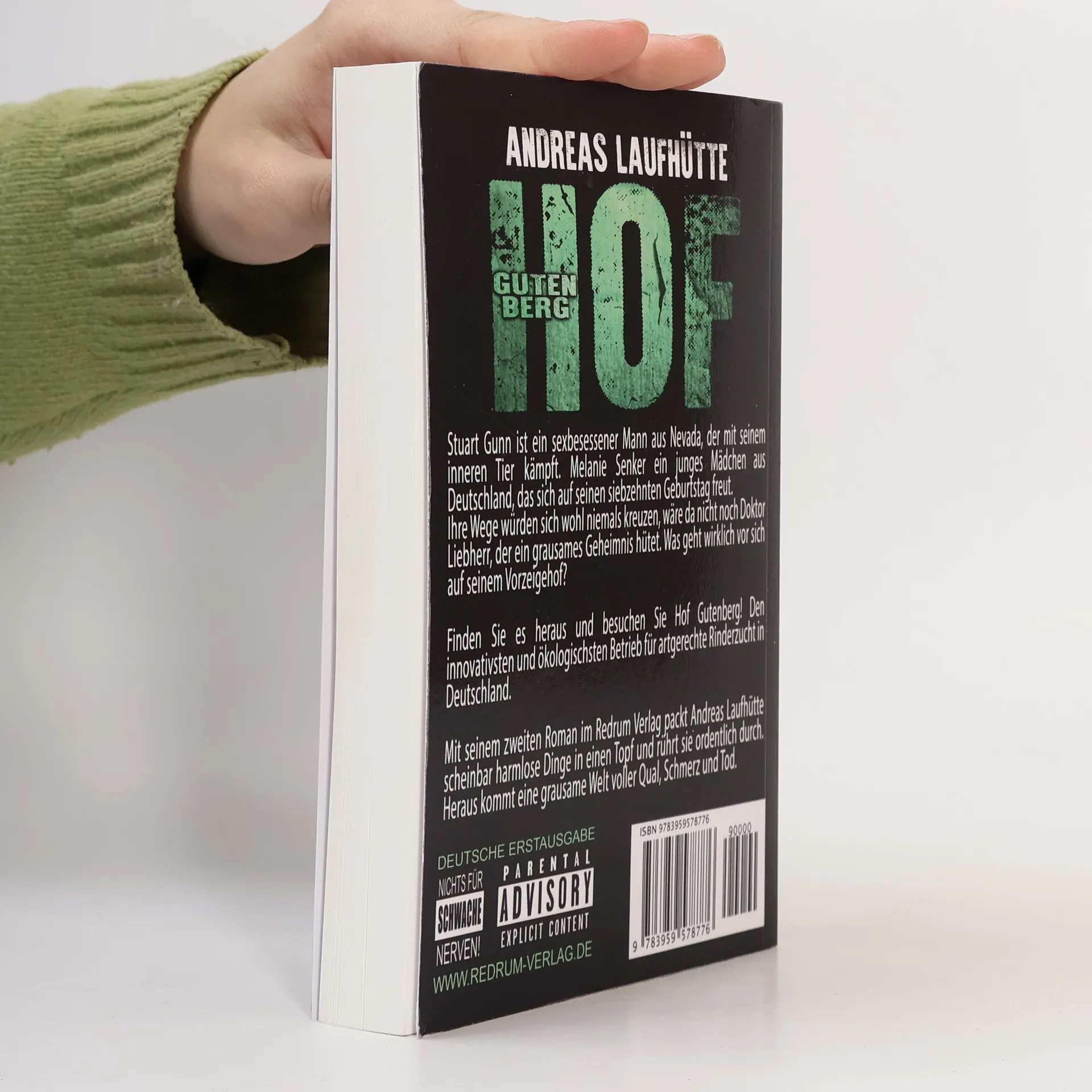 Stuart Gunn ist ein sexbesessener Mann aus Nevada, der mit seinem inneren Tier kämpft. Melanie Senker ein junges Mädchen aus Deutschland, das sich auf seinen siebzehnten Geburtstag freut.Ihre Wege würden sich wohl niemals kreuzen, wäre da nicht noch Doktor Liebherr, der ein grausames Geheimnis hütet. Was geht wirklich vor sich auf seinem Vorzeigehof? Finden Sie es heraus und besuchen Sie Hof Gutenberg! Den innovativsten und ökologischsten Betrieb für artgerechte Rinderzucht in Deutschland.Mit seinem zweiten Roman im Redrum Verlag packt Andreas Laufhütte scheinbar harmlose Dinge in einen Topf und rührt sie ordentlich durch. Heraus kommt eine grausame Welt voller Qual, Schmerz und To