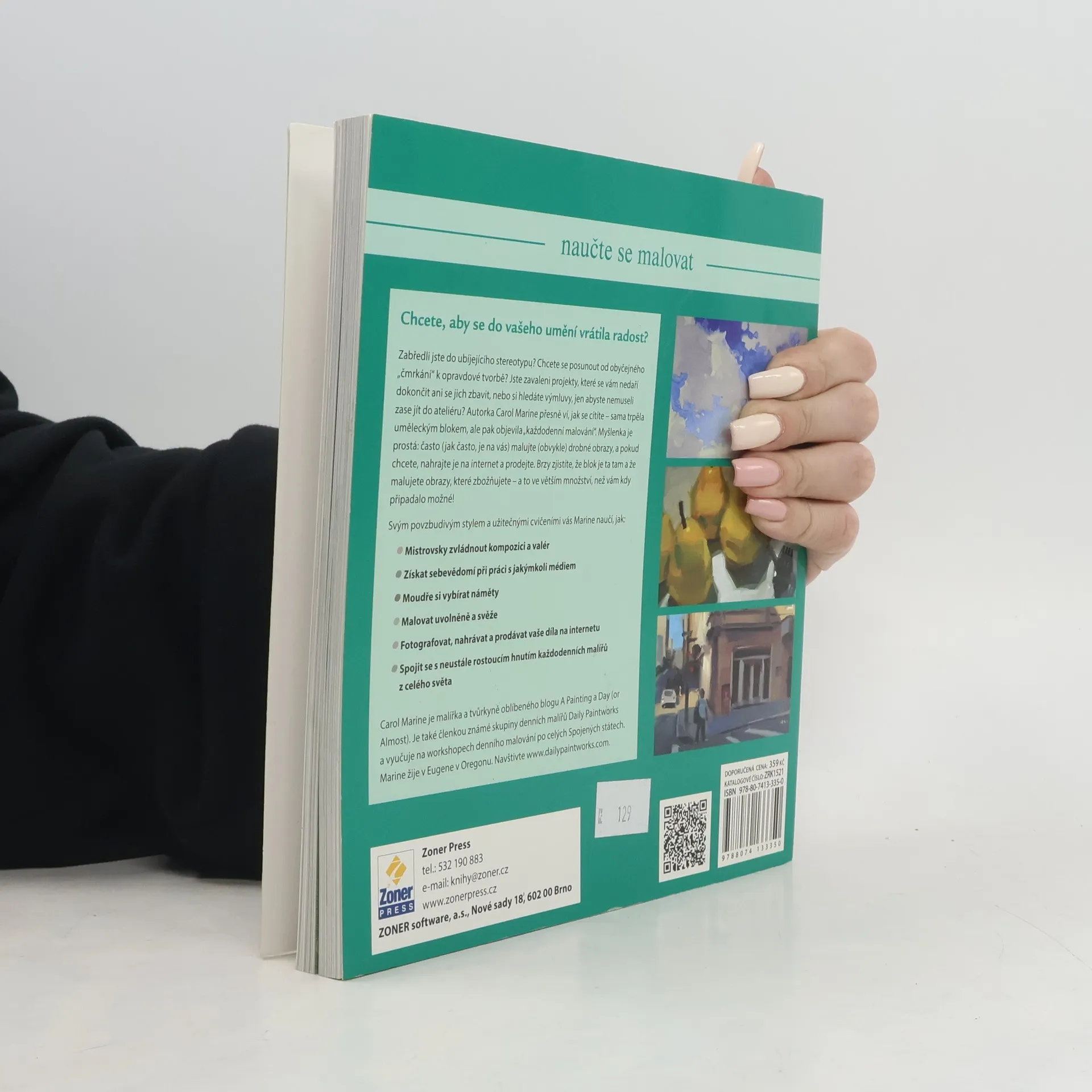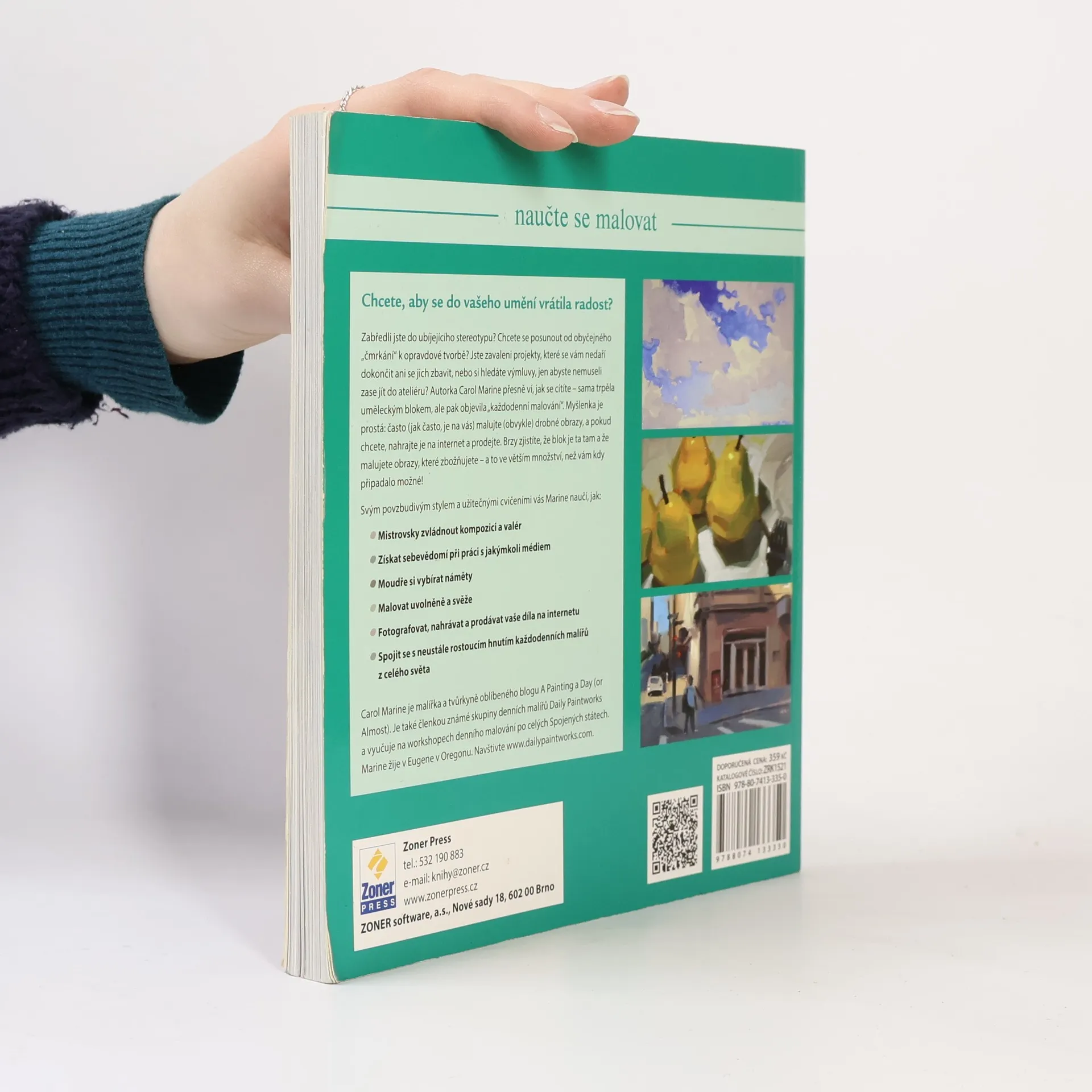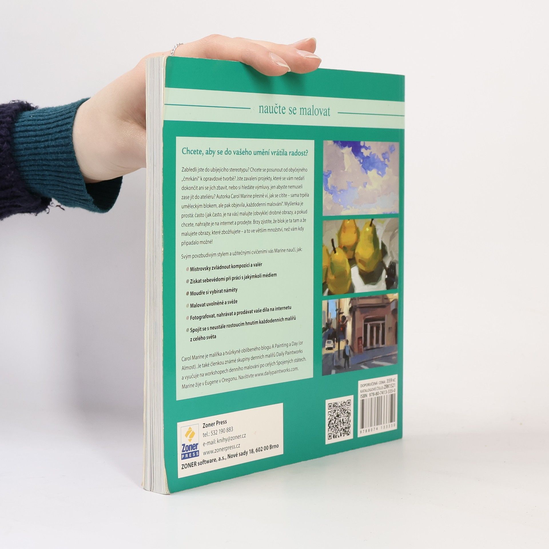 Rady a cvičení pro úspěšnou tvorbu (Naučte se malovat) V jedné z mých oblíbených knih říká čínský filozof: Někdo vyletí k nebesům jako drak a někdo se jako žížala prodírá prachem cest. Je určitě dobré mít velké a smělé cíle, ale každodenní život se skládá z uskutečňování maličkostí. Baví vás malování nebo kreslení? Ale současně se trápíte tím, že se vám nedaří dokončovat velké projekty, zdá se vám, že se nehýbete z místa a přestává vás malování bavit? Zkuste změnit svůj přístup. Autorka publikace Malujte každý den, Carol Marine, přesně ví, jak se cítíte. Sama si prošla tvůrčí krizí, kterou jí pomohlo vyřešit každodenní malování menších obrázků. Vyzkoušejte i vy tuto metodu, při které se zaměříte na malování obrázků, které zvládnete dokončit během jednoho dne. Díky této publikaci zvládnete techniky malby, naučíte se malovat uvolněně a váš koníček vám začne přinášet zase radost. A navíc vám autorka ukáže, jak je jednoduché a snadné představit vaše obrazy lidem a začít je i prodávat na internetu. Kniha je vedle praktických postupů a návodů, které vám pomohou zdokonalit se v malování, doplněna množstvím inspirativních ukázek tvorby autorky i řady dalších umělců. Naučíte se: Zvládnout kompozici a valér Získat sebevědomí při práci s jakýmkoli médiem Vhodně si vybírat náměty Malovat uvolněně Fotografovat, nahrávat a prodávat vaše díla na internetu Spojit se s neustále rostoucím hnutím „každodenních“ malířů z celého světa