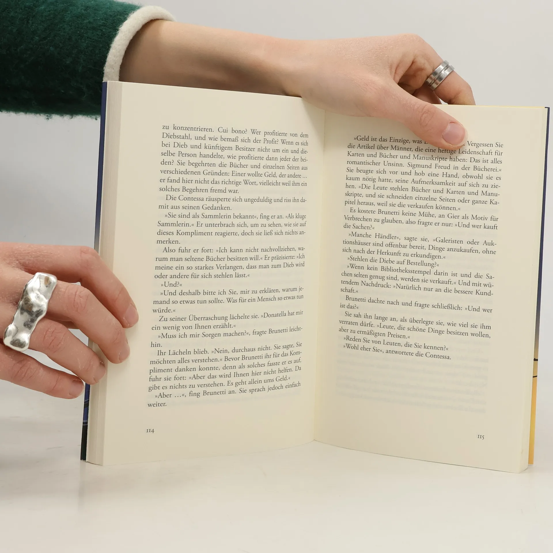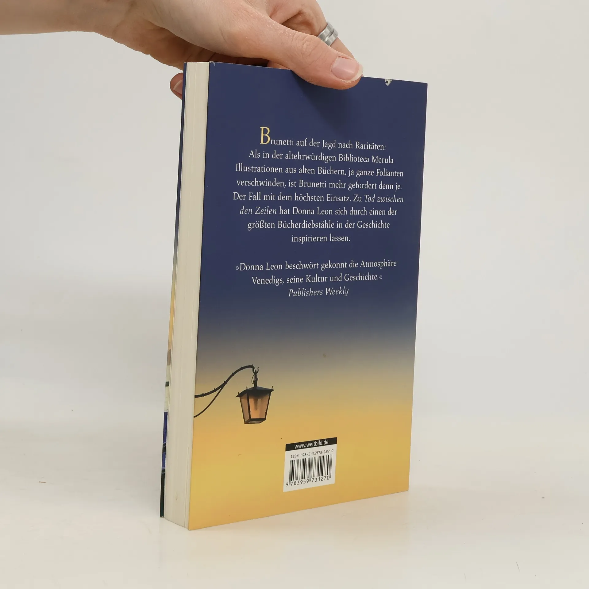 Klappentext zu "Tod zwischen den Zeilen" Frühling in Venedig, eine herrliche Pracht. Doch da wird Brunetti zu einem ungewöhnlichen Tatort gerufen, zu der altehrwürdigen Biblioteca Merula. Wertvolle Folianten liegen aufgeschlitzt da, und der amerikanische Forscher, der ein Dauergast war, ist verschwunden. Brunetti entdeckt eine eigenartige Welt: Er spricht mit Bibliotheksangestellten und Besuchern, mit einem ehemaligen Priester, Aldo Franchini, der immer Tertullian liest, und der edlen Spenderin, Contessa Morosini-Albani. Als es einen Toten gibt, weiß Brunetti, dass mehr auf dem Spiel steht. Mit großem Gespür und ungewöhnlichen Methoden geht Brunetti dem Verbrechen auf den Grund - und entdeckt einen florierenden Schwarzmarkt für Bücher.