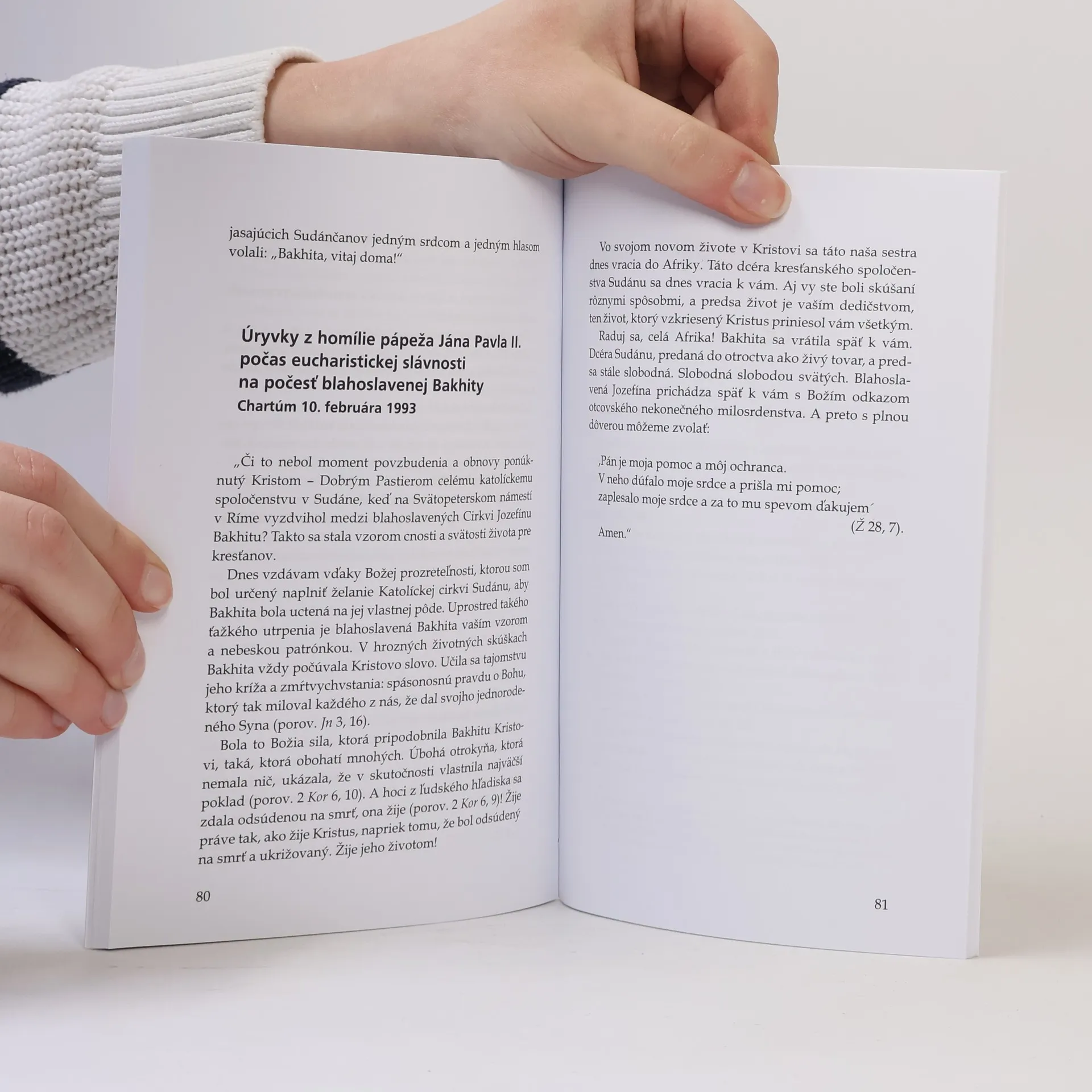 Životopis sv. Bakhity vyrozprávaný jej vlastnými slovami. Bakhita (1869 1947) pochádza zo Sudánu a ako 9- ročnú ju uniesli obchodníci s otrokmi. Prežila 12 rokov v otroctve. Oslobodená z fyzického zotročenia našla pravé vykúpenie v stretnutí s Kristom a jeho Cirkvou. Deň jej spomienky ustanovil Sv. otec František za Svetový deň modlitieb a pripomienky boja proti obchodovaniu s ľuďmi. Úvod napísal prof. Róbert Letz.