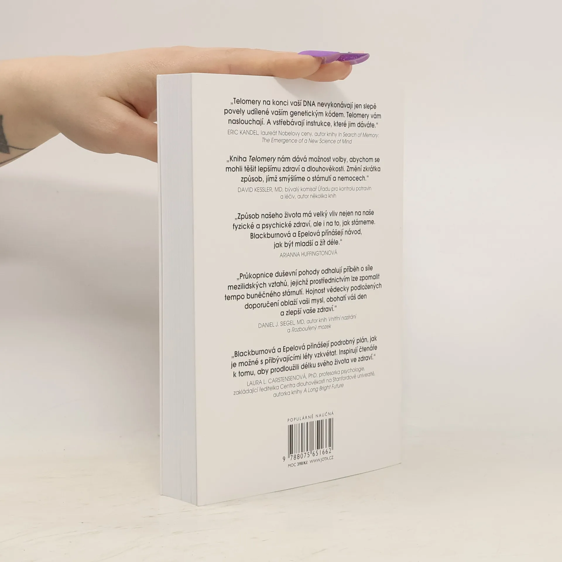 Ovládněte telomery a zastavte čas. Průlomová kniha dvou významných spoluautorek, držitelky Nobelovy ceny, která objevila telomerázu a úlohu telomer v procesu stárnutí, a zdravotní psycholožky, jejíž originální výzkum odhaluje, jak můžeme konkrétním životním stylem a těmi správnými psychickými návyky ochraňovat svoje telomery, zpomalovat průběh nemocí a zlepšovat kvalitu života.