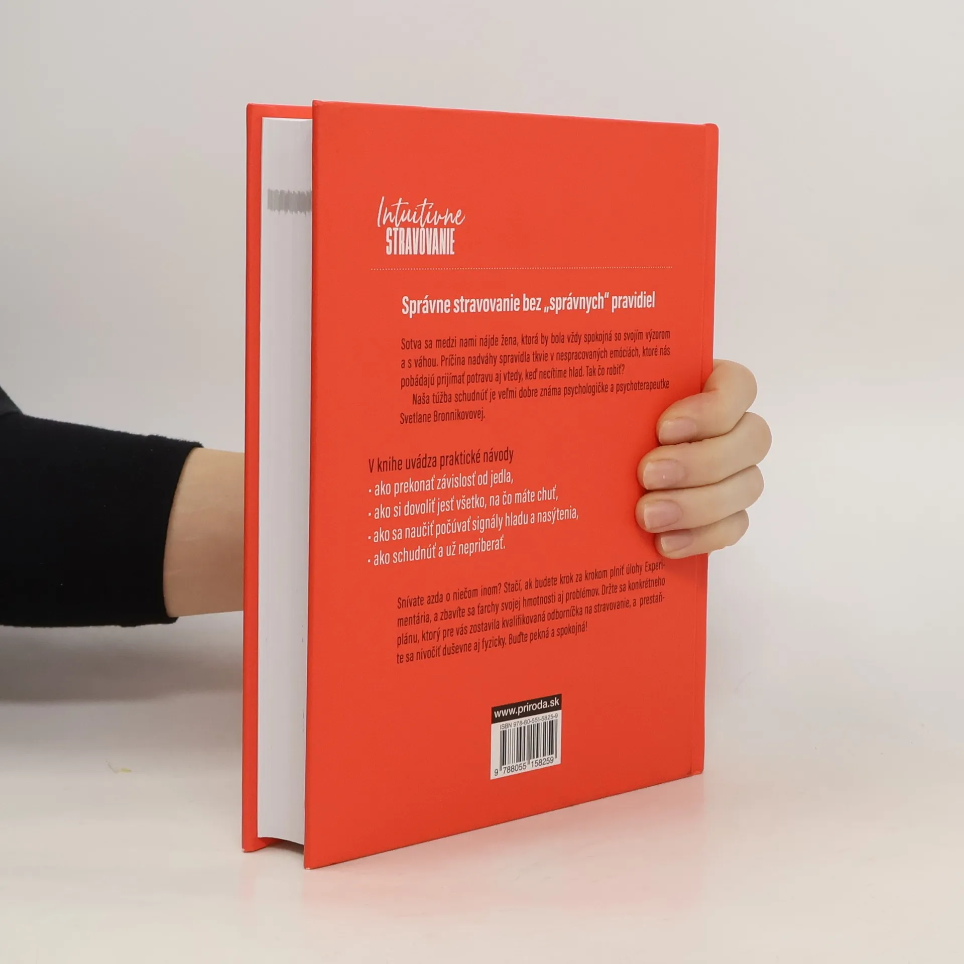 Sotva sa medzi nami nájde žena, ktorá by bola vždy spokojná so svojím výzorom a s váhou. Príčina nadváhy spravidla tkvie v nespracovaných emóciách, ktoré nás pobádajú prijímať potravu bez pocitu hladu. Tak čo robiť?Naša túžba schudnúť je veľmi dobre známa psychologičke a psychoterapeutke Svetlane Bronnikovovej. V knihe uvádza praktické návody ako prekonať potravinovú závislosť. Dovoliť si jesť všetko, na čo máte chuť, naučiť sa počúvať signály hladu a nasýtenia, pritom schudnúť a už nepriberať – snívame azda o niečom inom? Stačí, ak budete krok za krokom plniť úlohy Experimentária, a zbavíte sa ťarchy svojej hmotnosti aj problémov. Držte sa konkrétneho plánu, ktorý pre vás zostavila kvalifikovaná odborníčka na stravovanie, a prestaňte sa nivočiť duševne aj fyzicky. Buďte pekná a spokojná!