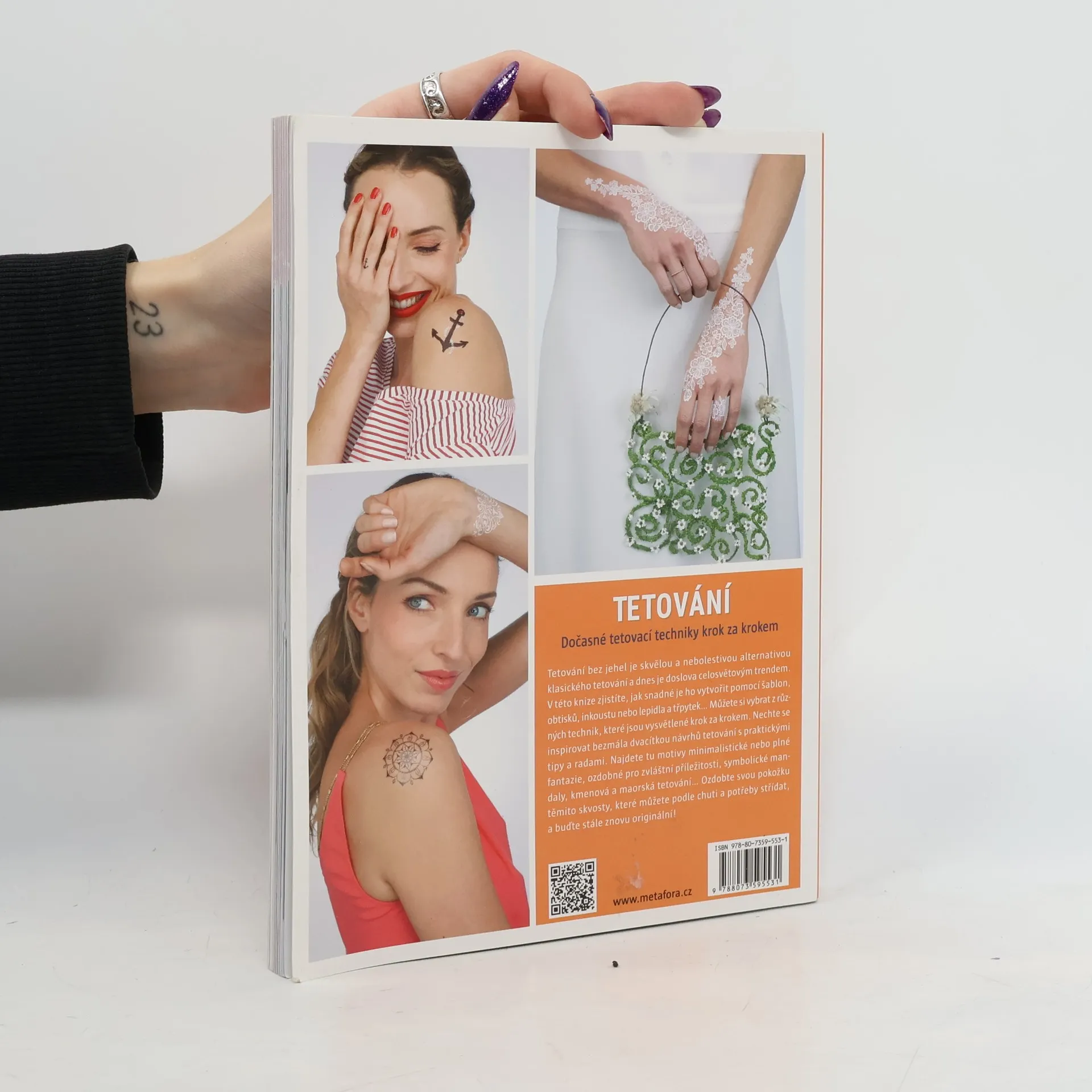 Henou, obtisky, lepidlem, inkoustem přes šablonu nebo kreslené od ruky. V této knize zjistíte, jak snadno ho vytvoříte pomocí šablon, obtisků, inkoustu nebo lepidla a třpytek… Můžete si vybrat z různých technik, které jsou srozumitelně vysvětlené krok za krokem. Nechte se inspirovat skoro dvacítkou návrhů tetování s praktickými tipy a radami. Najdete tu motivy minimalistické nebo plné fantazie, ozdobné pro zvláštní příležitosti, symbolické mandaly, kmenová a maorská tetování… Navíc: tetování bez jehel je dočasné a nezávazné. Vytetované šperky, obrazce nebo prohlášení na své kůži můžete podle chuti a potřeby střídat, a tak být stále znovu originální!