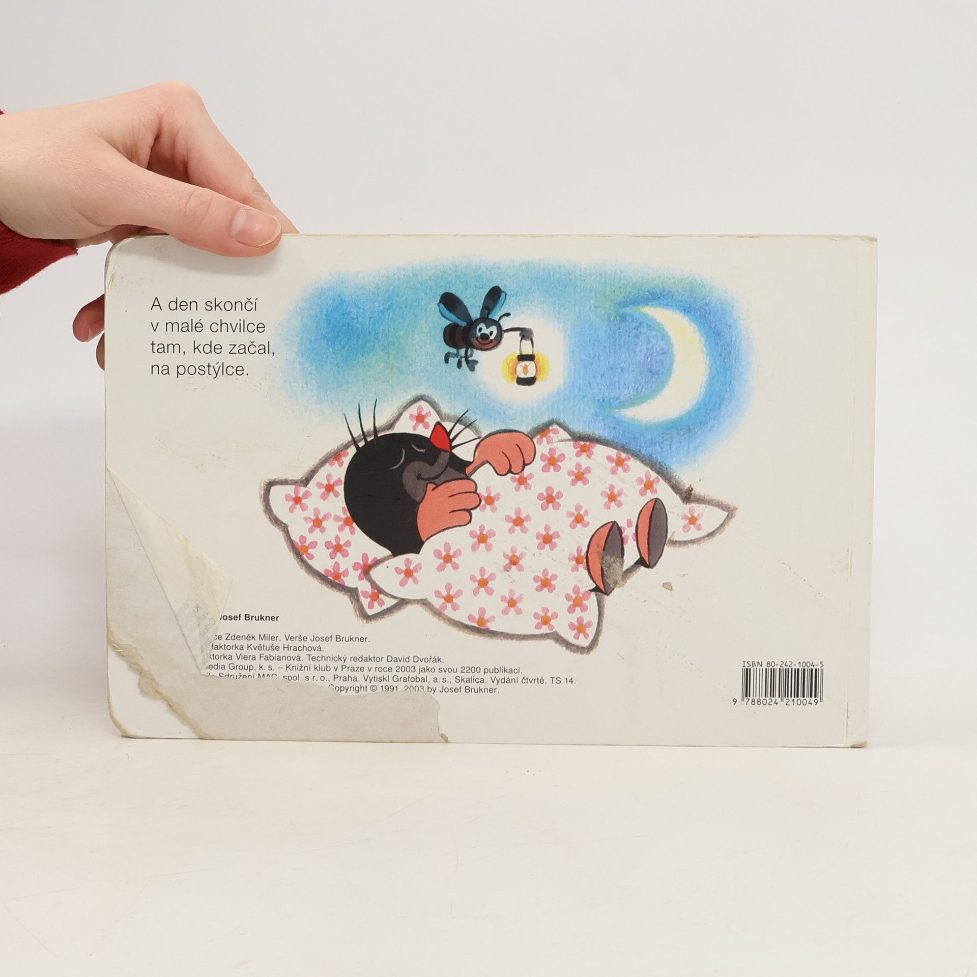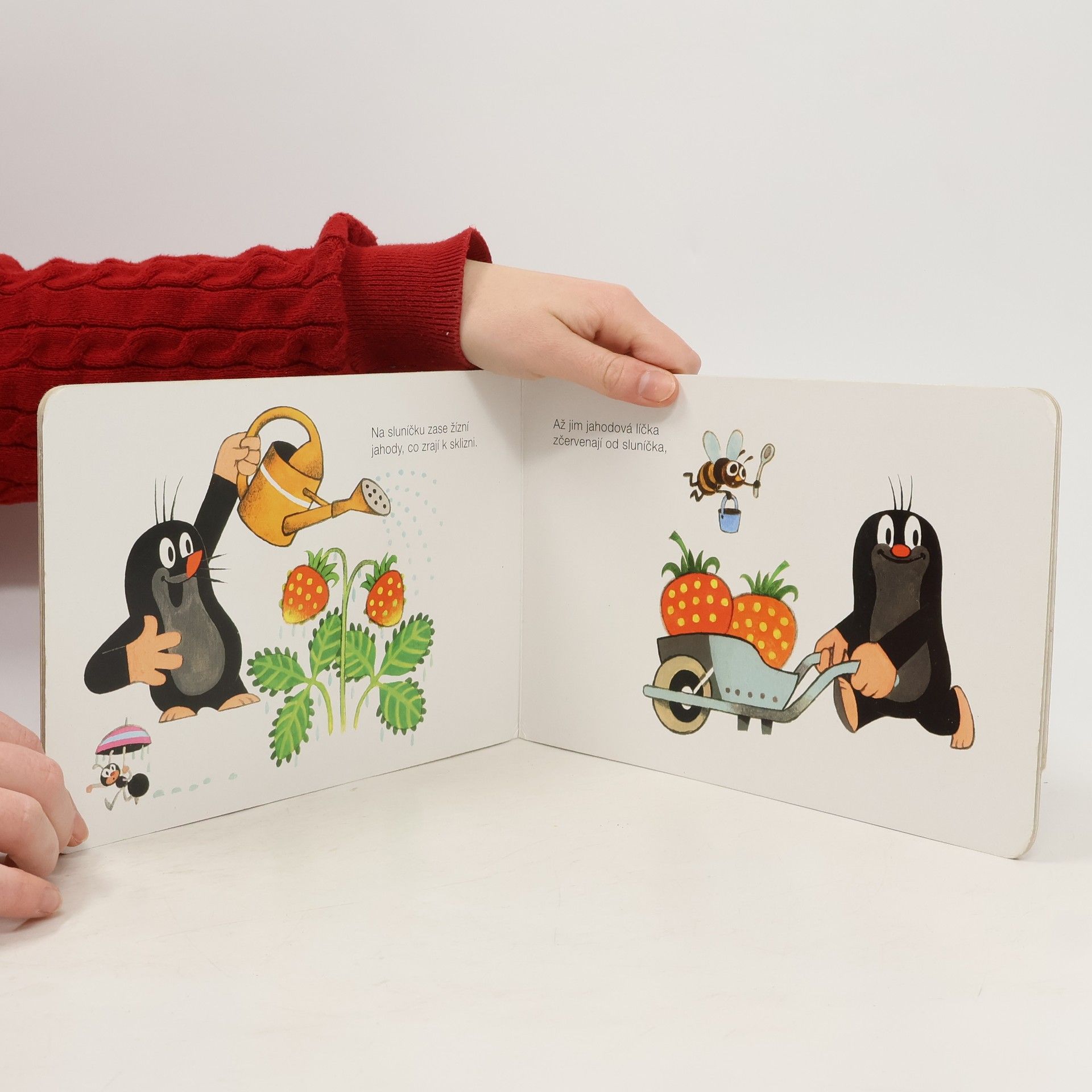 Krtka probudilo sluníčko. Bude pěkný den, a tak ho stráví na zahradě. Posnídá mrkvičku a do práce. Čekají na něj sladké jahůdky. Po dobrém obědě si odpočine, vykoupe se v rybníčku a večer znovu do postýlky. Klasické dvanáctistránkové leporelo pro nejmenší. Ilustrace Zdeňka Milera provázejí půvabné verše Josefa Bruknera.