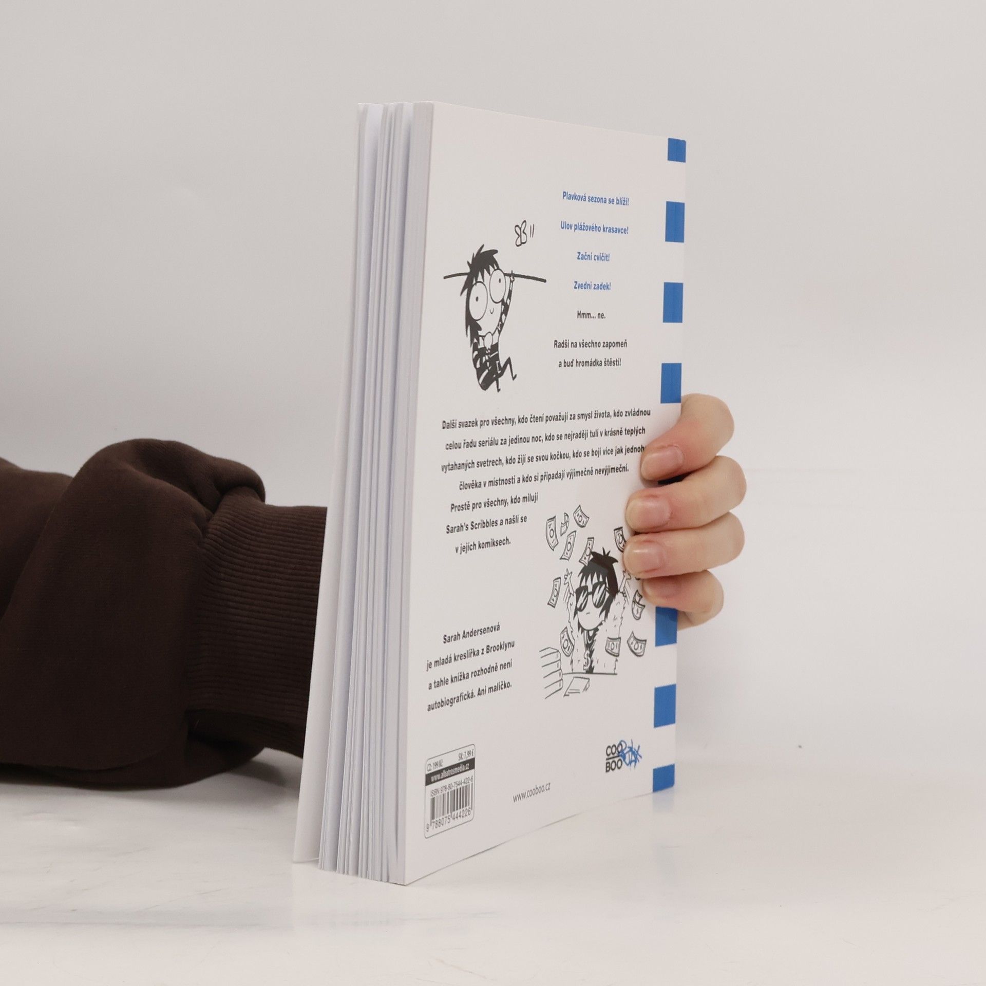 Plavková sezona se blíží! Ulov plážového krasavce! Začni cvičit! Zvedni zadek! Hmm... ne. Radši na všechno zapomeň a buď hromádka štěstí! „Další várka skvělých internetových stripů!“ Další svazek pro všechny, kdo čtení považují za smysl života, kdo zvládnou celou řadu seriálu za jedinou noc, kdo se nejraději tulí v krásně teplých vytahaných svetrech, kdo žijí se svou kočkou, kdo se bojí více jak jednoho člověka v místnosti a kdo si připadají výjimečně nevýjimeční. Prostě pro všechny, kdo milují Sarah's Scribbles a našli se v jejích komiksech.