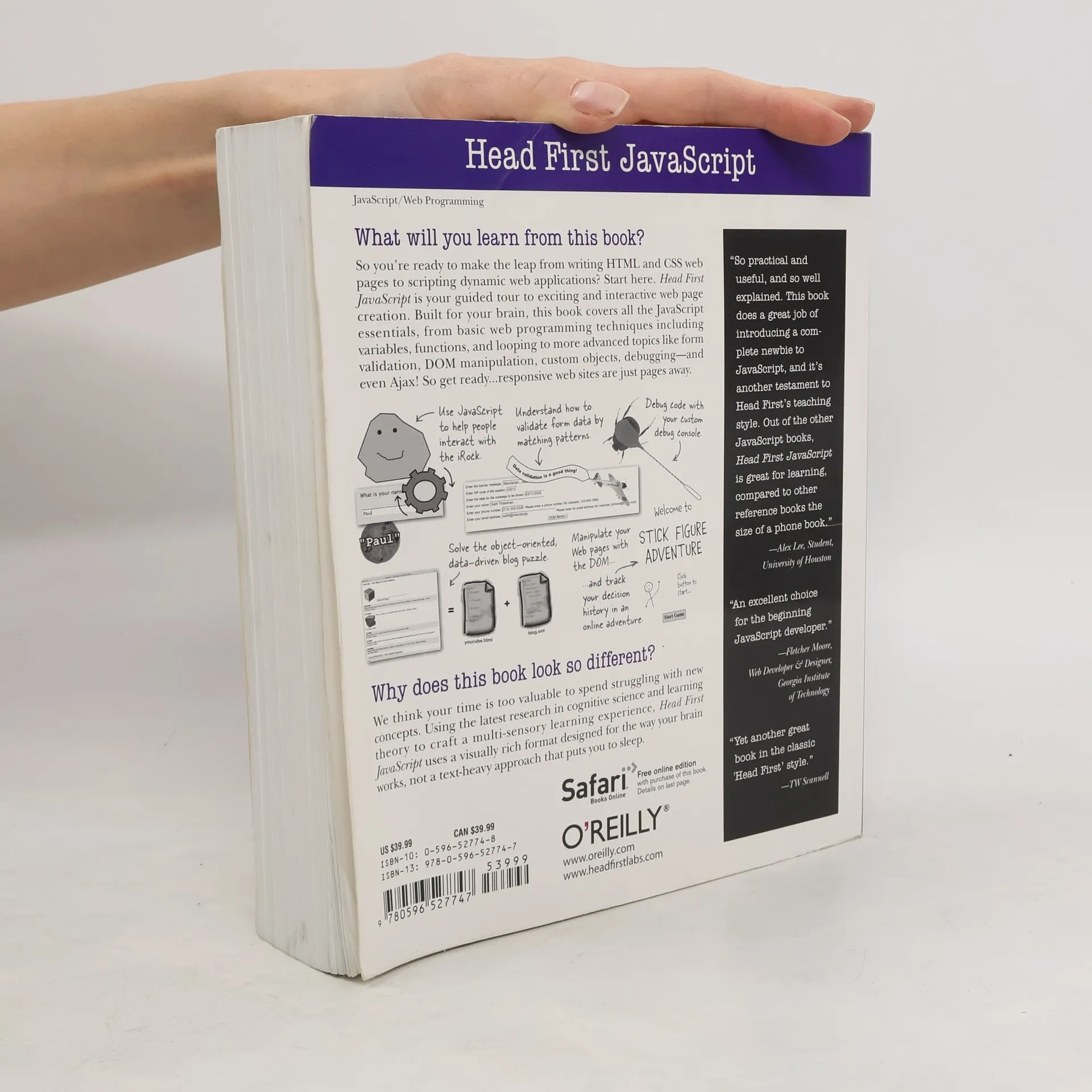 Please note: This book is no longer in print and has been replaced by Head First JavaScript Programming.So you're ready to make the leap from writing HTML and CSS web pages to creating dynamic web applications. You want to take your web skills to the next level. And you're finally ready to add "programmer" to the resume. It sounds like you're ready to learn the Web's hottest programming language: JavaScript. Head First JavaScript is your ticket to going beyond copying and pasting the code from someone else's web site, and writing your own interactive web pages.With Head First JavaScript, you learn: If you've ever read a Head First book, you know what to expect -- a visually rich format designed for the way your brain works. Head First JavaScript is no exception. It starts where HTML and CSS leave off, and takes you through your first program into more complex programming concepts -- like working directly with the web browser's object model and writing code that works on all modern browsers.Don't be intimidated if you've never written a line of code before! In typical Head First style, Head First JavaScript doesn't skip steps, and we're not interested in having you cut and paste code. You'll learn JavaScript, understand it, and have a blast along the way. So get ready... dynamic and exciting web pages are just pages away.