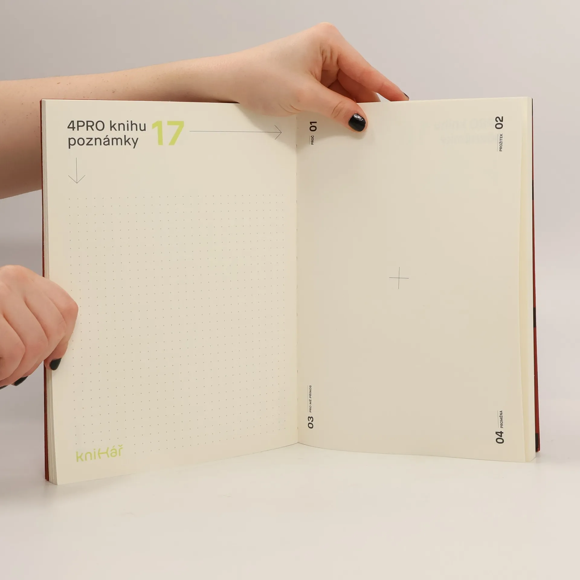 Knihář je moderní čtenářský deník. Jeho inteligence se jmenuje 4PRO – 4 jednoduché otázky, díky kterým si knihu zapamatujete a posunete svůj život tam, kam si přejete. Navíc je Knihář designový kousek z ekologického papíru s poctivou gramáží a s příměsí organických materiálů. A díky speciální otevřené vazbě s prošívaným hřbetem si užijete pohodlné poznámky na dokonale ploché dvoustránce!