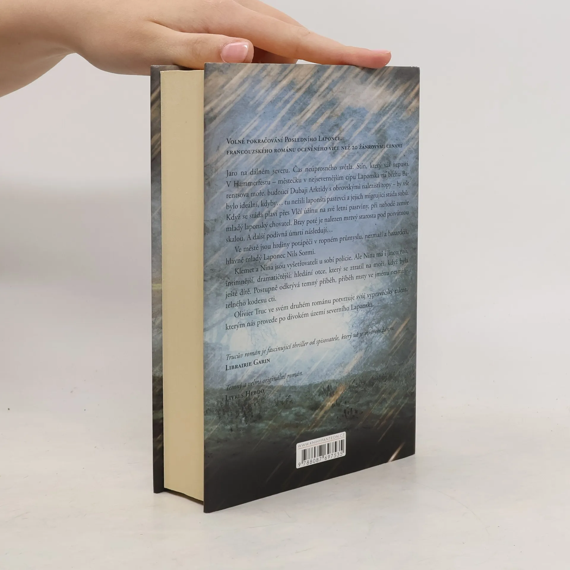 Volné pokračování POSLEDNÍHO LAPONCE, francouzského románu oceněného více než 20 žánrovými cenami. Jaro na dálném severu. Čas neúprosného světla. Stín, který vás nepustí. V Hammerfestu – městečku v nejsevernějším cípu Laponska na břehu Barentsova moře, budoucí Dubaji Arktidy s obrovskými nalezišti ropy – by vše bylo ideální, kdyby… tu nežili laponští pastevci a jejich migrující stáda sobů. Když stáda plavou přes Vlčí průliv na své letní pastviny, při nehodě zemře mladý laponský chovatel. Brzy poté je nalezen mrtvý starosta pod posvátnou skalou. A další podivná úmrtí pokračují… Ve městě jsou hrdiny potápěči v ropném průmyslu, nezmaři a hazardéři, hlavně mladý Laponec Nils Sormi. Klemet a Nina jsou vyšetřovateli u sobí policie. Ale Nina má jinou roli, intimnější, dramatičtější: hledání otce, který se ztratil na moři, když byla ještě dítě. Odhalí temný příběh spřádaný pomstou na pozadí nesmiřitelného kodexu cti. Olivier Truc ve svém druhém románu potvrzuje svůj vypravěčský talent, kterým nás provede po divokém území severního Laponska.