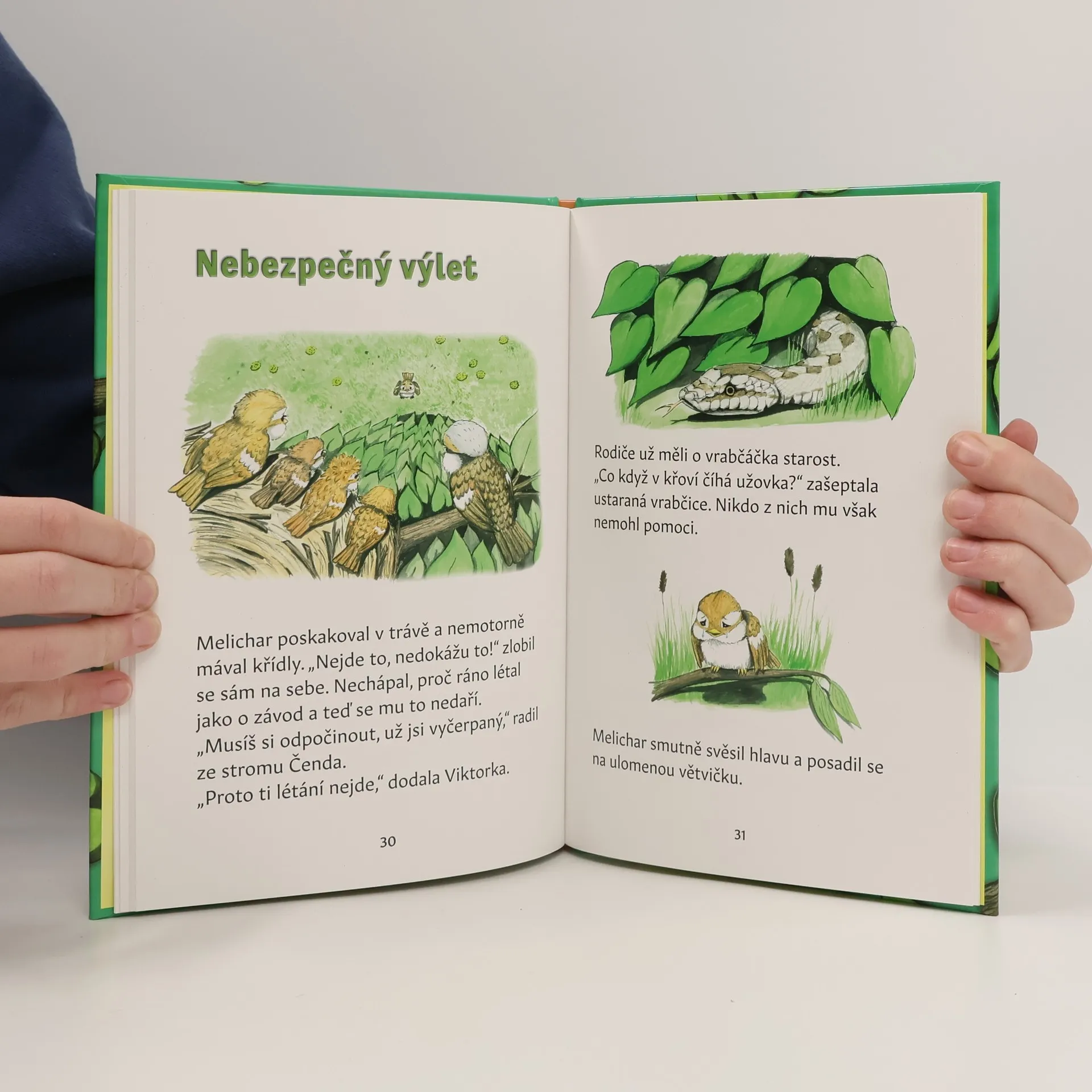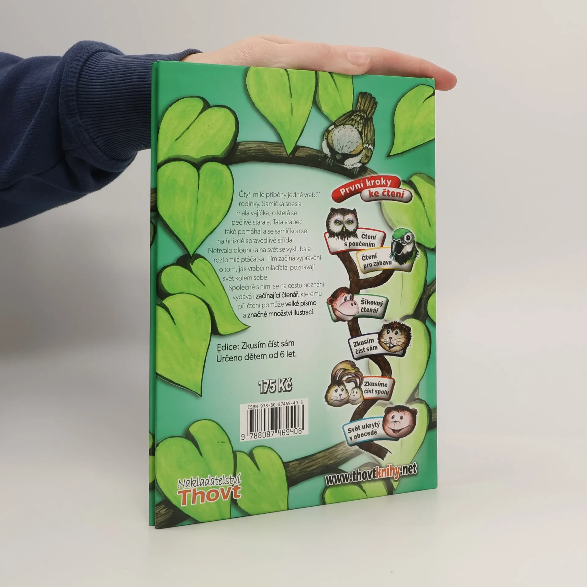 Čtyři milé příběhy jedné vrabčí rodinky. Samička snesla malá vajíčka, o která se pečlivě starala. Táta vrabec také pomáhal a se samičkou se na hnízdě spravedlivě střídal. Netrvalo dlouho a na svět se vyklubala roztomilá ptáčátka. Tím začíná vyprávění o tom, jak vrabčí mláďata poznávají svět kolem sebe. Společně s nimi se na cestu poznání vydává i začínající čtenář, kterému při čtení pomůže velké písmo a značné množství ilustrací.Určeno dětem od 6 let.