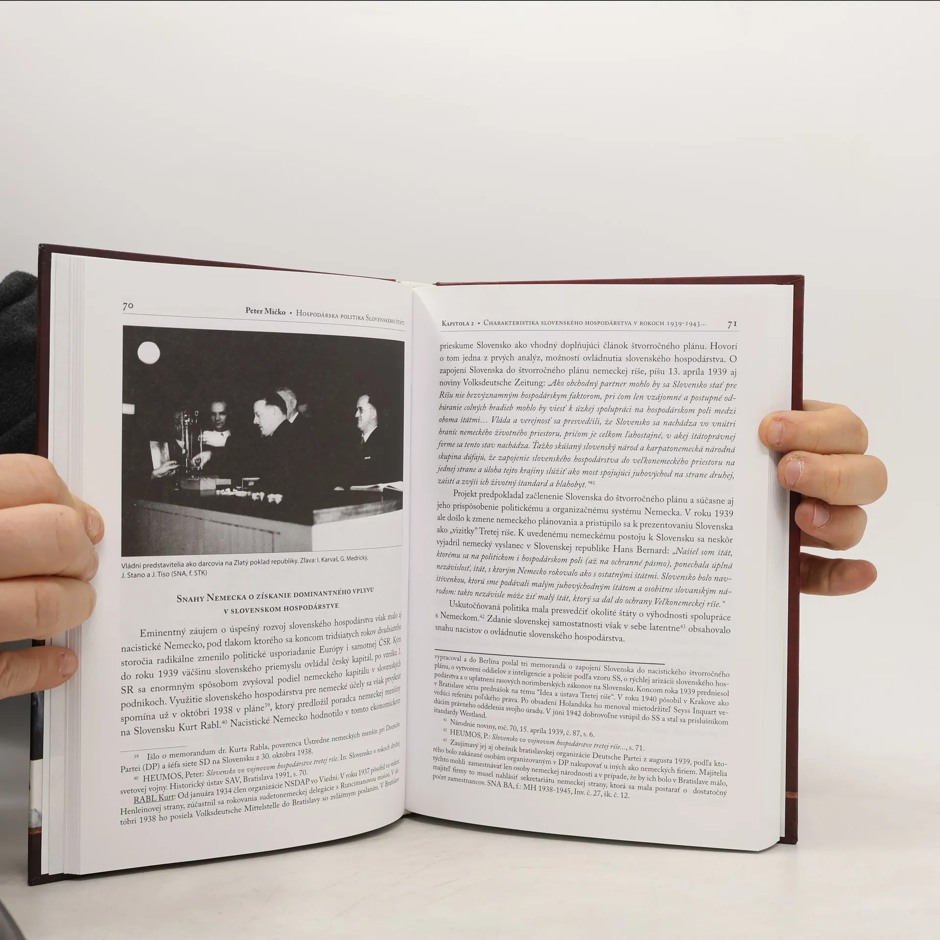 Kapitoly z hospodárskych dejín Slovenska v rokoch 1938 - 1945. Úvodná kapitola vykresľuje pomerne málo známe postavenie slovenského hospodárstva v období existencie druhej Č-SR. Druhá – najrozsiahlejšia kapitola mapuje jednotlivé odvetvia slovenskej ekonomiky (finančný sektor, zahraničný obchod, poľnohospodárstvo, či najdôležitejšie odvetvia slovenského priemyslu) a ich vzťah k Nemecku v rokoch 1939 – 1943. Tretia a štvrtá kapitola sa konkrétne venujú dôležitým faktorom slovenského hospodárstva, ktorými boli odchod slovenských robotníkov za prácou do Nemecka a arizácia židovských podnikov. Monografiu uzatvára piata kapitola o stagnácii a úpadku hospodárstva prvej Slovenskej republiky v rokoch 1944/1945. Na doplnenie komplexnej charakteristiky hospodárskeho sektoru v uvedenom časovom období je súčasťou záverečnej kapitoly aj podkapitola o hospodárskej situácii povstaleckého územia počas bojov s nemeckými jednotkami. Text vhodne dopĺňajú fotografie slovenských závodov, výstavba infraštruktúry, či dôležitých osobností hospodárskeho života.