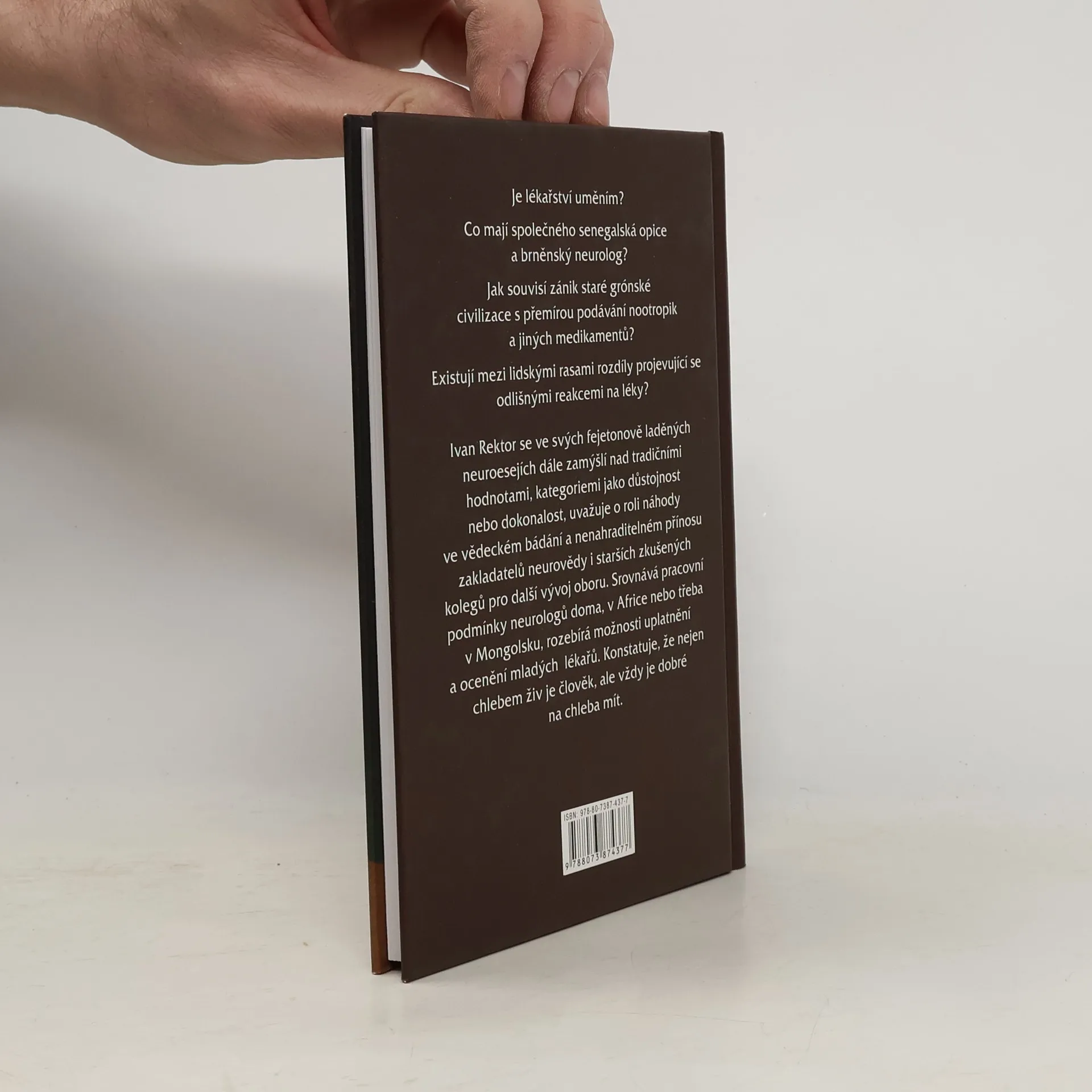 Je lékařství uměním? Co mají společného senegalská opice a brněnský neurolog? Jak souvisí zánik staré grónské civilizace s přemírou podávání nootropik a jiných medikamentů? Existují mezi lidskými rasami rozdíly projevující se mj. odlišnými reakcemi na léky? Ivan Rektor se ve svých fejetonově laděných neuroesejích dále zamýšlí nad tradičními hodnotami, kategoriemi jako důstojnost nebo dokonalost, uvažuje o roli náhody ve vědeckém bádání a nenahraditelném přínosu zakladatelů neurovědy i starších zkušených kolegů pro další vývoj oboru. Srovnává pracovní podmínky neurologů doma, v Africe nebo třeba v Mongolsku, rozebírá možnosti uplatnění a ocenění mladých lékařů. Konstatuje, že nejen chlebem živ je člověk, ale vždy je dobré na chleba mít.