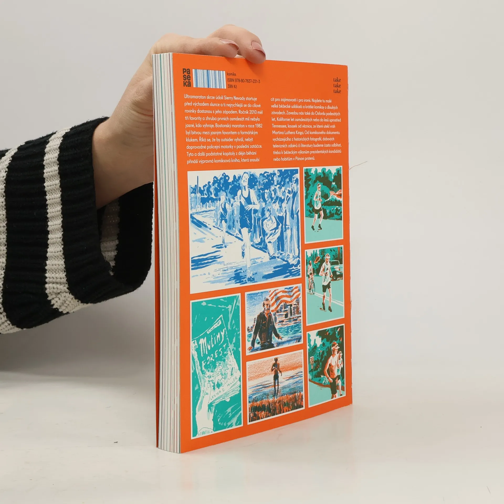 Ultramaraton skrze údolí Sierry Nevady startuje před východem slunce a ti nejrychlejší se do cílové rovinky dostanou s jeho západem. Ročník 2010 měl tři favority a zhruba prvních osmdesát mil nebylo jasné, kdo vyhraje. Bostonský maraton v roce 1982 byl bitvou mezi jasným favoritem a farmářským klukem. Říká se, že by outsider vyhrál nebýt doprovodné policejní motorky v poslední zatáčce. Tyto a další kapitoly z dějin běhání přináší výpravná komiksová kniha, která snoubí cit pro zajímavosti i pro ironii. Najdete tu malé velké běžecké události a krátké komiksy o dlouhých závodech. Zavedou nás také do Oxfordu padesátých let, Kalifornie let osmdesátých, nebo do lesů uprostřed Tennessee, kousek od věznice, ze které utekl vrah Martina Luthera Kinga. Od komiksového dokumentu vycházejícího z historických fotografií, dobových televizních záběrů či literatury budeme často odbíhat, třeba k běžeckým výkonům prezidentských kandidátů nebo hobitům v Pánovi prstenů.