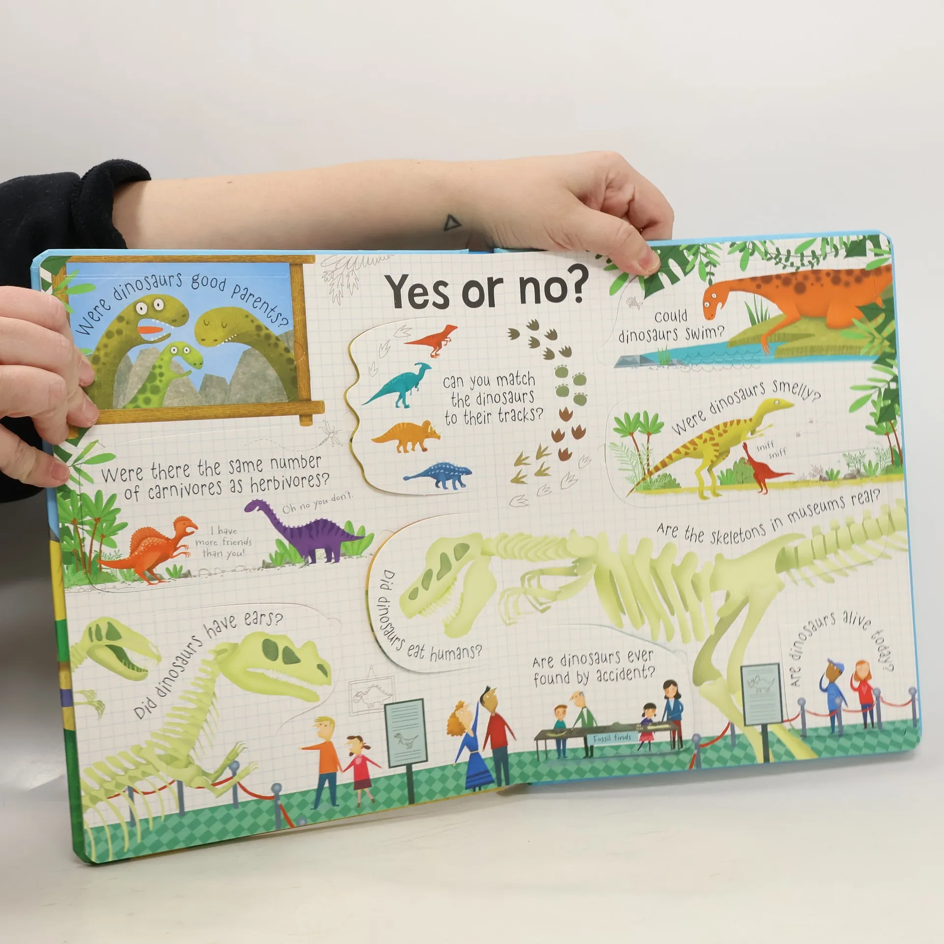 A colourful guide with over 60 flaps to lift to discover answers to questions young children might ask about dinosaurs. Provides simple, friendly and fascinating answers to questions such as "Why do dinosaurs have tricky names?", "Could dinosaurs swim?", "How big was the biggest dinosaur?" and lots more. Includes a guide to some of the more difficult to pronounce dinosaur names. With Usborne Quicklinks to specially selected websites where children can find out more about dinosaurs.