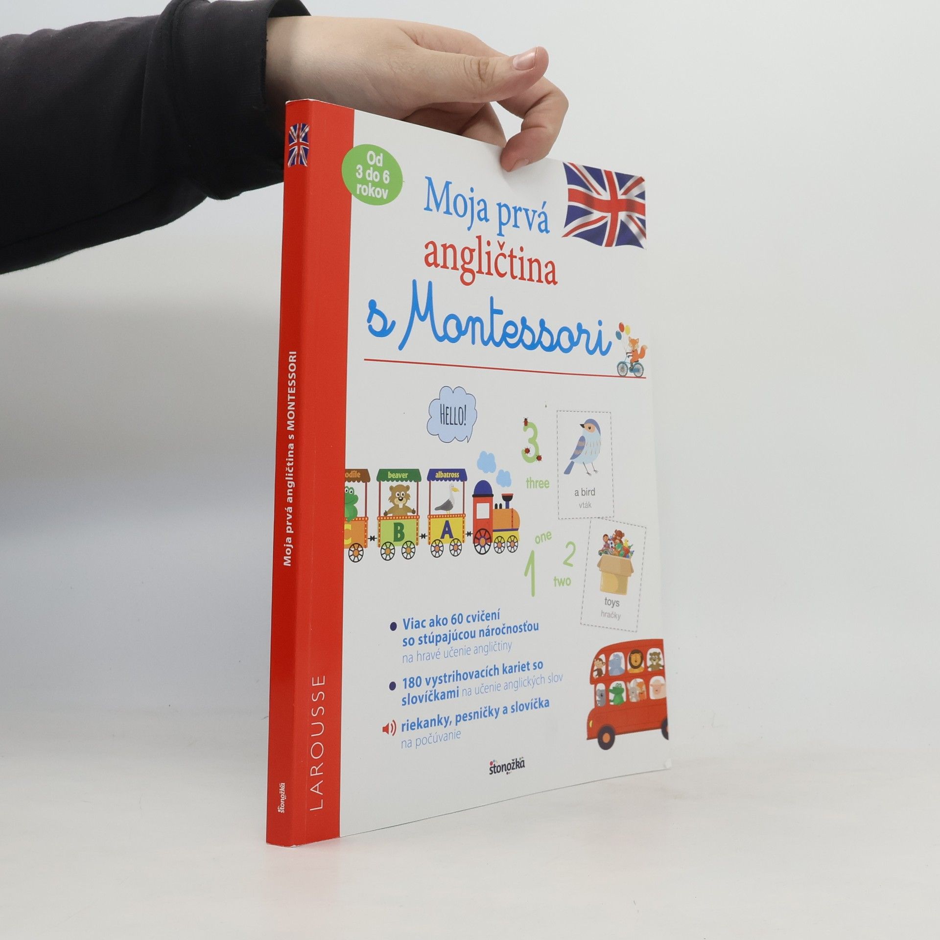 Vitajte v našom programe Montessori, ktorý ponúka viac ako 60 rôznych cvičení so zvyšujúcou sa náročnosťou. Vďaka nim objavia deti od 3 do 6 rokov základnú slovnú zásobu anglického jazyka. Na uľahčenie prvých dotykov s angličtinou náš program využíva karty so slovíčkami •Na konci zošita nájdete kartičky, ktoré si môžete vystrihnúť a uschovať. Ponúkame vám 20 strán s 9 kartičkami na témy: rodina, oblečenie, telo, jedlo, atď. Každá z nich má na jednej strane obrázok a na druhej anglické slovíčko a jeho slovenský preklad. •Tieto kartičky budete používať pri práci na našich obrázkových stranách. Dieťa sa bude učiť slovíčka metódou troch krokov: ,,Listen and touch“ (vďaka nahrávkam, ktoré si môžete stiahnuť na www.editions-larousse.fr), ,,Touch and say“ a ,,What is it?“.