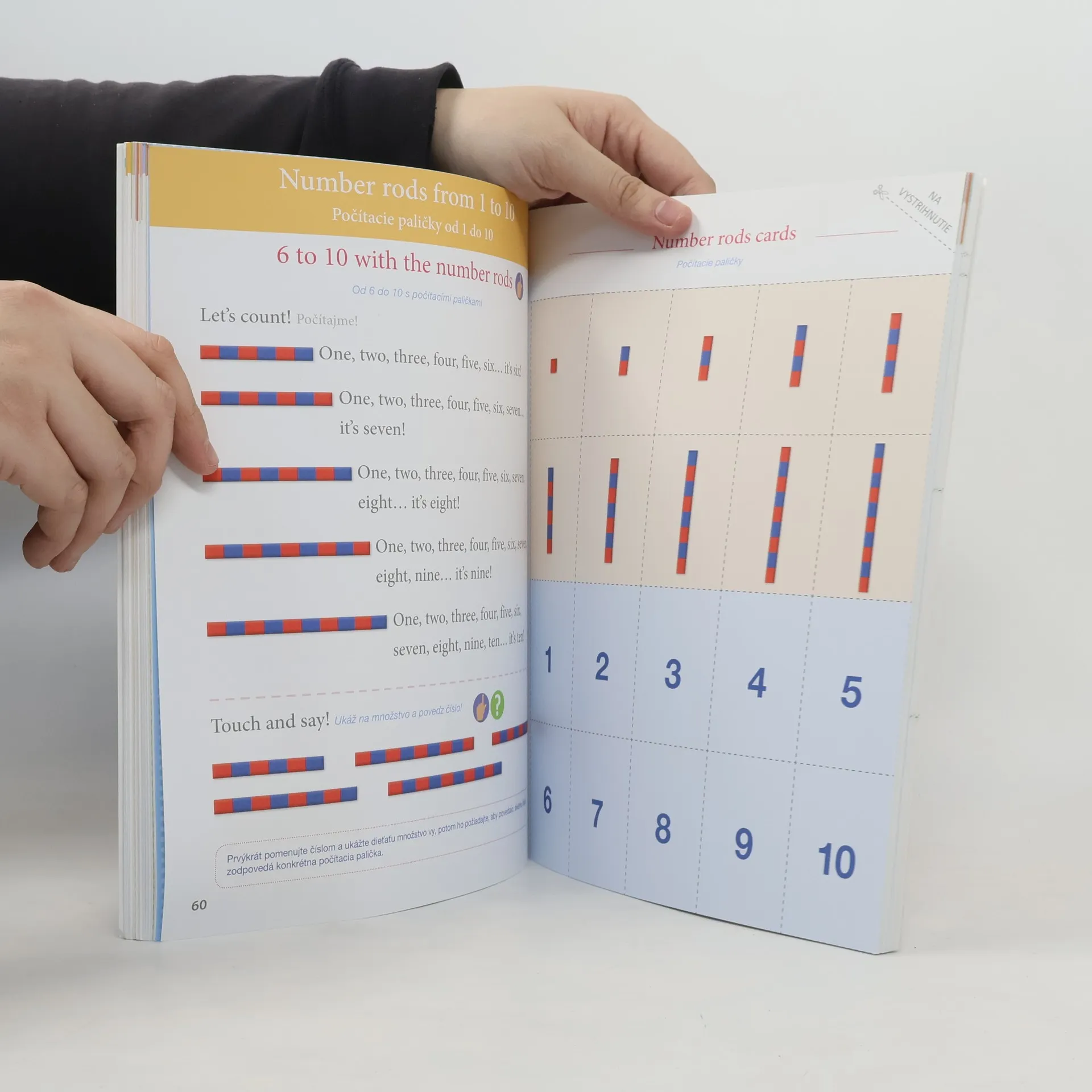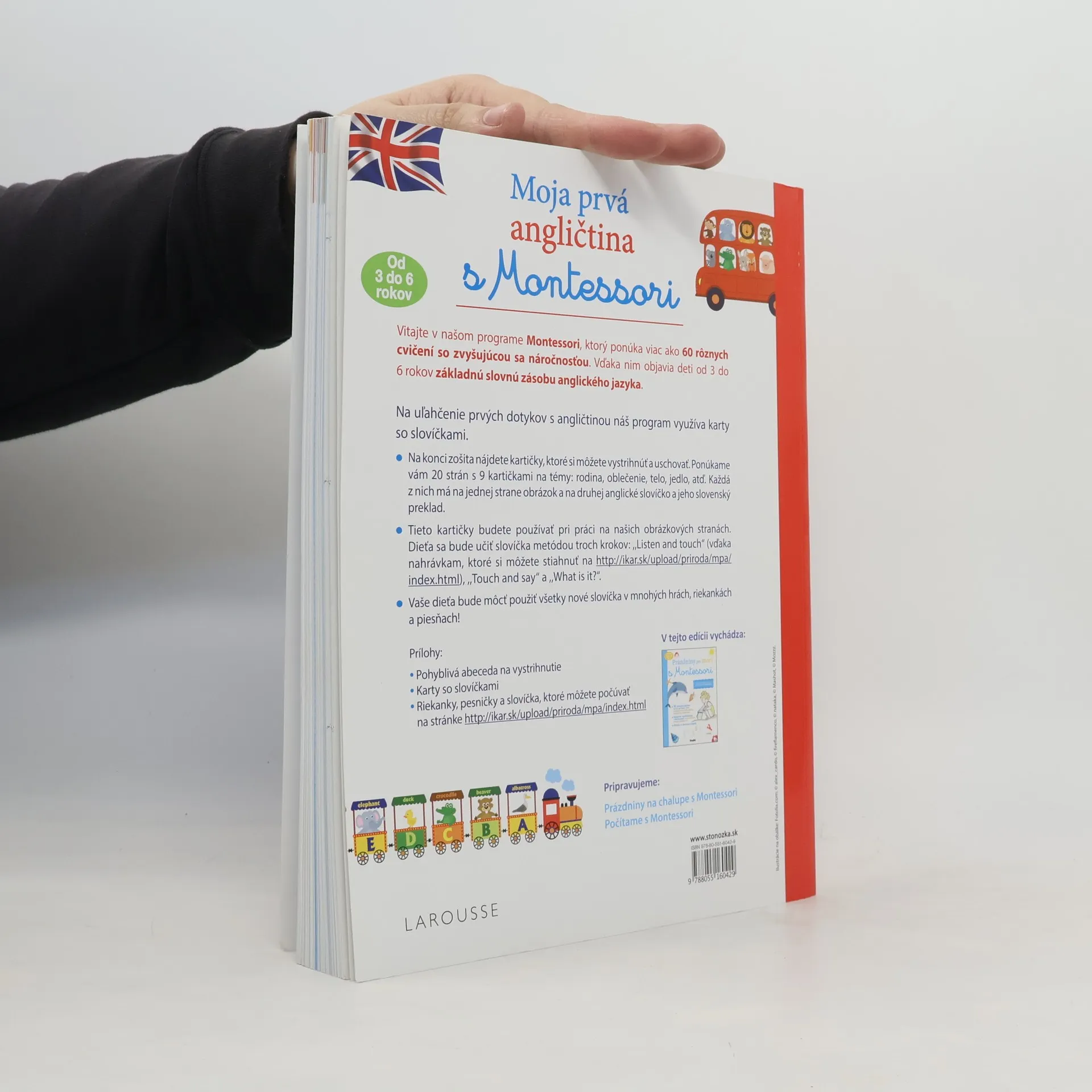 Vitajte v našom programe Montessori, ktorý ponúka viac ako 60 rôznych cvičení so zvyšujúcou sa náročnosťou. Vďaka nim objavia deti od 3 do 6 rokov základnú slovnú zásobu anglického jazyka. Na uľahčenie prvých dotykov s angličtinou náš program využíva karty so slovíčkami •Na konci zošita nájdete kartičky, ktoré si môžete vystrihnúť a uschovať. Ponúkame vám 20 strán s 9 kartičkami na témy: rodina, oblečenie, telo, jedlo, atď. Každá z nich má na jednej strane obrázok a na druhej anglické slovíčko a jeho slovenský preklad. •Tieto kartičky budete používať pri práci na našich obrázkových stranách. Dieťa sa bude učiť slovíčka metódou troch krokov: ,,Listen and touch“ (vďaka nahrávkam, ktoré si môžete stiahnuť na www.editions-larousse.fr), ,,Touch and say“ a ,,What is it?“.