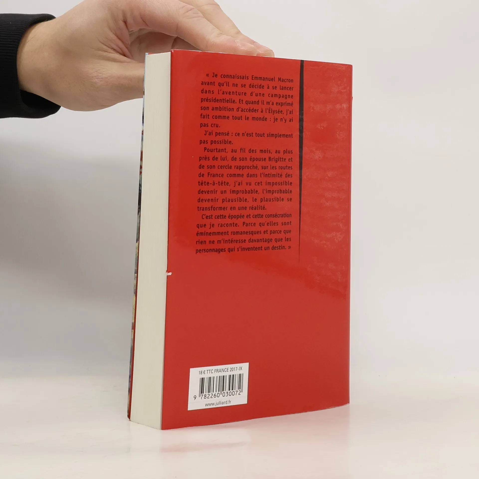 " Je connaissais Emmanuel Macron avant qu'il ne se décide à se lancer dans l'aventure d'une campagne présidentielle. Et quand il m'a exprimé son ambition d'accéder à l'Elysée, j'ai fait comme tout le monde : je n'y ai pas cru. J'ai pensé : ce n'est tout simplement pas possible. Pourtant, au fil des mois, au plus près de lui, de son épouse Brigitte et de son cercle rapproché, sur les routes de France comme dans l'intimité des tête-à-tête, j'ai vu cet impossible devenir un improbable, l'improbable devenir plausible, le plausible se transformer en une réalité. C'est cette épopée et cette consécration que je raconte. Parce qu'elles sont éminemment romanesques et parce que rien ne m'intéresse davantage que les personnages qui s'inventent un destin. "
