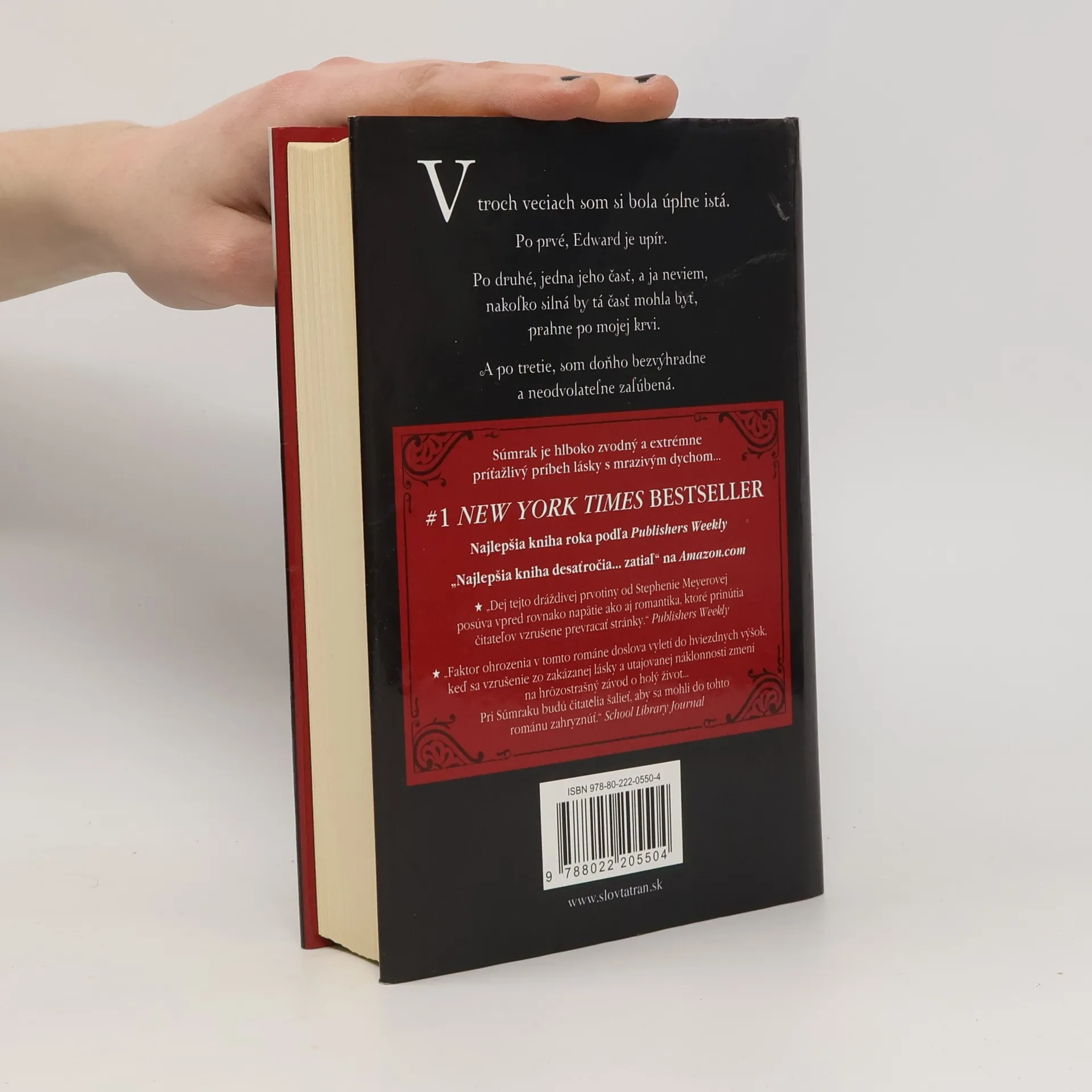 Súmrak od Stephenie Meyerovej bol po svojom vydaní mimoriadne úspešný a prilákal množstvo nadšených čitateľov. Hoci je určený mladšej vekovej kategórii, román si získal aj staršie generácie, pričom sa dostal až k babičkám. Publishers Weekly ho označil za najlepšiu knihu roka, získal ocenenie Editor's Choice v New York Times a na Amazon.com bol vyhlásený za najlepšiu knihu desaťročia. Príťažlivosť tohto diela spočíva v kombinácii shakespearovskej lásky a faktora ohrozenia, ktorý sa zintenzívňuje, keď sa zakázaná láska a utajovaná náklonnosť menia na hrôzostrašný závod o prežitie. Napätie a romantika posúvajú dej vpred a nútia čitateľov neustále otáčať stránky. Keď sa Isabella Swanová presťahuje do zamračeného Forks, stretáva záhadného Edwarda Cullena, ktorého porcelánová pokožka a nadprirodzené schopnosti ju fascinujú. Edward sa snaží skrývať svoju pravú identitu, no Bella je odhodlaná odhaliť jeho temné tajomstvo. Čím bližšie sa k nemu dostáva, tým väčšiemu riziku vystavuje seba aj svojich blízkych. Na návrat už môže byť neskoro… Súmrak je zvodný a napínavý román, ktorý čitateľa doslova priklincuje, až kým neotočí poslednú stránku.