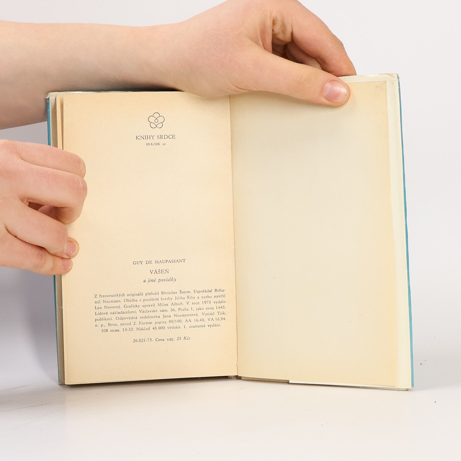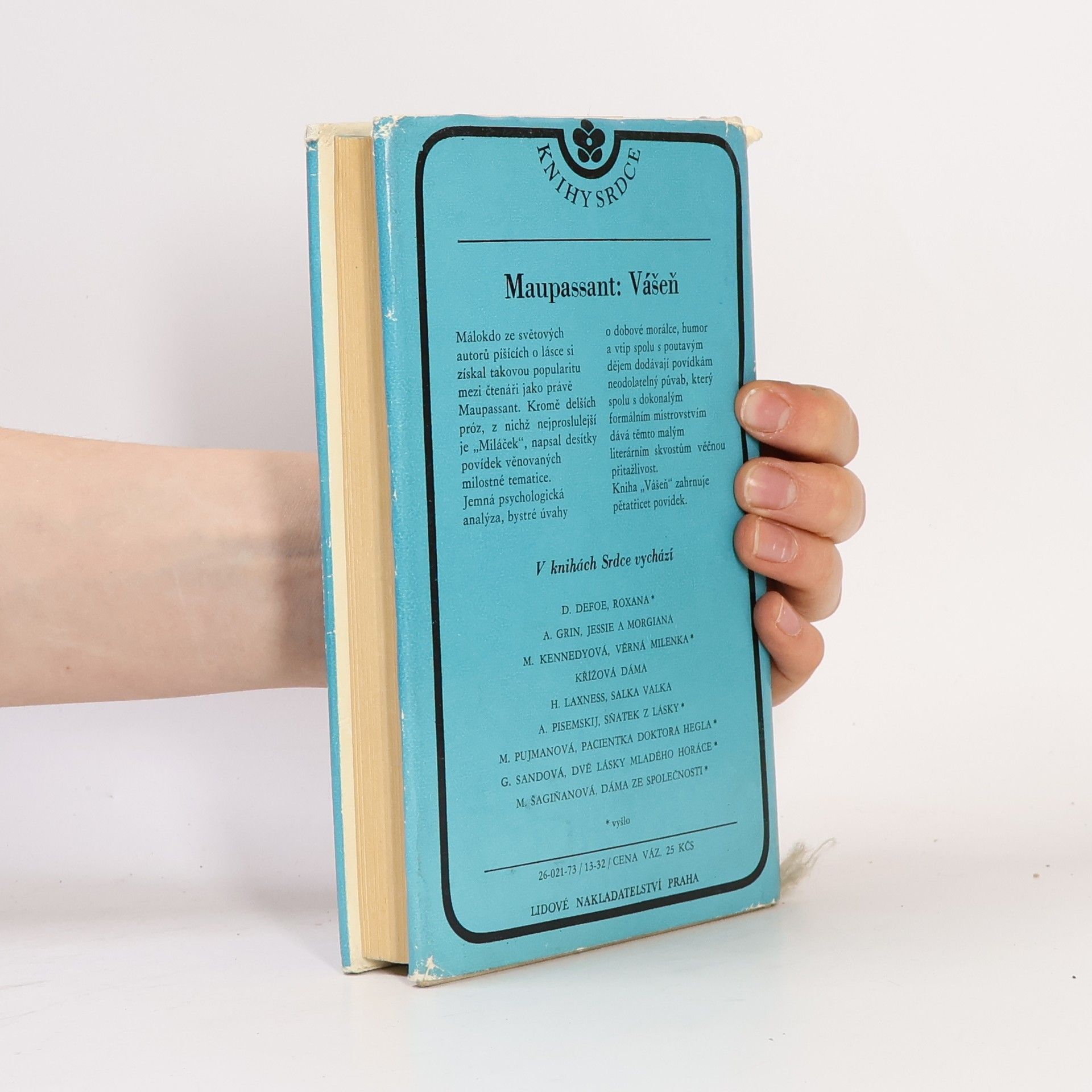 Soubor povídek věnovaných milostné tematice (Vášeň, Vyplétačka, Lůžko 29, Miss Harrietová, Alexandr, Noc u mrtvé, Modelka, Naše dopisy, Závěť, Pan Iokaste, Poustevník, Paní Parisová, Kulhanka, Lítost, Hrobničky, Znamení, Baronka, Pokoj 11, Mrtvá, Neužitečná krása, Otec a syn, Vdova, Měsíční svit, Boitelle, Pan Parent, Misti, Dítě, Šálí, Z cest, Slečna Perla, Babiččiny rady, Rez, Maska, Berta, Muška). Mistrovsky napsané příběhy o lásce vynikají poutavým dějem, přinášejí jemnou psychologickou analýzu postav a vypovídají s humorem a vtipem o dobové morálce. 1. vydání v tomto uspořádání. Na obálce pouze „Vášeň“, na titulní straně „Vášeň a jiné povídky“.
