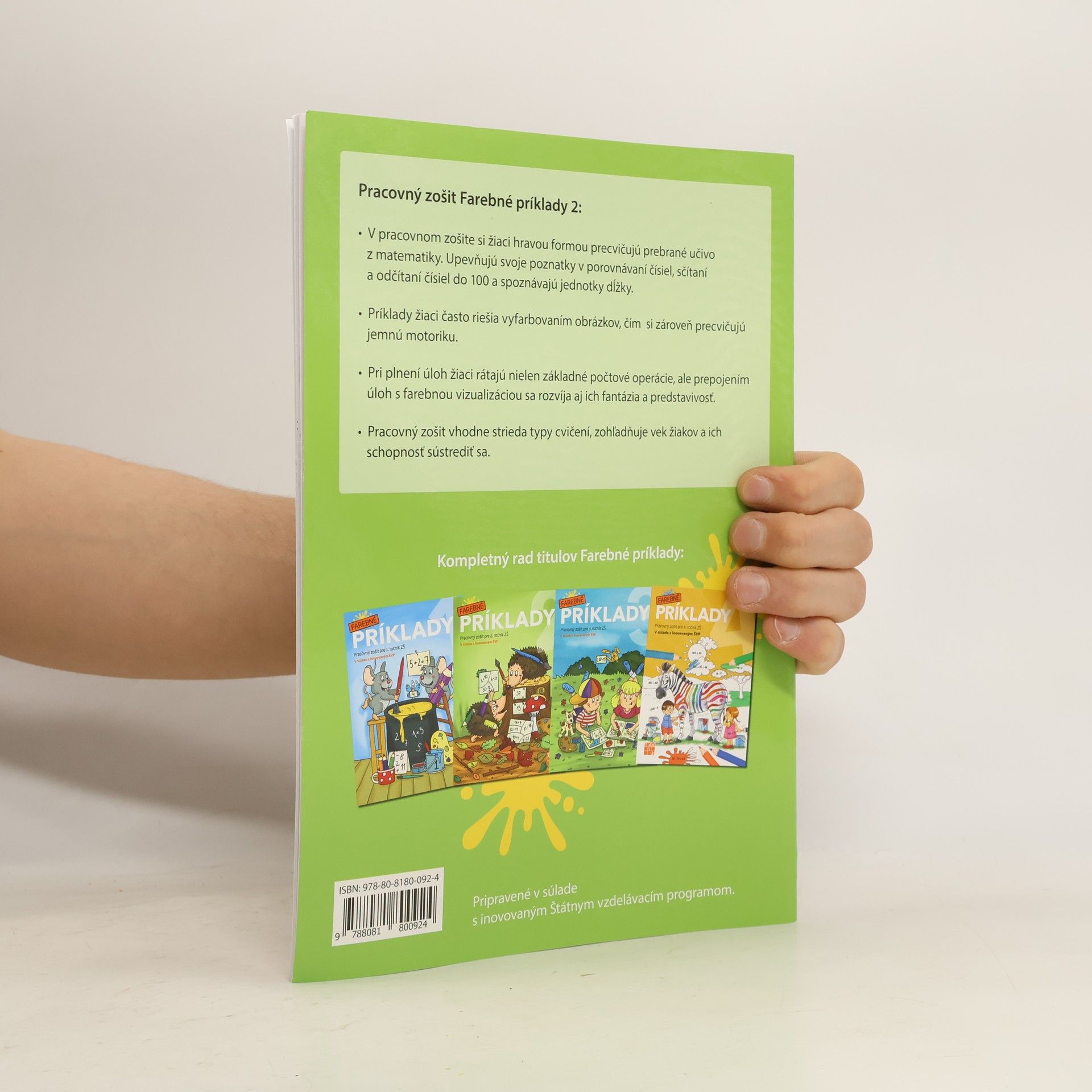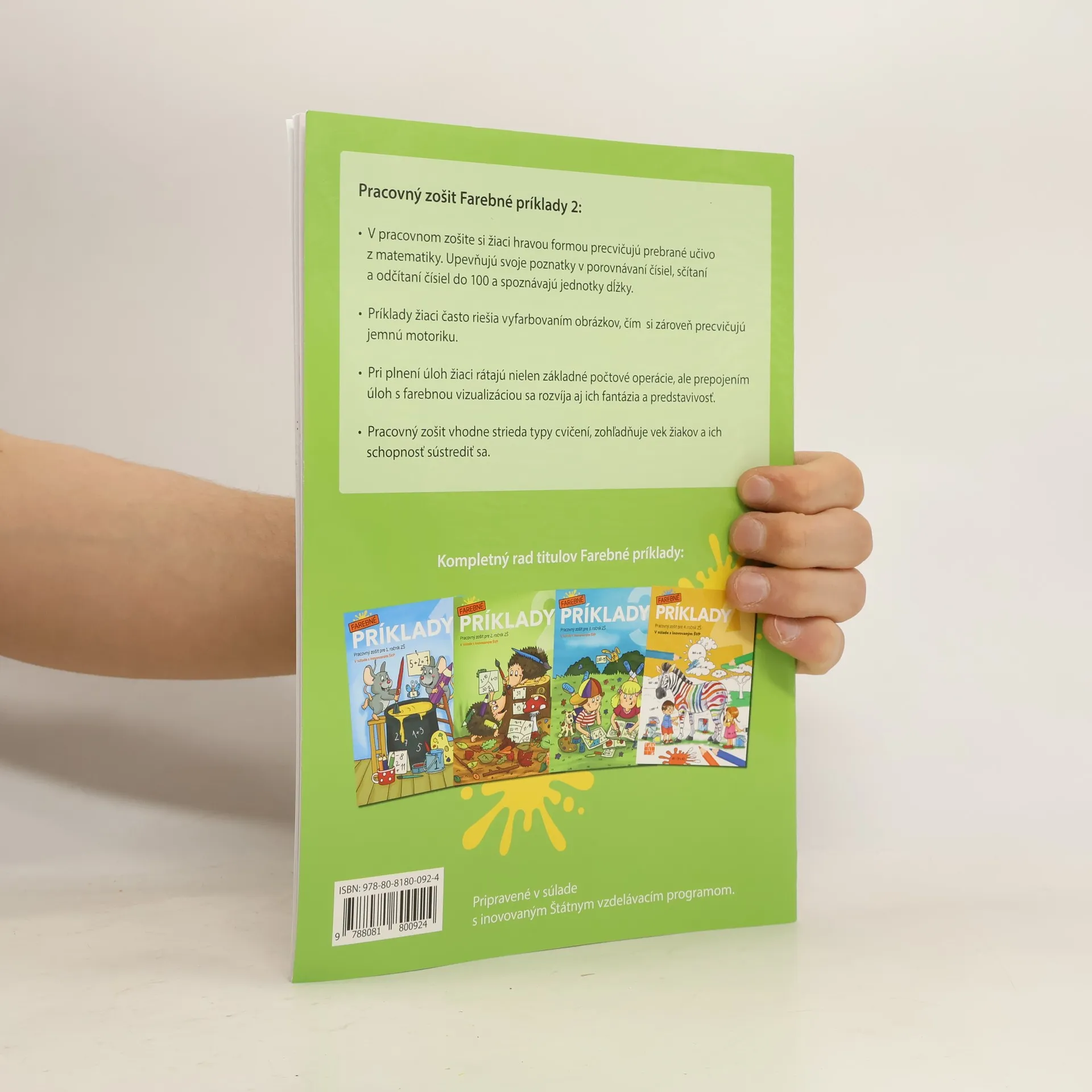 V pracovnom zošite si žiaci hravou formou precvičujú prebrané učivo z matematiky. Upevňujú svoje poznatky v porovnávaní čísiel, sčítaní a odčítaní čísiel do 100 a spoznávajú jednotky dĺžky. Príklady žiaci často riešia vyfarbovaním obrázkov, čím si zároveň precvičujú jemnú motoriku. Pri plnení úloh žiaci rátajú nielen základné počtové operácie, ale prepojením úloh s farebnou vizualizáciou sa rozvíja aj ich fantázia a predstavivosť. Pracovný zošit vhodne strieda typy cvičení, zohľadňuje vek žiakov a ich schopnosť sústrediť sa.