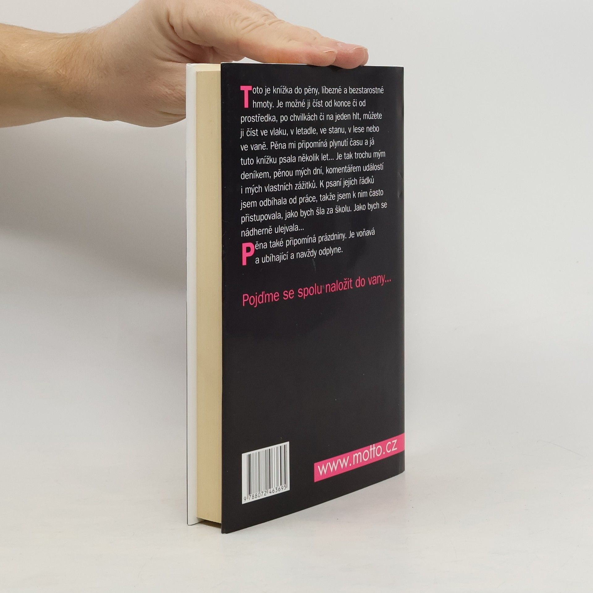 Toto je knížka do pěny, líbezné a bezstarostné hmoty. Je možné ji číst od konce či od prostředka, po chvilkách či na jeden hlt, můžete ji číst ve vlaku, v letadle, ve stanu, v lese nebo ve vaně. Pěna mi připomíná plynutí času a já tuto knížku psala několik let. Je tak trochu mým deníkem, pěnou mých dní, komentářem událostí i mých vlastních zážitků. K psaní jejích řádků jsem odbíhala od práce, takže jsem k nim často přistupovala, jako bych šla za školu. Jako bych se nádherně ulejvala. Pěna také připomíná prázdniny. Je voňavá a ubíhající a navždy odplyne. Pojďme se spolu naložit do vany.