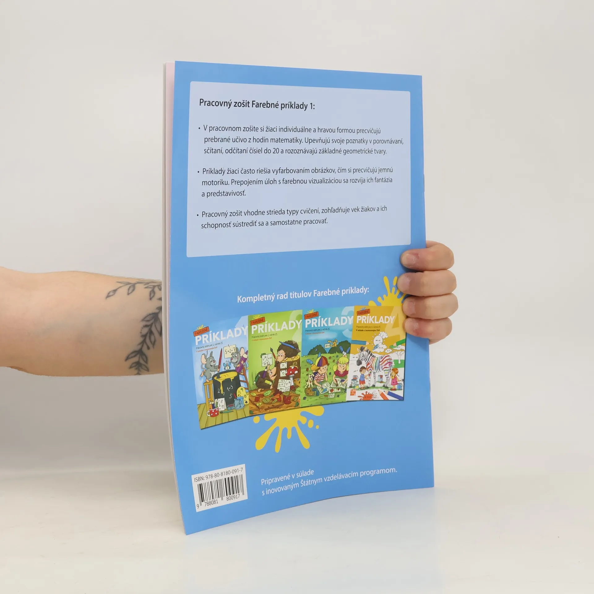 V pracovnom zošite si žiaci individuálne a hravou formou precvičujú prebrané učivo z hodín matematiky. Upevňujú svoje poznatky v porovnávaní, sčítaní, odčítaní čísiel do 20 a rozoznávajú základné geometrické tvary. Príklady žiaci často riešia vyfarbovaním obrázkov, čím si precvičujú jemnú motoriku. Prepojením úloh s farebnou vizualizáciou sa rozvíja ich fantázia a predstavivosť. Pracovný zošit vhodne strieda typy cvičení, zohľadňuje vek žiakov a ich schopnosť sústrediť sa a samostatne pracovať.