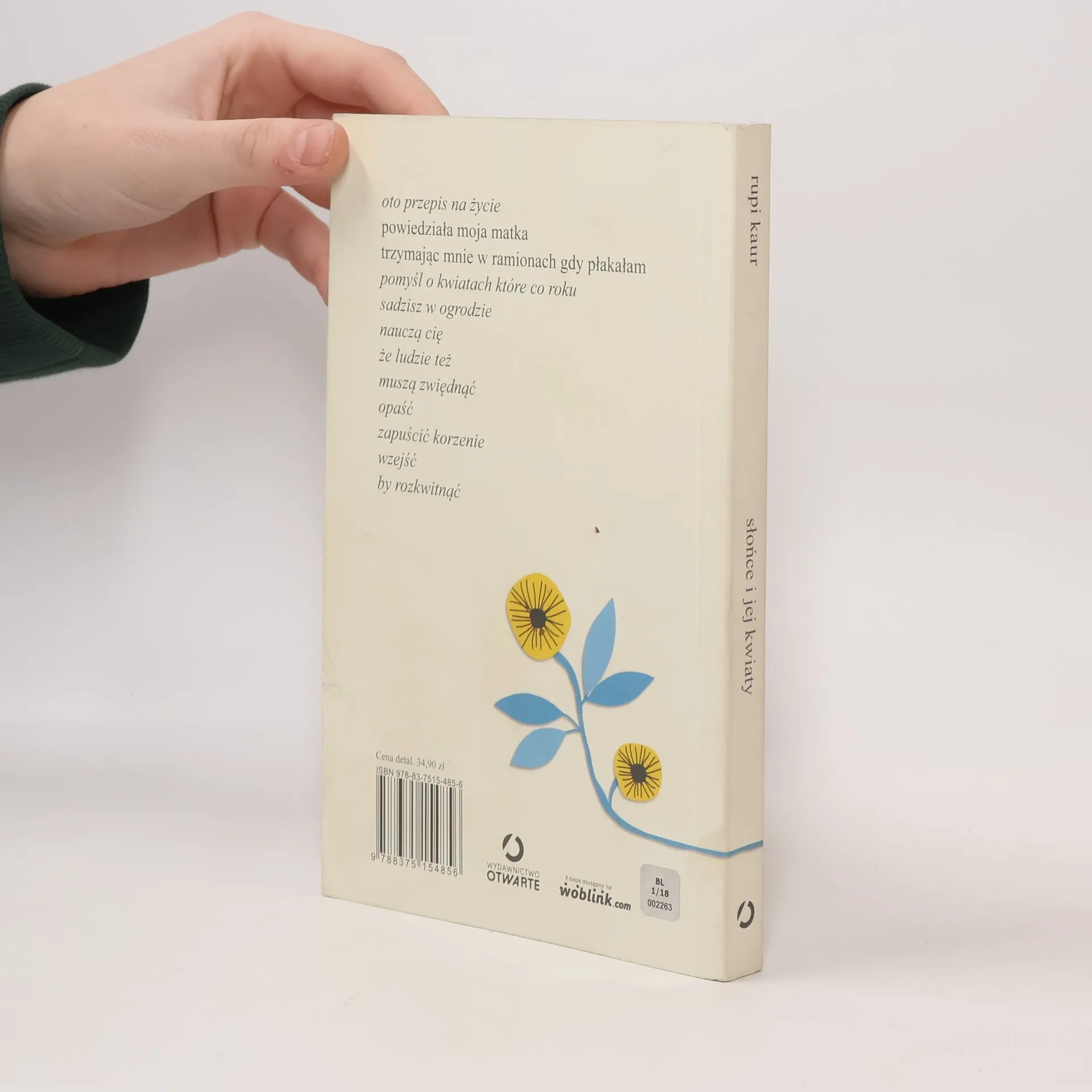 „Słońce i jej kwiaty” to tętniące kobiecością utwory o dojrzewaniu i samoświadomości. Rupi Kaur ponownie – lecz z jeszcze większą mocą – w krótkich poetyckich formach wyraża troski, pragnienia i radości wielu kobiet. Daje im siłę, by czerpały ze swoich korzeni i doświadczeń pełnymi garściami. Przekonuje, że podobnie jak kwiaty ludzie też muszą czasem zwiędnąć, by rozkwitnąć na nowo.