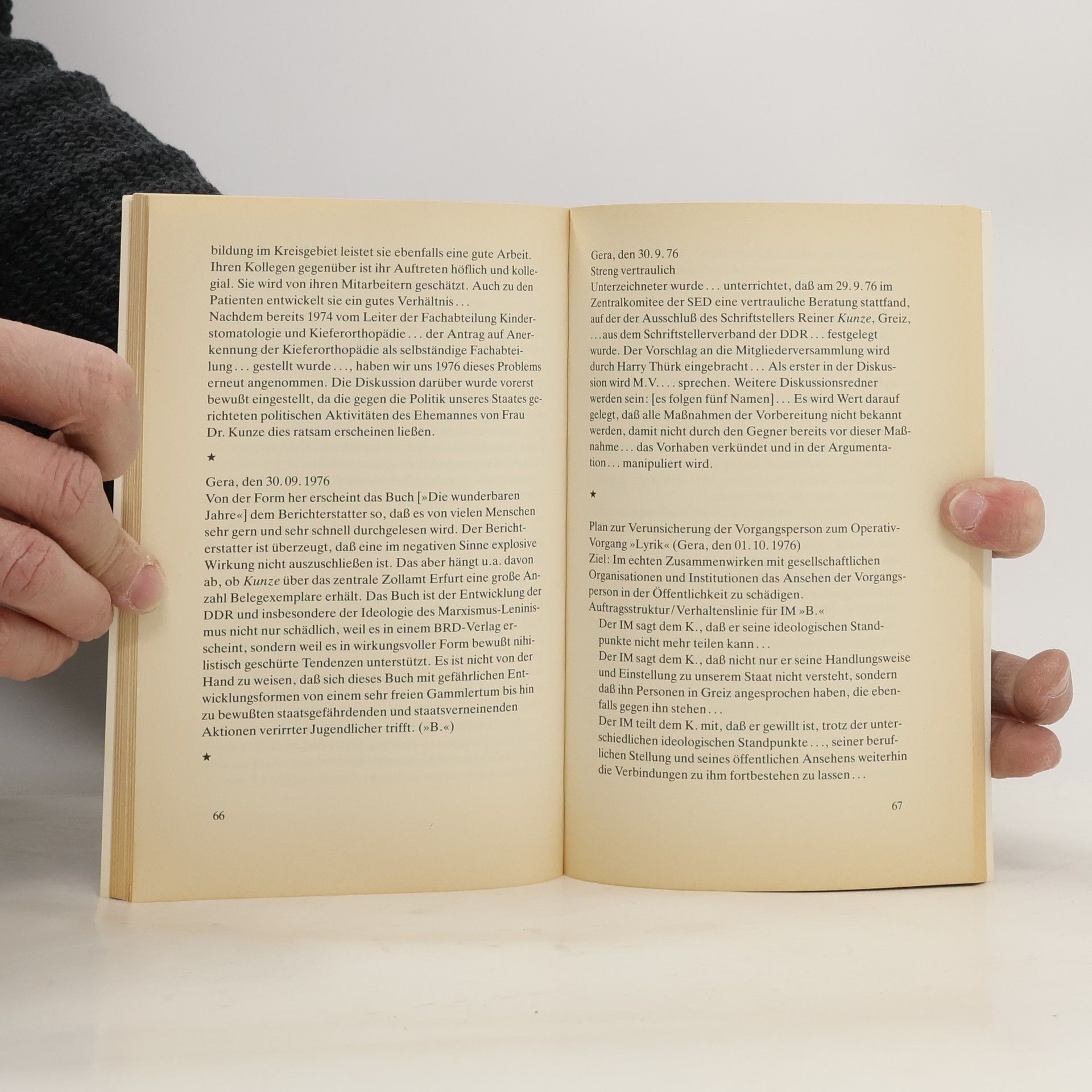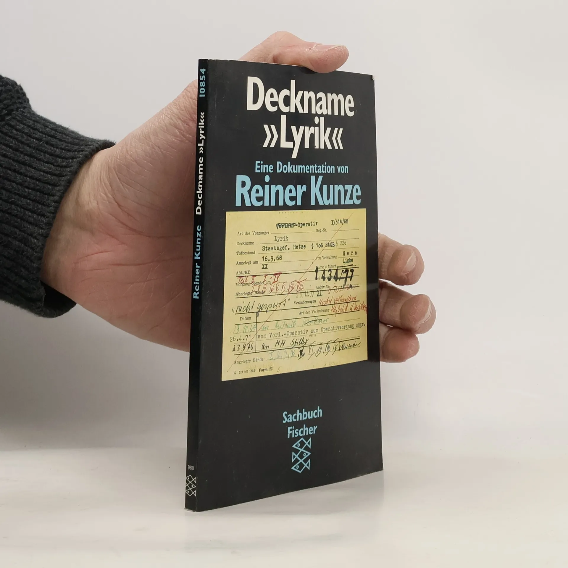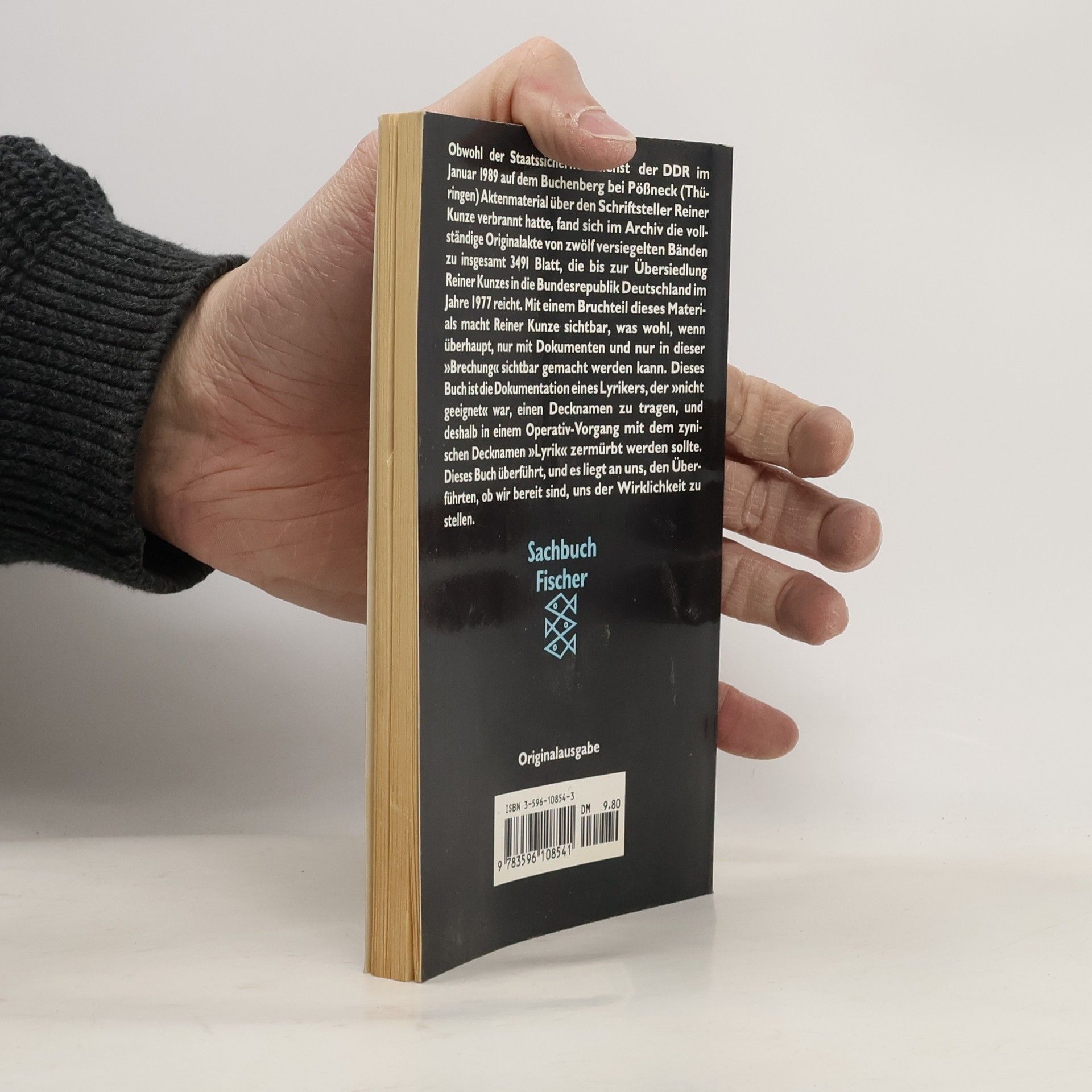 Obwohl der Staatssicherheitsdienst der DDR im Januar 1990 auf dem Buchenberg bei Pößneck (Thüringen) Aktenmaterial über den Schriftsteller Reiner Kunze verbrannt hatte, fand sich im Archiv die vollständige Originalakte von zwölf versiegelten Bän-den zu insgesamt 3491 Blatt, die bis zur Übersiedlung Reiner Kunzes in die Bundesrepublik Deutschland im Jahre 1977 reicht. Mit einem Bruchteil dieses Materials macht Reiner Kunze sichtbar, was wohl, wenn überhaupt, nur mit Dokumenten und nur in dieser »Brechung« sichtbar gemacht werden kann. Dieses Buch ist die Dokumentation eines Lyrikers, der »nicht geeignet« war, einen Decknamen zu tragen, und deshalb in einem Operativ-Vorgang mit dem zynischen Deck-namen »Lyrik« zermürbt werden sollte. Dieses Buch überführt, und es liegt an uns, den Überführten, ob wir bereit sind, uns der Wirklichkeit zu stellen.