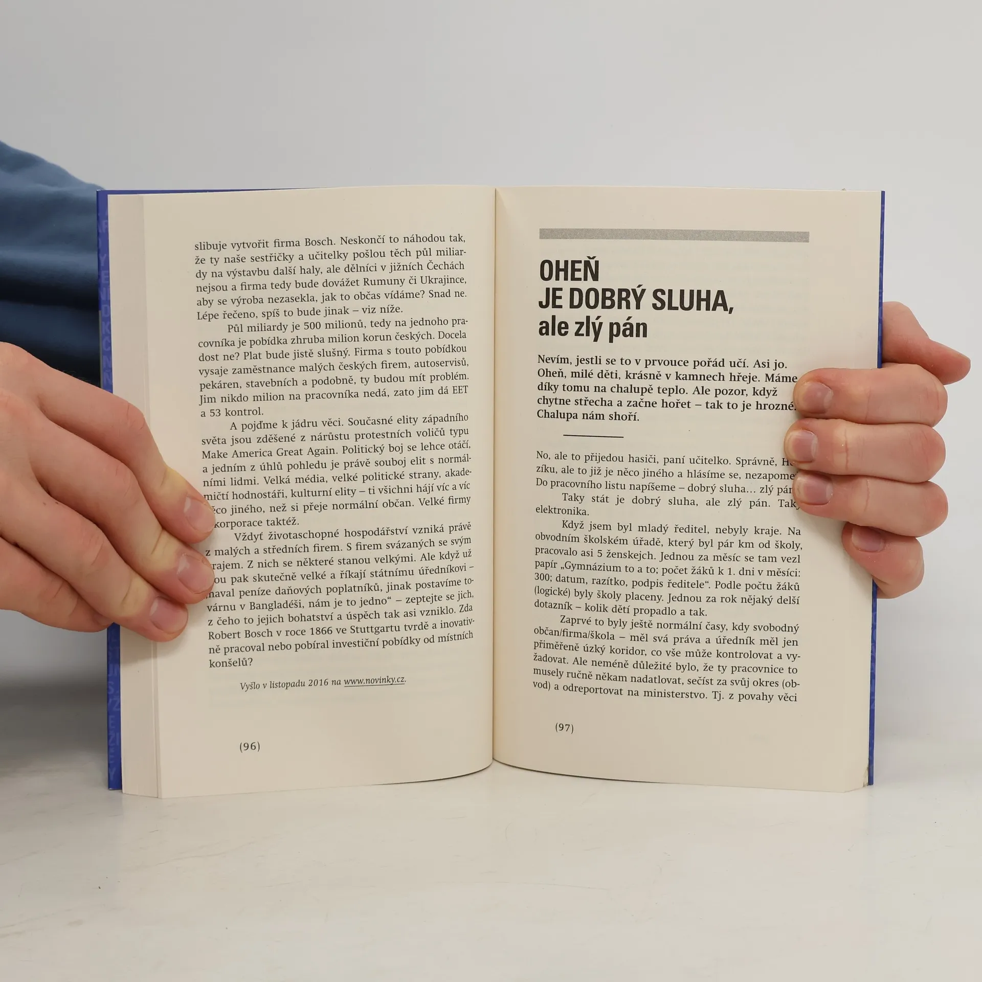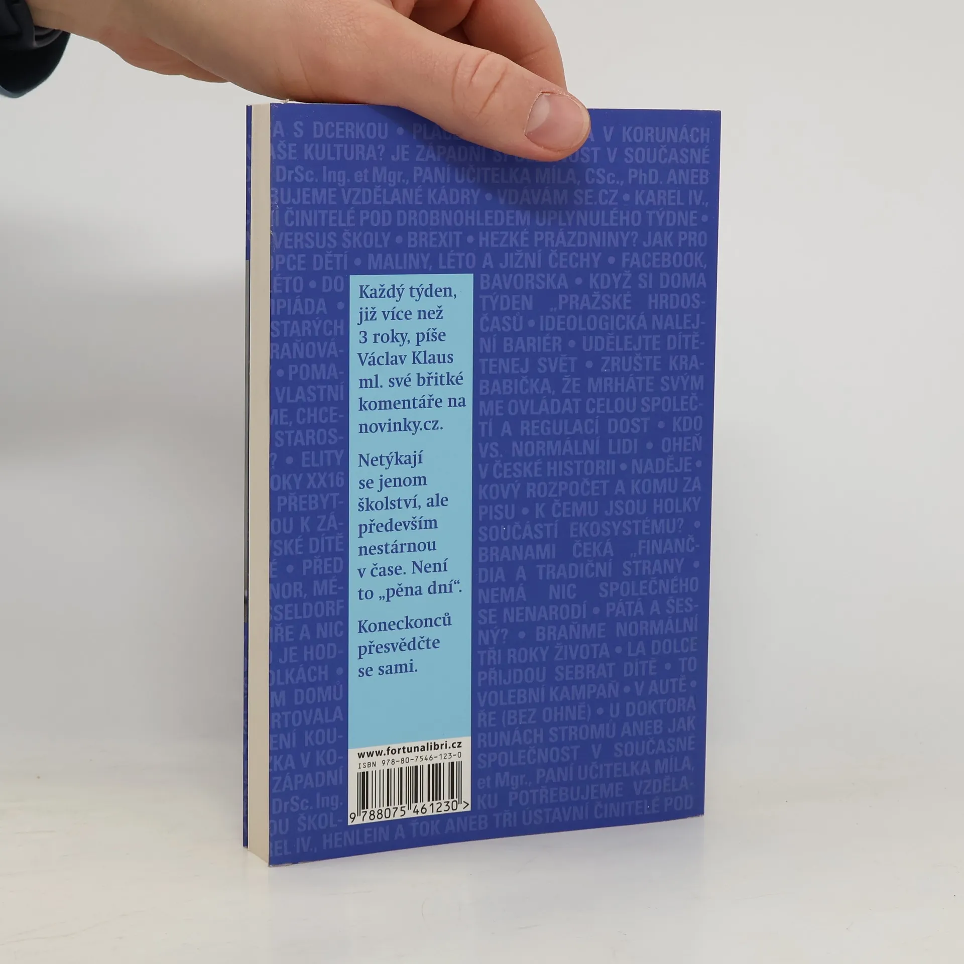 Každý týden, již více než 3 roky, píše Václav Klaus ml. své břitké komentáře na novinky.cz. Netýkají se jenom školství, ale především nestárnou v čase. Není to "pěna dní". Koneckonců přesvědčte se sami. Z předmluvy Bohumila Pečinky: Kdyby měl Václav Klaus mladší dostat nějaké indiánské jméno, navrhoval bych sousloví „ten, co nepotřebuje klasická média.“ V. K. je skutečně nepotřebuje. Navzdory tomu se v posledních dvou letech stal mediálním fenoménem první velikosti. Jeho pondělní texty se záhy po svém objevení na Novinky.cz staly fenoménem velkého rozsahu. Nejde jen o čtenost, která osciluje mezi 250-300 tisíci čtenáři, takže je přesně o nulu větší než většina jeho slavnějších publicistických kolegů z téhož internetového serveru. Jde spíš o to, že „číst pondělního Klause“ se v určitých kruzích stalo životním stylem a potřebou, srovnatelnou s tím, když si doma pravidelně pustíte oblíbenou skupinu nebo sledujete fotbalové zápasy Champions League.