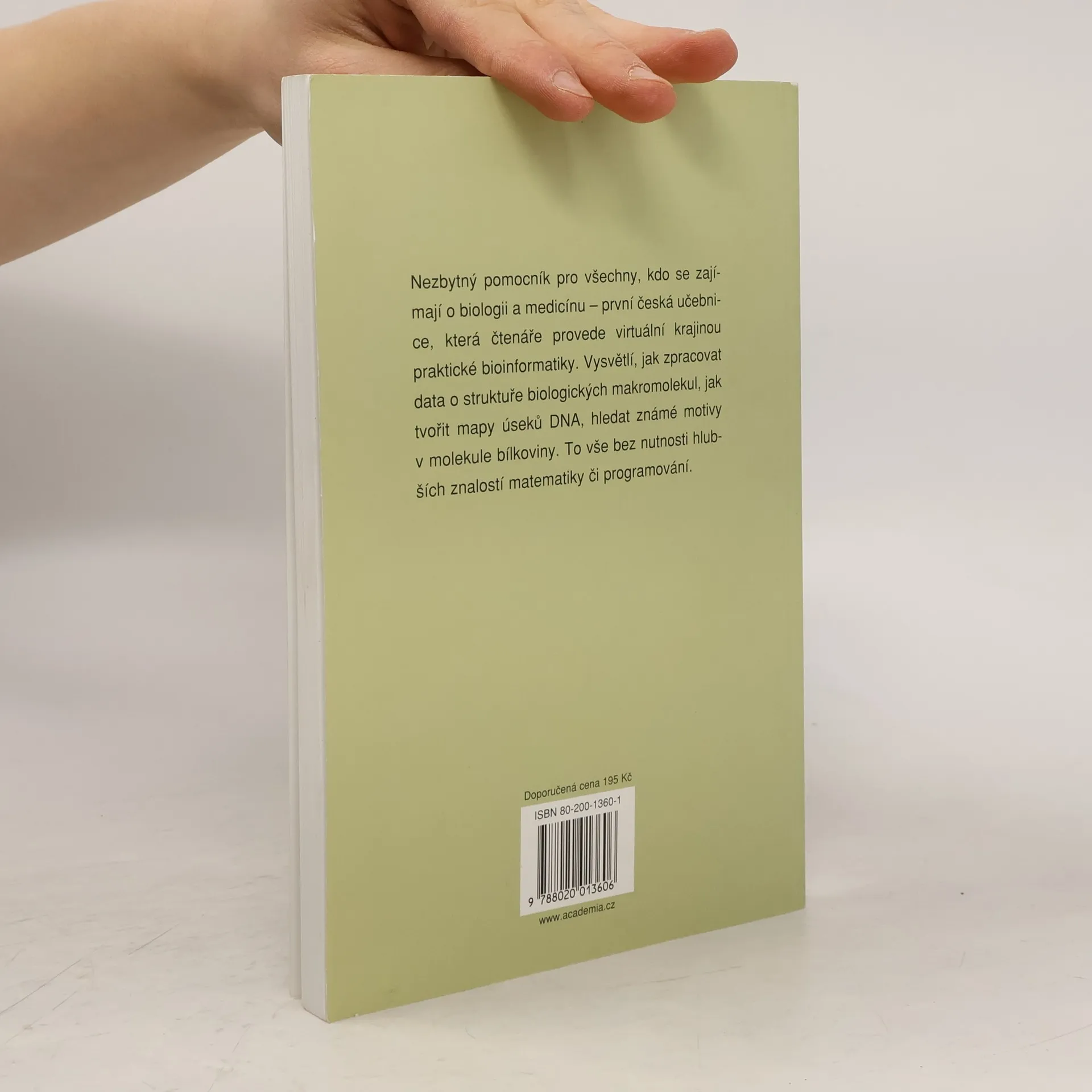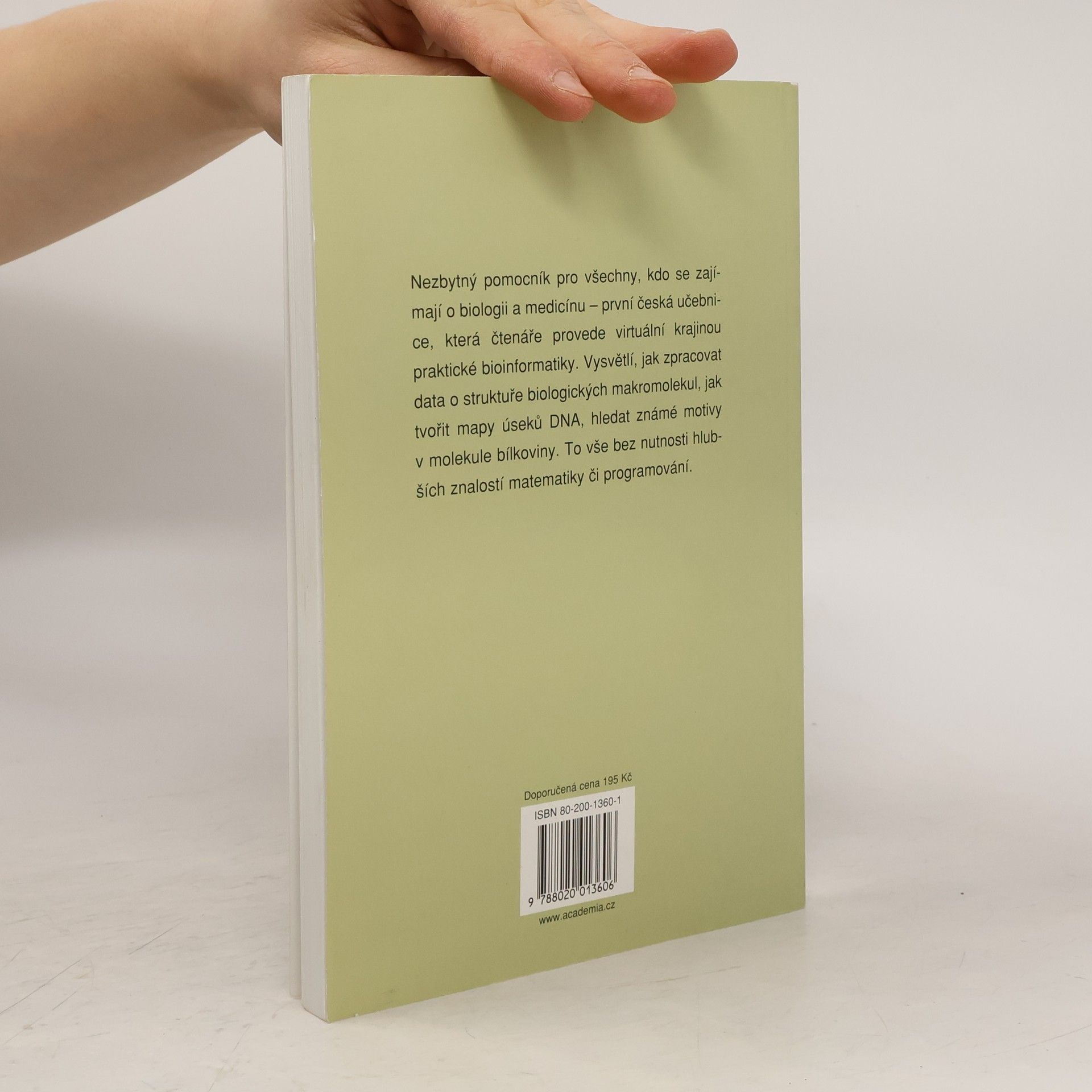 Bioinformatika – obor na pomezí biologie a informatiky – se zabývá především zpracováním dat o sekvenci a struktuře biologických makromolekul. V češtině dosud žádná učebnice bioinformatiky neexistovala a ani ve světě není obdobných publikací mnoho. Kniha si klade za cíl zprostředkovat čtenáři počáteční poučení a být mu průvodcem při prvních krocích virtuální krajinou praktické bioinformatiky. Pokrývá běžné úlohy z molekulárně biologické laboratorní praxe (například konstrukce map úseků DNA, návrh primerů pro PCR, hledání známých sekvenčních či strukturních motivů v molekule proteinu,…) a bude tak cennou příručkou pro studenty biologie i medicíny. Text je koncipován tak, aby nevyžadoval hlubší znalosti matematiky či programování.