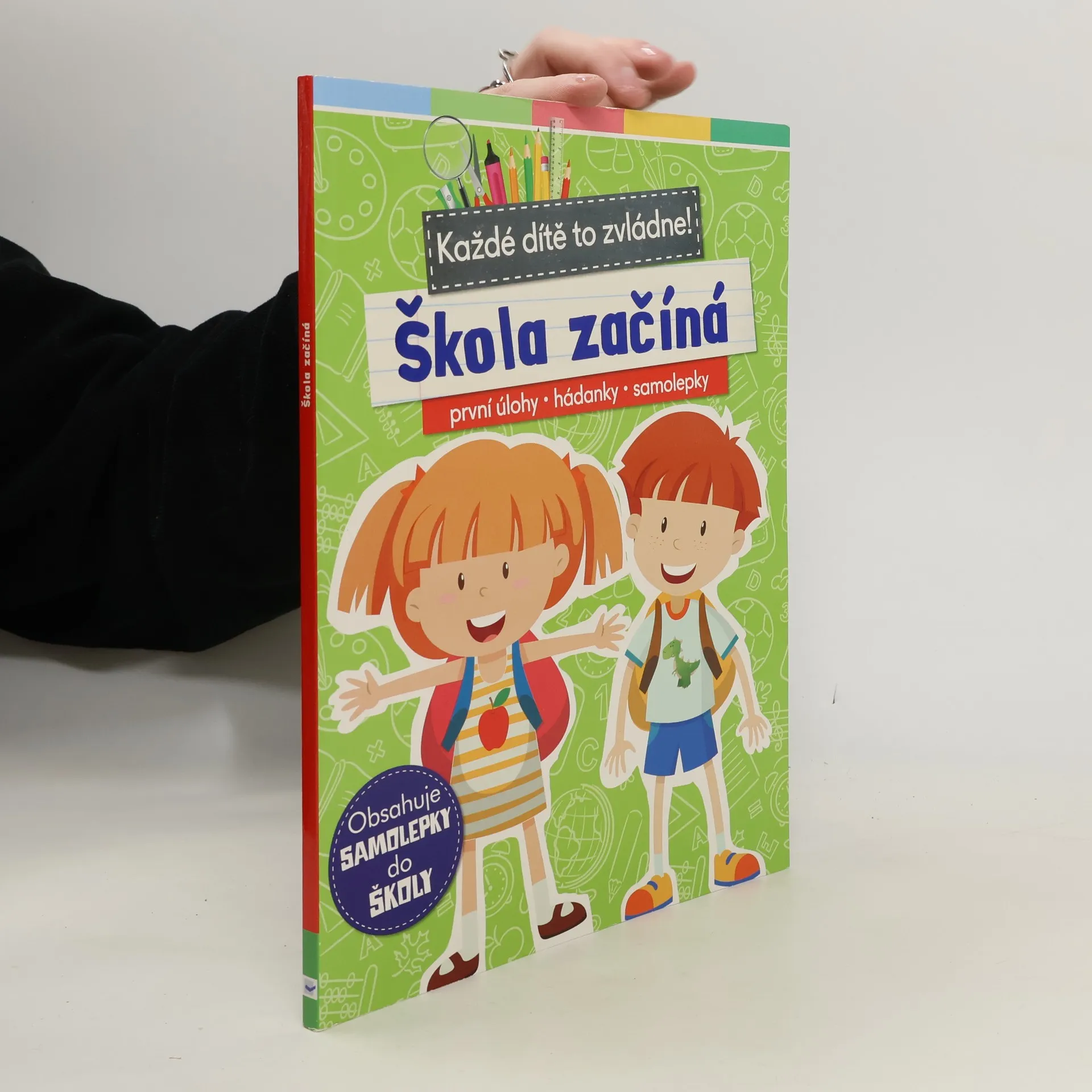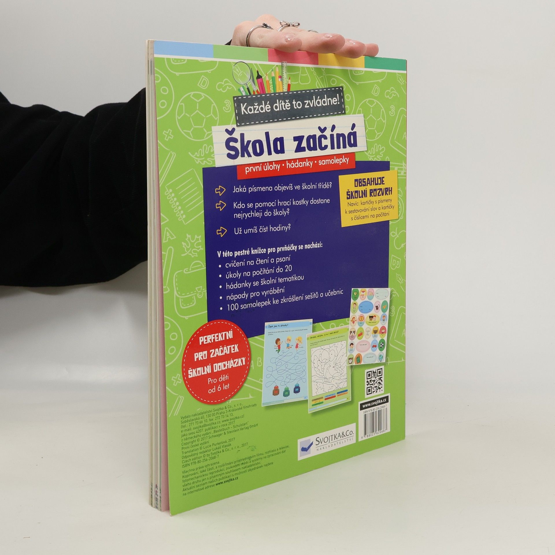 Crrr! Zvoní! Je první školní den, hodina začíná... Jaká písmena se v lavicích naučíš? Už umíš určovat čas z hodin? Zahraj si o přestávce hru a zjisti pomocí kostky, kdo se dostane do školy první. Vyhraj si s vtipnými samolepkami a ozdob si obaly na sešity a učebnice. V této pestré knížce pro prvňáčky se nachází: cvičení na čtení a psaní, úkoly na počítání do 20, hádanky se školní tematikou, nápady na vyrábění, 100 samolepek ke zkrášlení sešitů a učebnic. Obsahuje i školní rozvrh, navíc kartičky s písmeny k sestavování slov a kartičky s číslicemi na počítání. Je to perfektní tvořivá knížka pro děti, které právě začínají svou školní docházku.