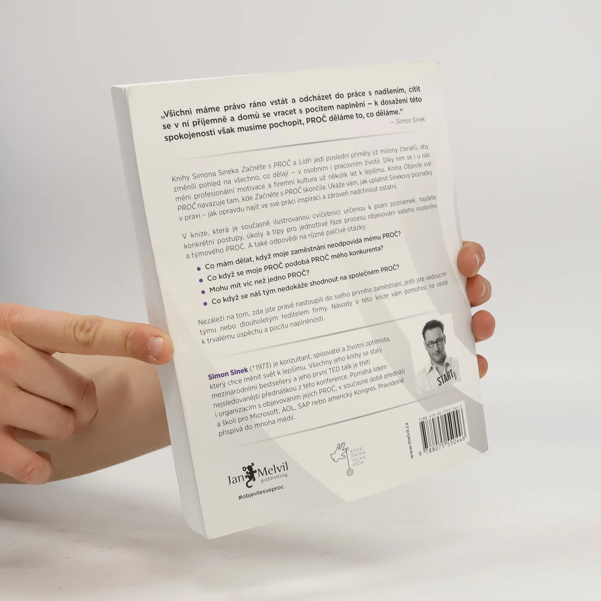 Simona Sinka již znáte, jeho kniha Začněte s PROČ přiměla miliony čtenářů změnit pohled na osobní život, kariéru i organizaci. Společně s Lídři jedí poslední posouvá firemní kulturu, motivaci zaměstnanců a spokojenost k lepšímu. Kniha Objevte své PROČ navazuje na předchozí dílo a ukazuje, jak aplikovat Sinekovy poznatky v praxi, abyste našli inspiraci ve své práci a inspirovali ostatní. Simon Sinek věří, že spokojenost je právem, nikoliv privilegiem. Každý by měl mít možnost probouzet se s nadšením, cítit se v práci bezpečně a odcházet s pocitem uspokojení. Dosažení spokojenosti úzce souvisí s pochopením, PROČ děláme to, co děláme. Kniha nabízí konkrétní postupy, cvičení, ilustrace a tipy pro jednotlivé fáze procesu. Odpovídá na důležité otázky, jako například: Co když se moje PROČ podobá PROČ mého konkurenta? Mohu mít víc než jedno PROČ? Co dělat, když moje zaměstnání neodpovídá mému PROČ? Co když se náš tým nedokáže shodnout na společném PROČ? Bez ohledu na to, zda jste na začátku kariéry, vedoucím týmu nebo ředitelem firmy, návody a cvičení v této knize vám pomohou na cestě k dlouhodobému úspěchu a pocitu naplněnosti.