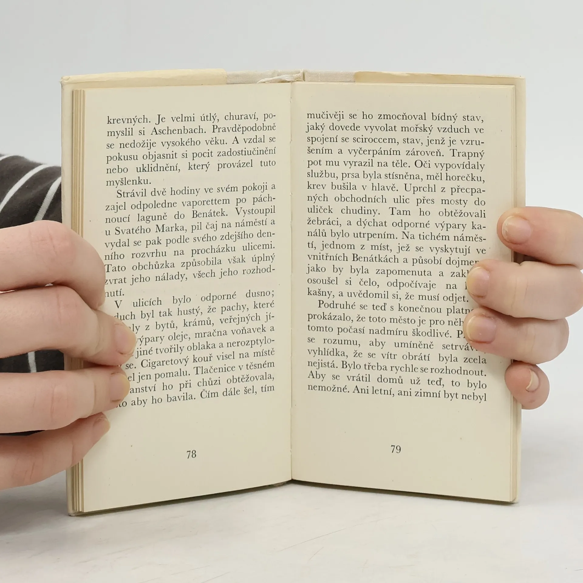 Novela z r. 1913, která eticky a esteticky končí jedno údobí autorova vývoje, řeší problém harmonie ducha a smyslů, krásy mravní a estetické. Stárnoucí spisovatel, který se ve svém díle dopracoval k vybroušené, avšak prázdné profesionální dokonalosti a který pěstuje umění odtržené od života, se na zájezdu do Benátek setkává s mladým chlapcem podmanivé svěžesti a toto setkání s kypícím životem vyvolá v něm tvůrčí krizi, jež přechází v jeho smrt duchovní i fyzickou.