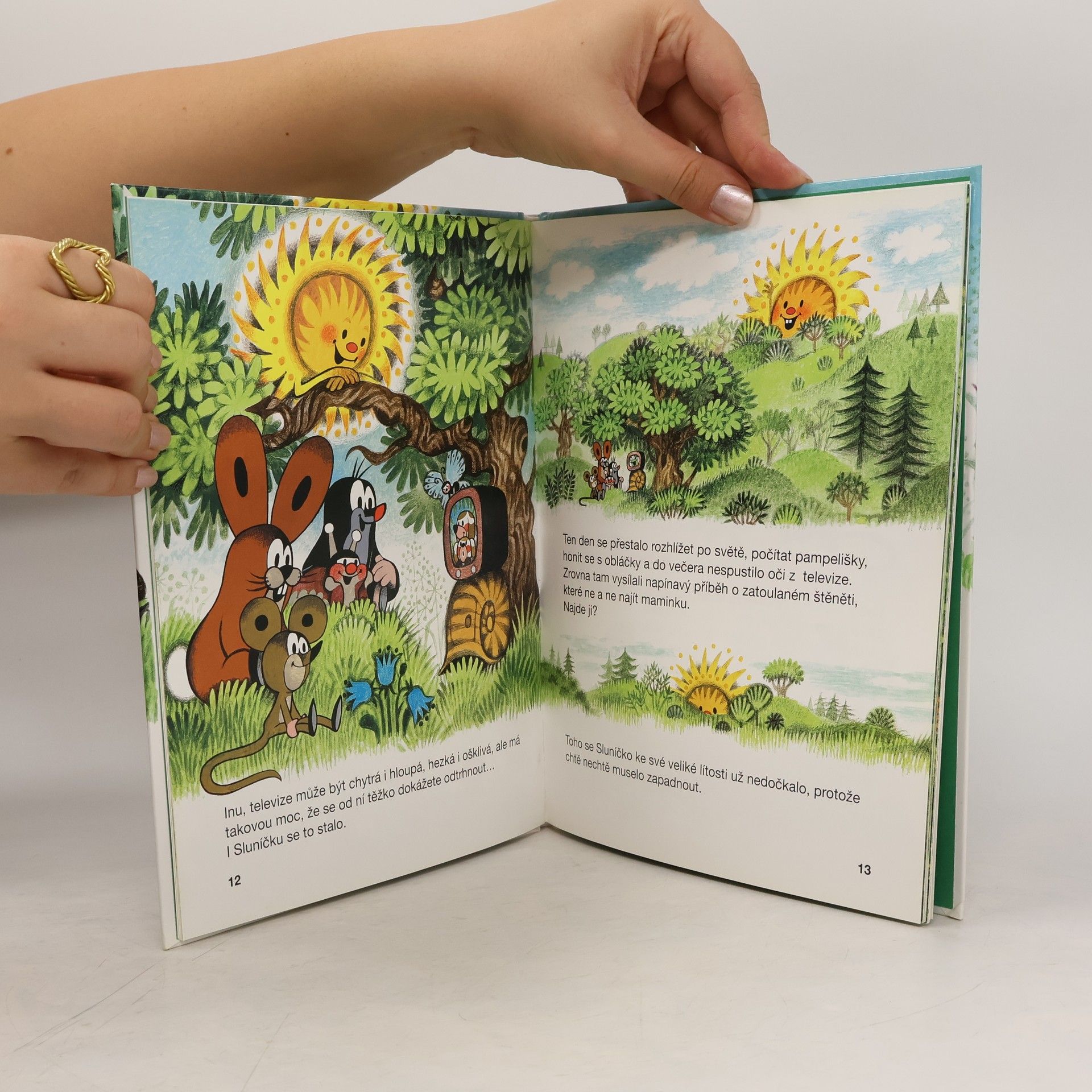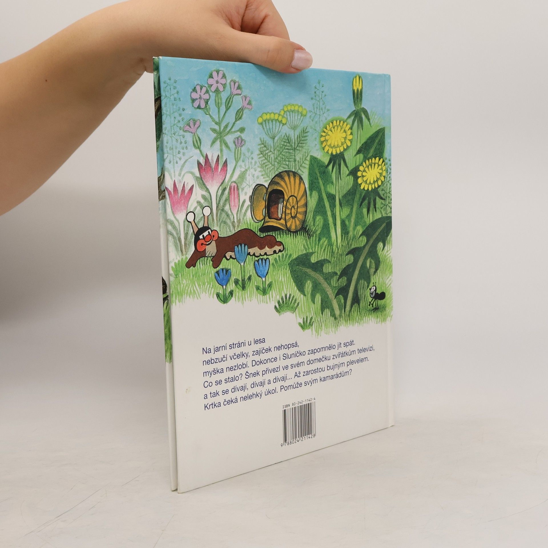 Na jarní stráni u lesa nebzučí včelky, zajíček nehopsá, myška nezlobí. Dokonce i Sluníčko zapomělo jít spát. Co se stalo? Šnek přivezl ve svém domečku zvířátkům televizi, a tak se dívají, dívají a dívají... Až zarostou bujným plevelem. Krtka čeká nelehký úkol. Pomůže svým kamarádům?