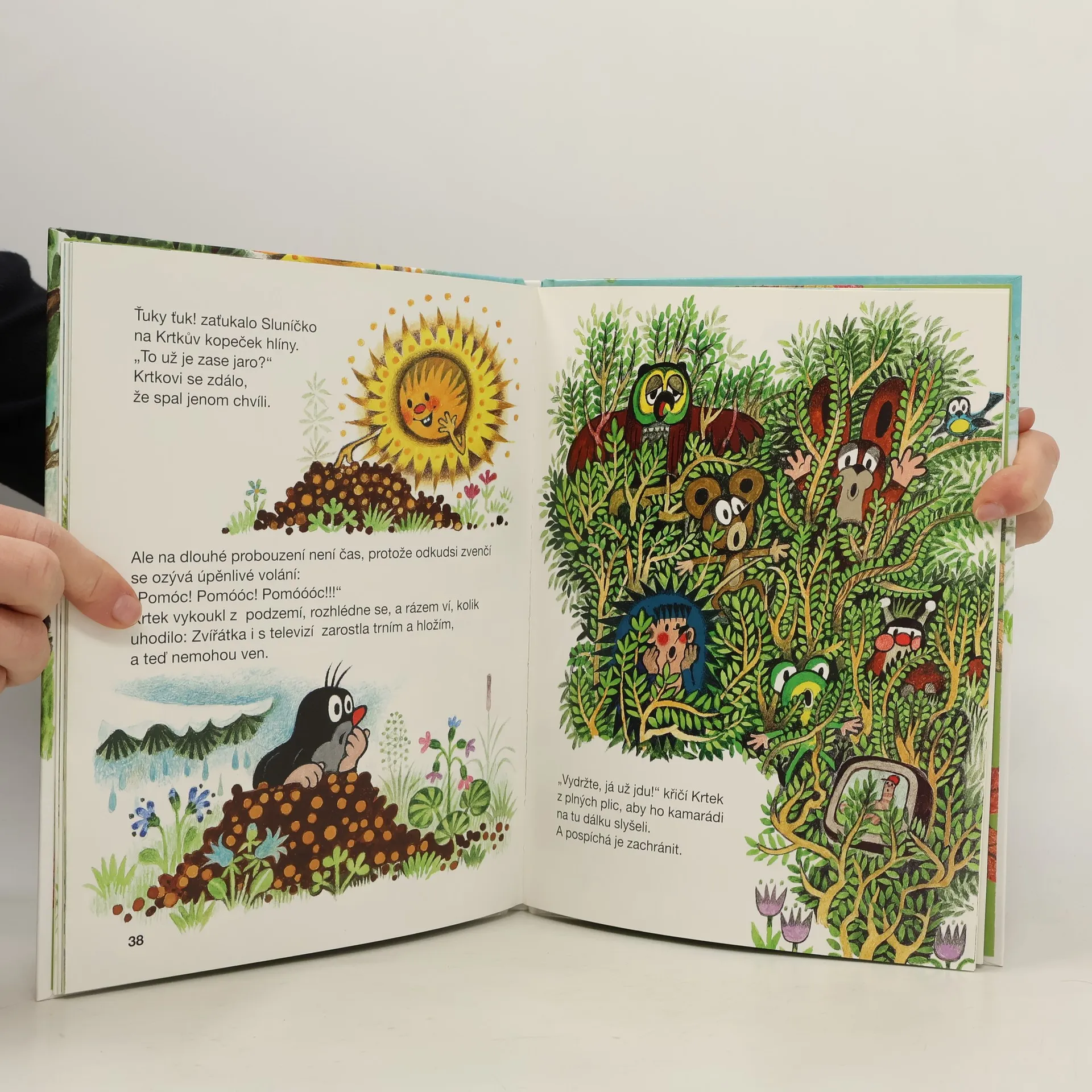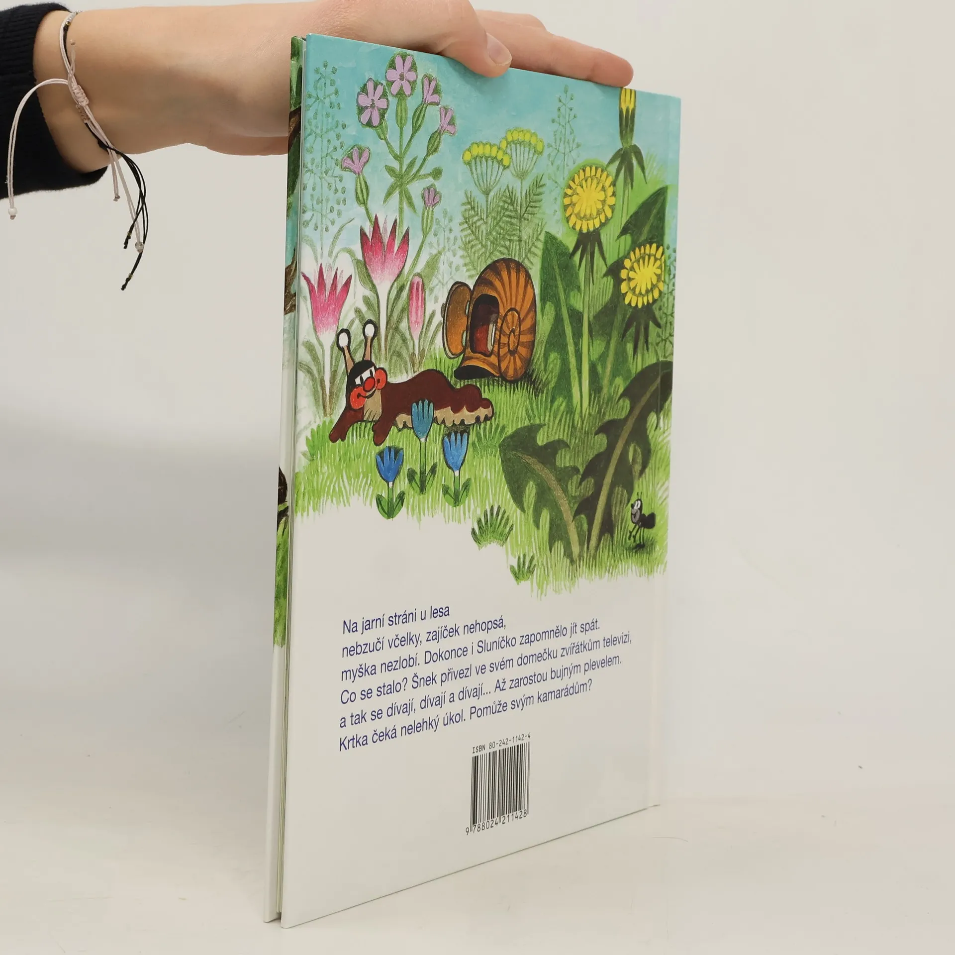 Na jarní stráni u lesa nebzučí včelky, zajíček nehopsá, myška nezlobí. Dokonce i Sluníčko zapomělo jít spát. Co se stalo? Šnek přivezl ve svém domečku zvířátkům televizi, a tak se dívají, dívají a dívají... Až zarostou bujným plevelem. Krtka čeká nelehký úkol. Pomůže svým kamarádům?