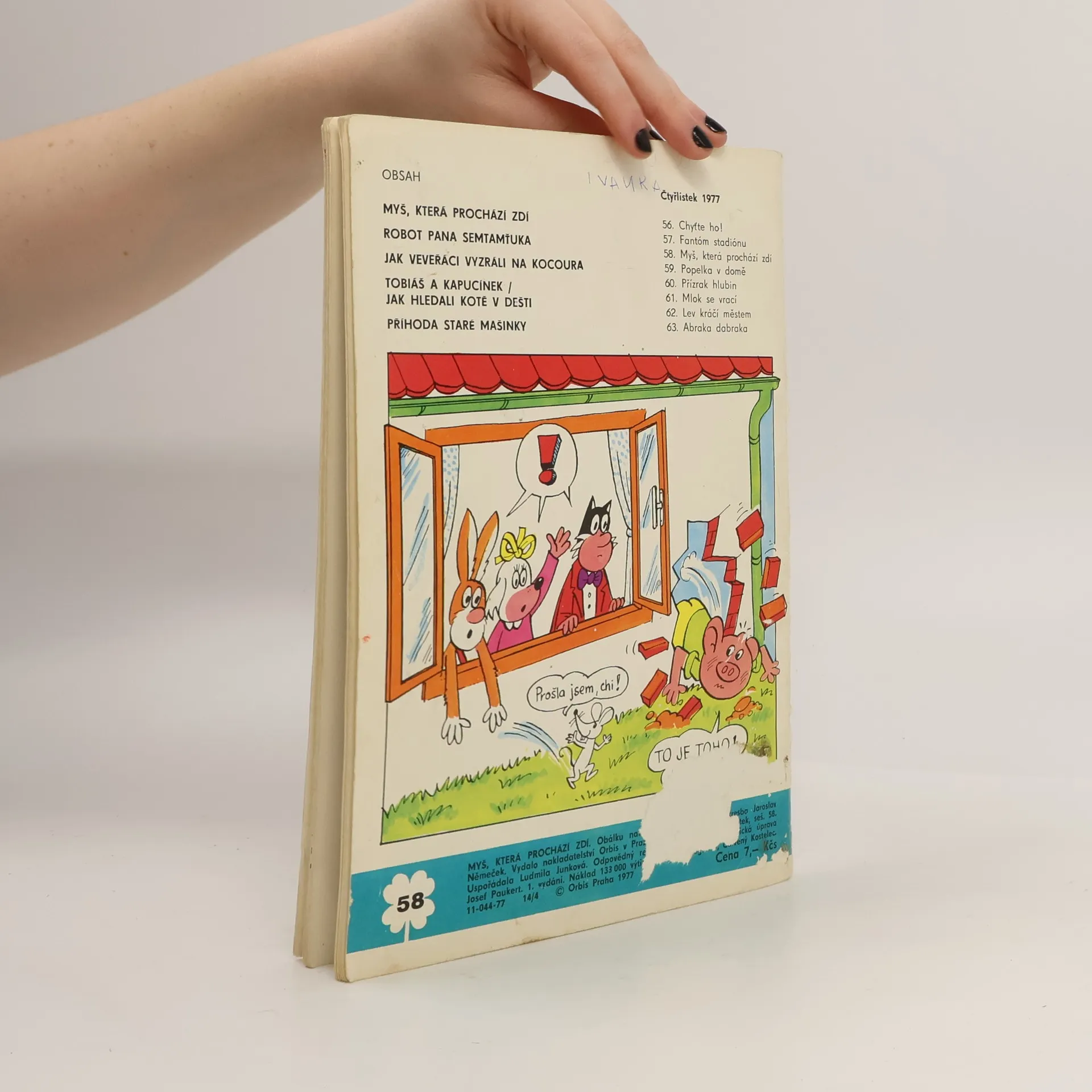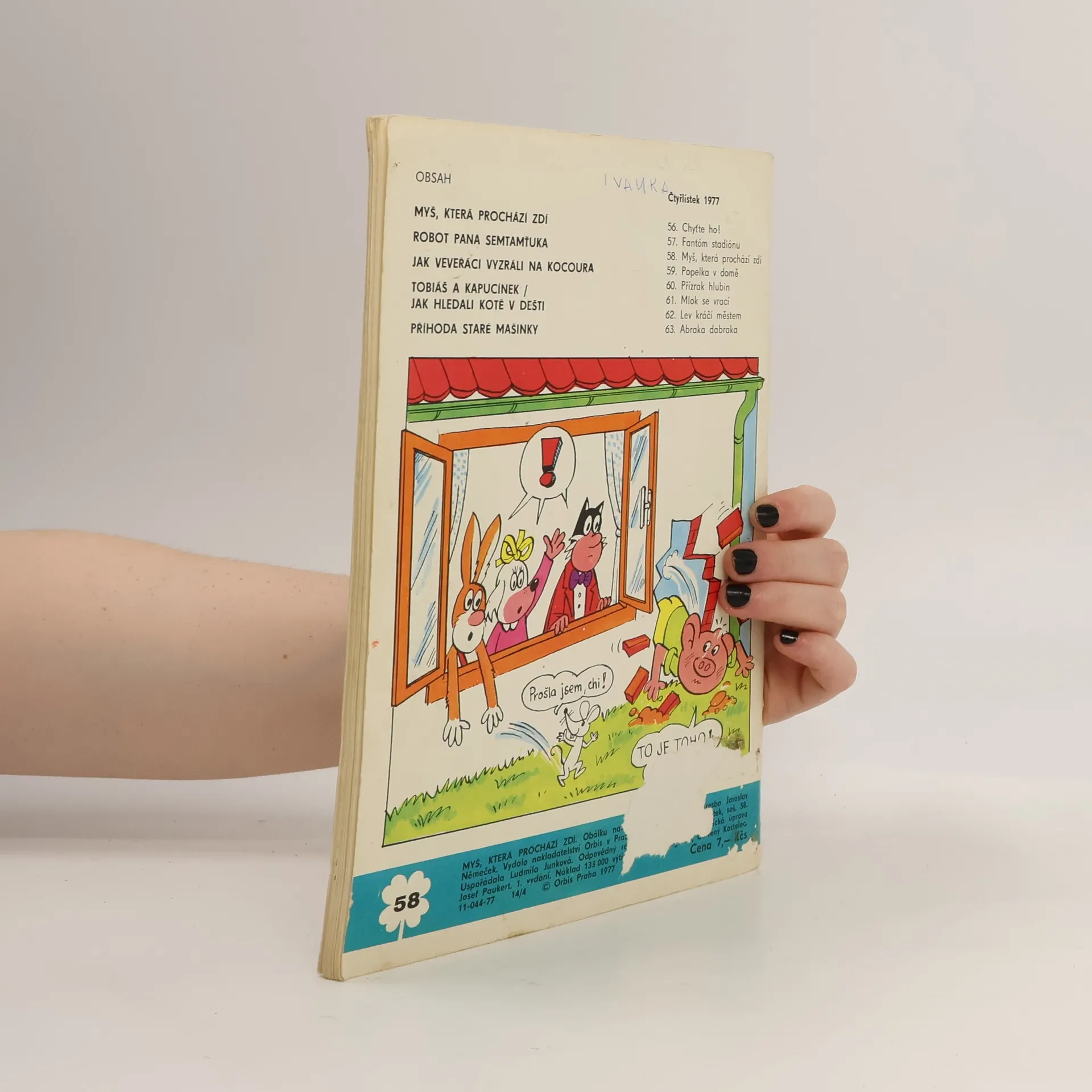 58. díl série Čtyřlístek : Myš, která prochází zdí - Ljuba Štíplová, Jaroslav Němeček. Robot pana Semtamťuka - Svatopluk Hrnčíř, Adolf Born. Veveřáci - Jak vyzráli na kocoura - Ladislav Čapek. Tobiáš a Kapucínek - Jak hledali kotě v dešti - Jarmila Čermáková, Zdeňka Krejčová.Příhoda staré mašinky - Ludmila Kolářová, Karel Franta.