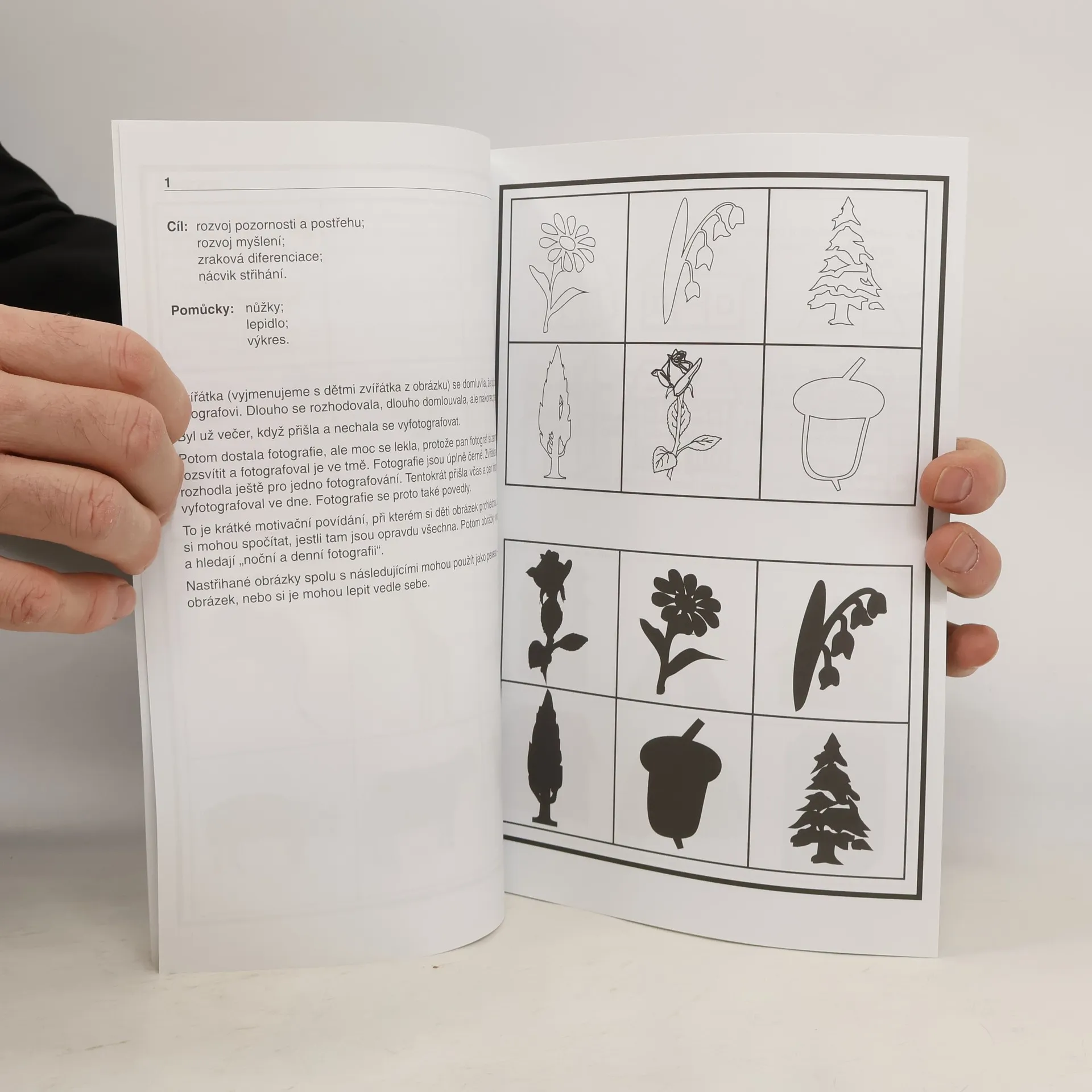 Rozvoj pozornosti, cvičení postřehu, zraková diferenciace, rozvoj myšlení. Grafomotofické tvary, rozlišování základních geometrických tvarů, procvičování zrakové syntézy a analýzy.