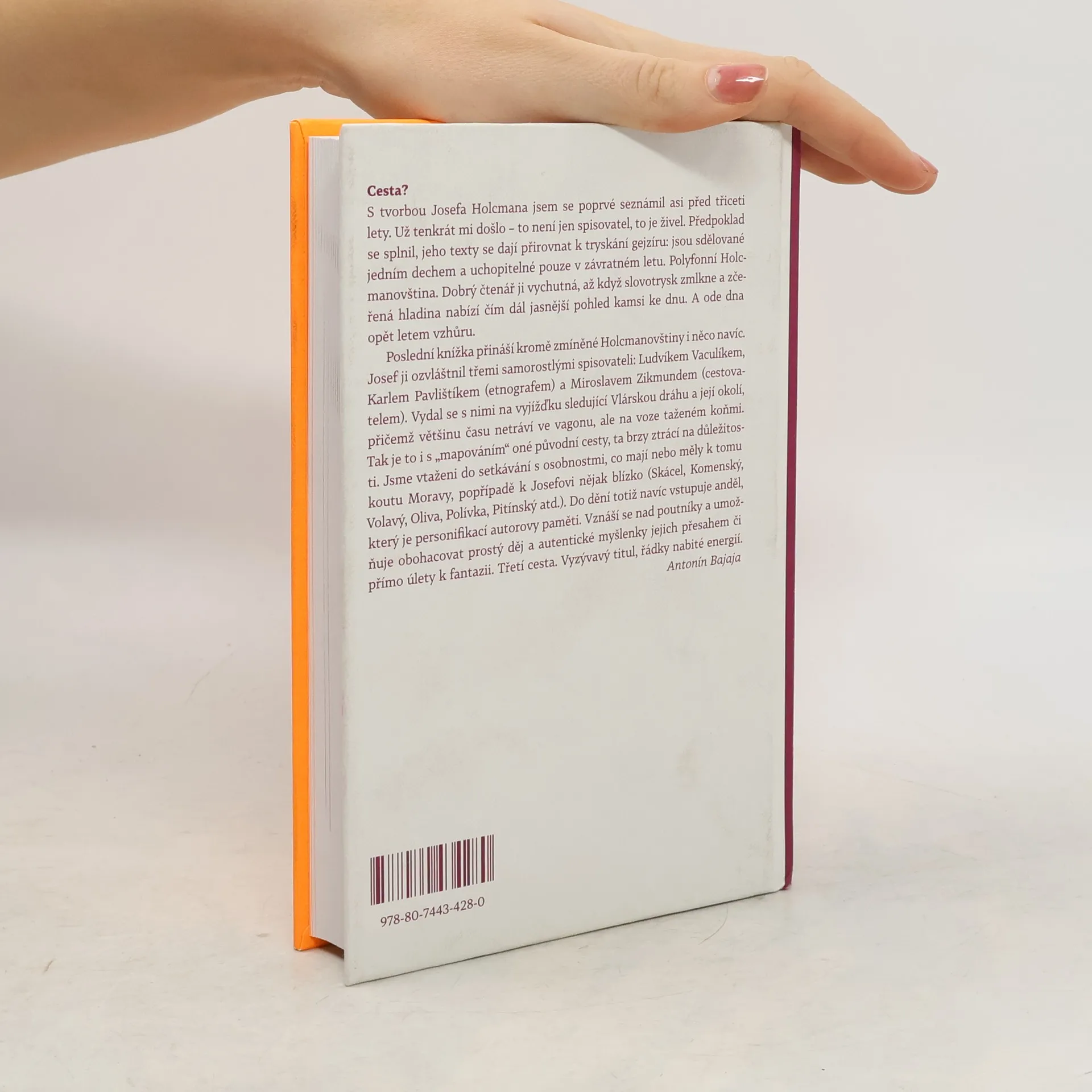 S tvorbou Josefa Holcmana jsem se poprvé seznámil asi před třiceti lety. Už tenkrát mi došlo – to není jen spisovatel, to je živel. Předpoklad se splnil, jeho texty se dají přirovnat k tryskání gejzíru: jsou sdělované jedním dechem a uchopitelné pouze v závratném letu. Polyfonní Holcmanovština. Dobrý čtenář ji vychutná, až když slovotrysk zmlkne a zčeřená hladina nabízí čím dál jasnější pohled kamsi ke dnu. A ode dna opět letem vzhůru. Poslední knížka přináší kromě zmíněné Holcmanovštiny i něco navíc. Josef ji ozvláštnil třemi samorostlými spisovateli: Ludvíkem Vaculíkem, Karlem Pavlištíkem (etnografem) a Miroslavem Zikmundem (cestovatelem). Vydal se s nimi na vyjížďku sledující Vlárskou dráhu a její okolí, přičemž většinu času netráví ve vagonu, ale na voze taženém koňmi. Tak je to i s „mapováním“ oné původní cesty, ta brzy ztrácí na důležitosti. Jsme vtaženi do setkávání s osobnostmi, co mají nebo měly k tomu koutu Moravy popřípadě k Josefovi nějak blízko (Skácel, Komenský, Volavý, Oliva, Pitínský, Polívka, Pivečka atd.). Do dění totiž navíc vstupuje Anděl, který je personifikací autorovy paměti. Vznáší se nad poutníky a umožňuje obohacovat prostý děj a autentické myšlenky jejich přesahem či přímo úlety k fantazii. Třetí cesta. Vyzývavý titul, řádky nabité energií. Antonín Bajaja